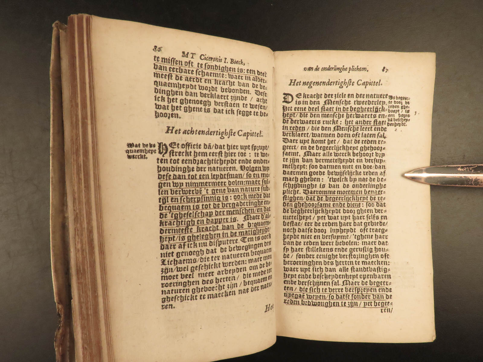 A rare, 17th-century Dutch translation of the essays of Cicero. It includes four of Cicero’s most famous works including his dialog on Cato the Elder On Old Age, Paradoxa Stoicorum, and De Amicitia. Each is a treatise, or short writing, on various aspects of life: