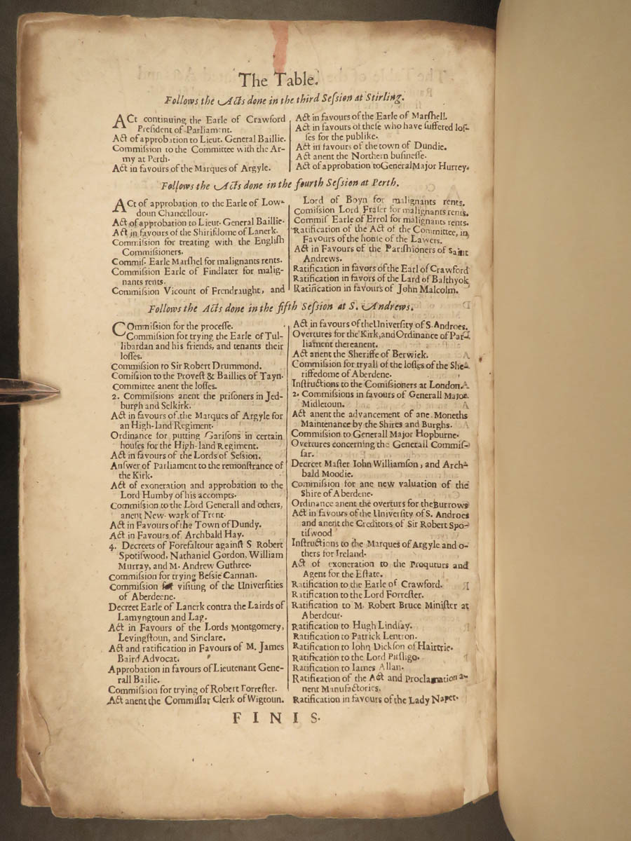 From the 16th-century through the 18th-century, numerous examples of Scotland’s “Laws and Acts of Parliament” were published. This particular tome contains the political, theological, and governmental discussions and letters discussed in the Second Parliament. Notable acts include laws and acts through 1646:
