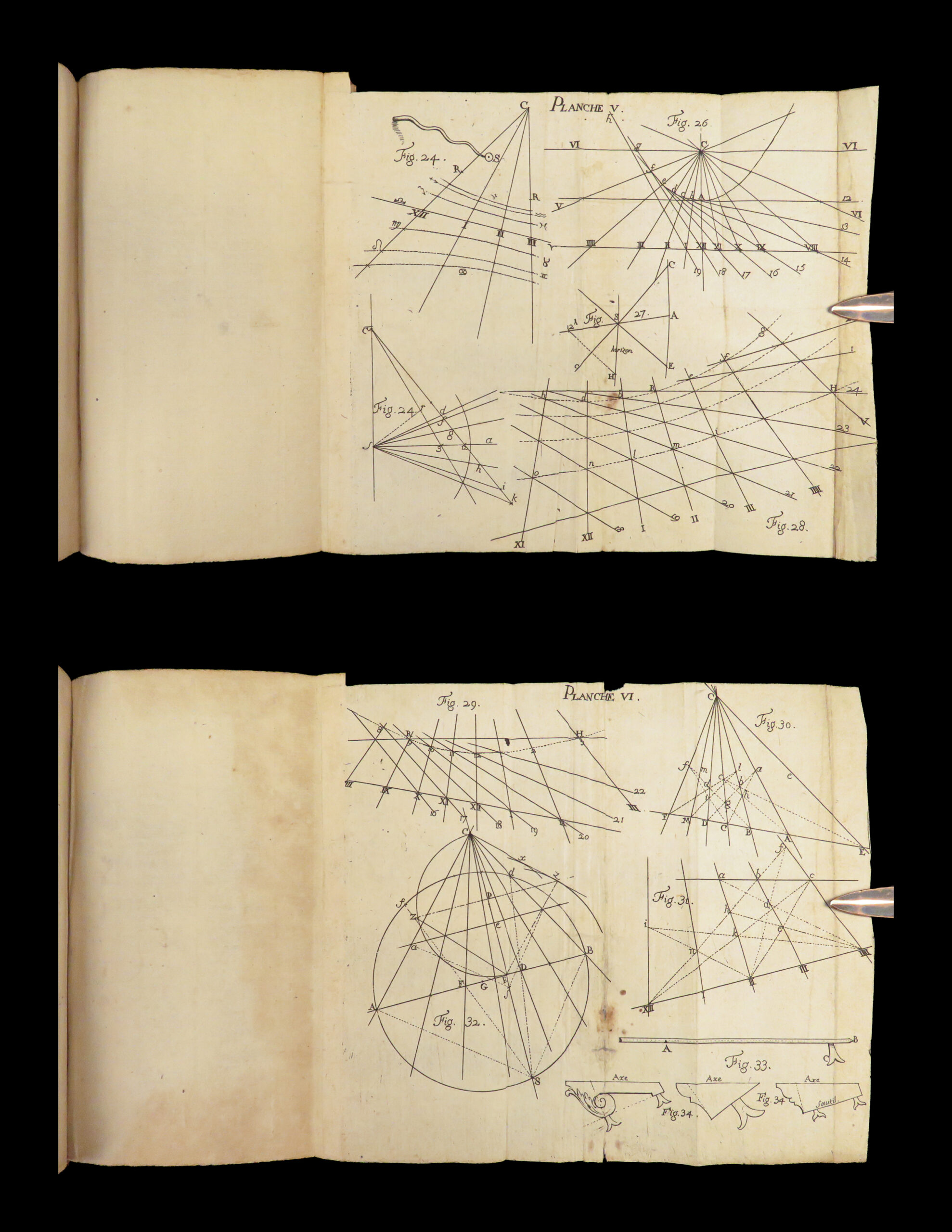 While studying astronomy at the French Academy of Sciences, Hire took a fascination in the movements and phases of the Sun, Moon, and other celestial bodies. He took an interest in the processes in making sundials and published his book on the subject in 1682. This first edition of Hire’s “Gnomonics” includes folding engravings and full-page charts and tables.