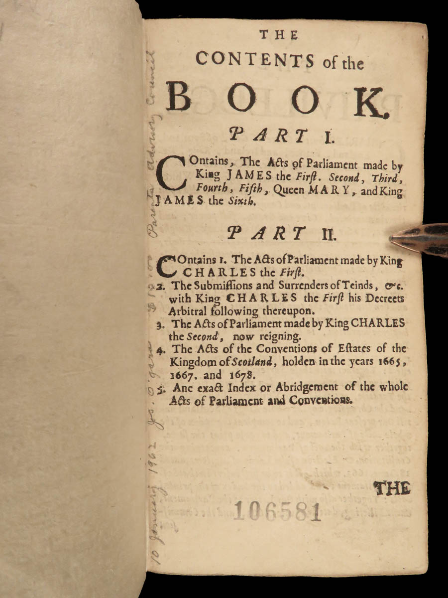 Thomas Murray’s ‘Laws and Acts of Parliament’ is a rare 17th-century collection of legal proceedings and laws enacted in Scotland beginning in 1424 through the early 18th-century and the Act of Union merging England and Scotland as Great Britain.