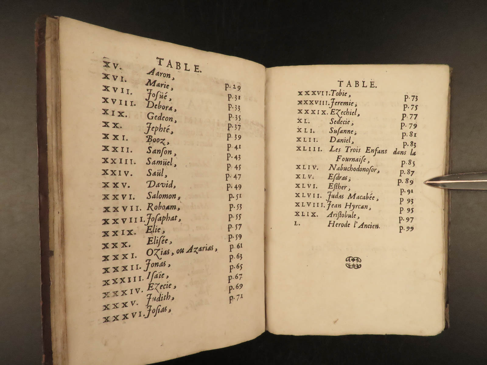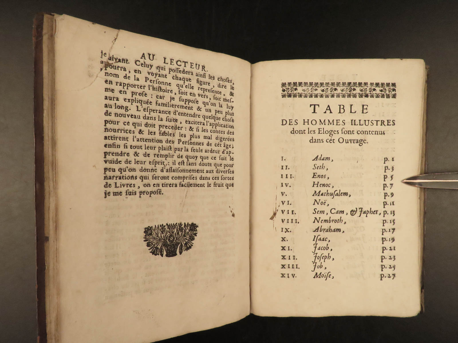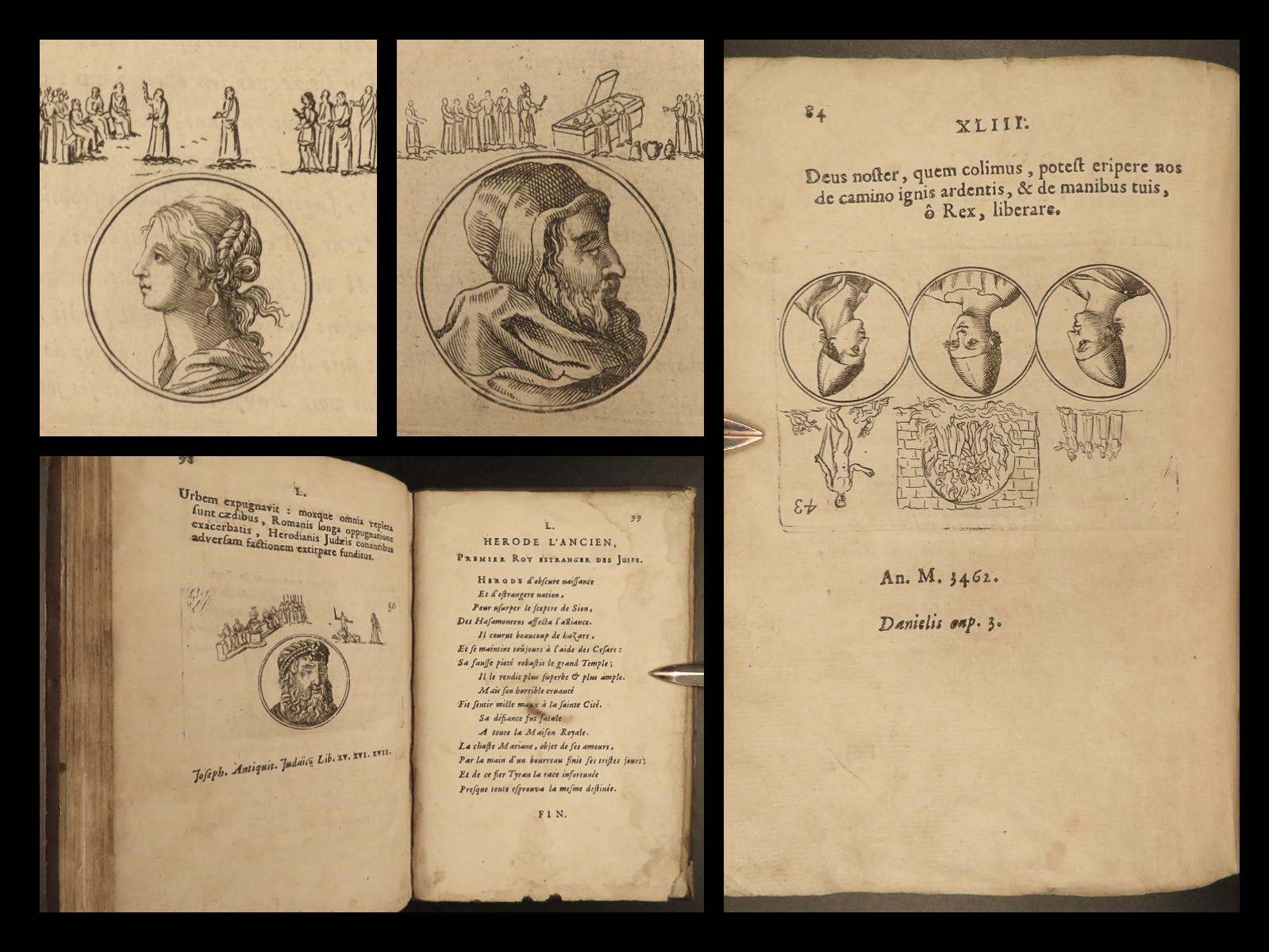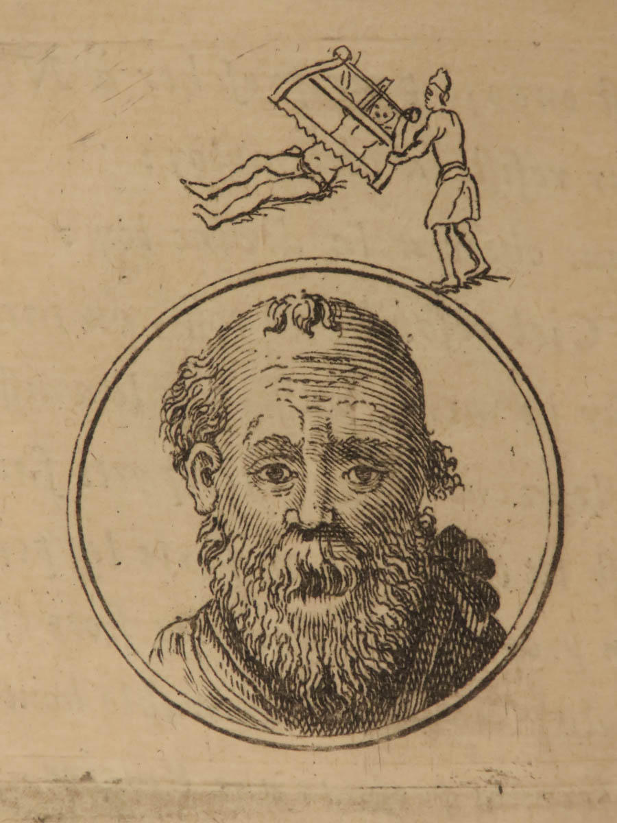 Jean Doujat was a 17th-century French lawyer known for his studies in canonic law. In addition to his law career, Doujat wrote a book on the history of Old Testament figures such as Adam, Methuselah, Nimrod, Isaac, Job, Debora, Samson, David, and Isaiah. Each entry features a small woodcut engraving – a portrait of the biblical character.
