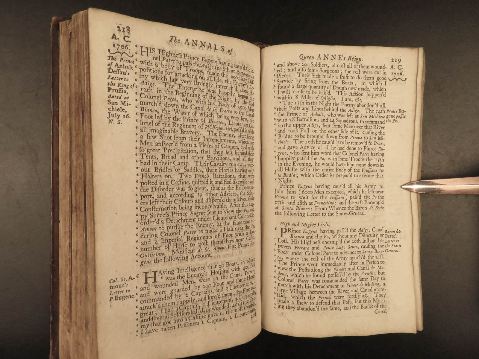 Abel Boyer was a 17th-century English historian who is regularly remembered for his account of the life and reign of Queen Anne of England. It was in his ‘History of Queen Anne’ that he describes proceedings in British Parliament, royal speeches, as well as political debates. This 1707 ‘anonymous’ edition is still credited to Boyer; however, according to the ESTC it was edited and collected by an author simply named Gibson. This work is without question one of the best 18th-century examples of biographies of Queen Anne, especially considering the inclusion of commentary on the political and diplomatic state of England from the Reformation through the fifth year of Anne’s reign, 1707.