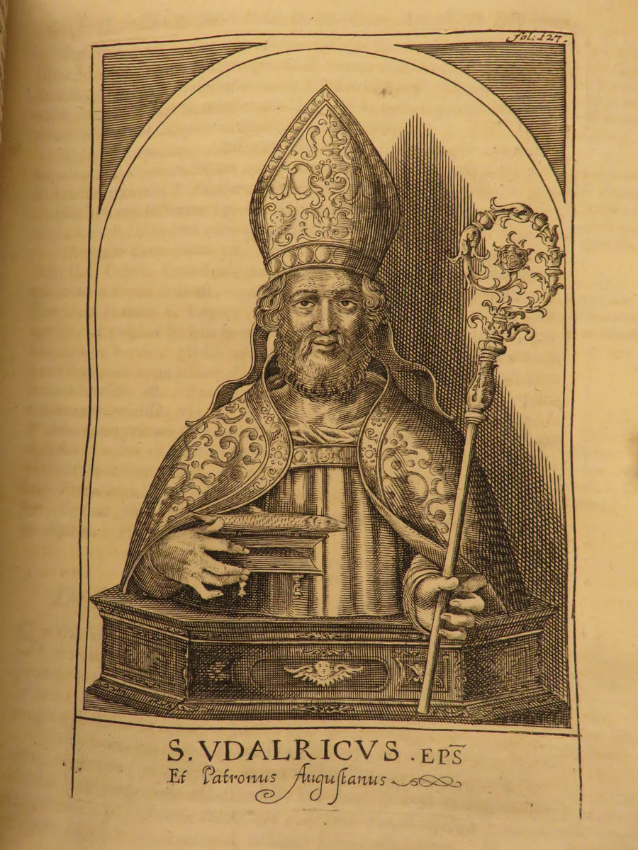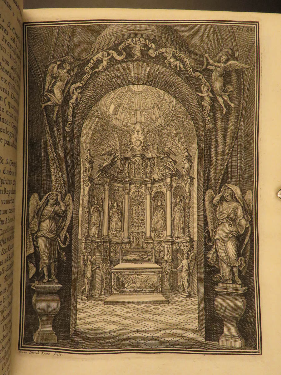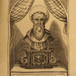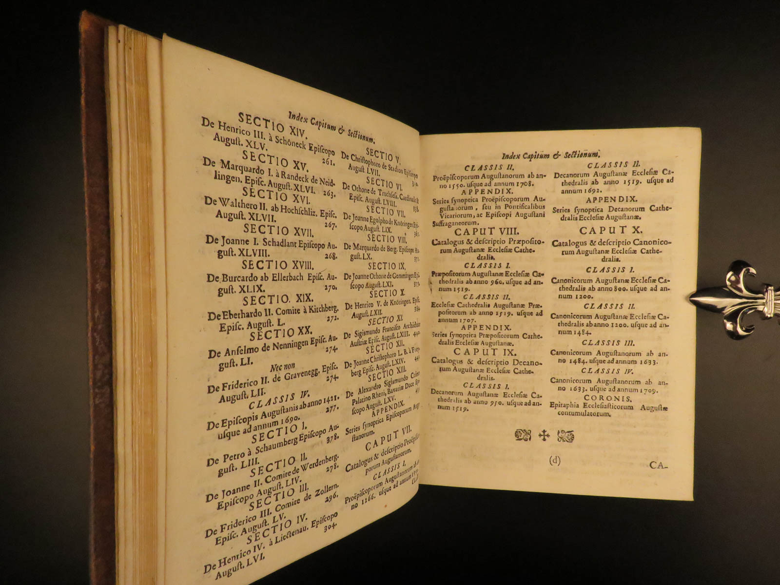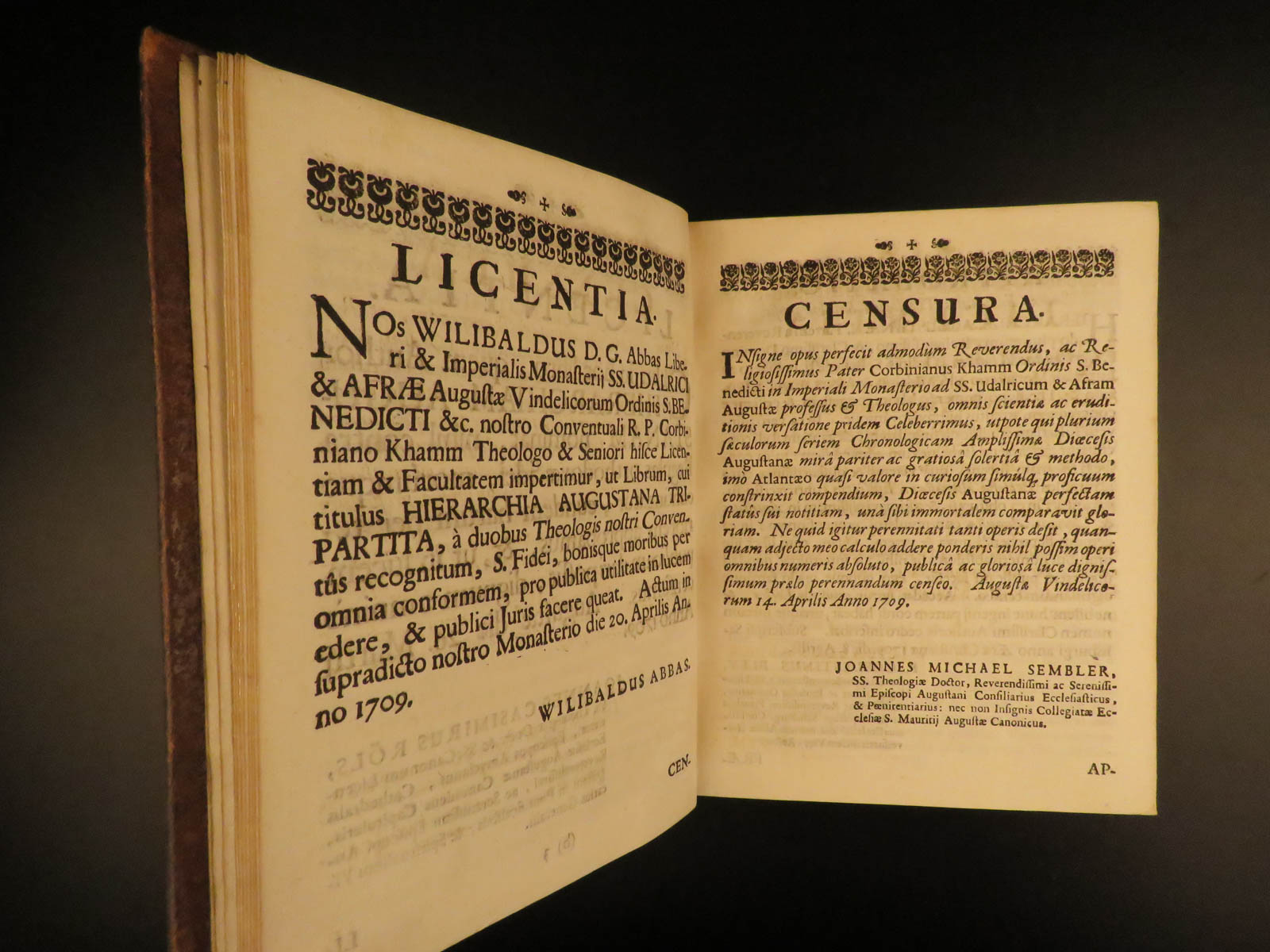 Corbinian Khamm was a 17th-century Benedictine monk of St. Ulrich, who is best remembered for his magnum opus ‘Hierarchia Augustana’. This enormous work is a chronological history of Augsburg focusing on cathedrals, colleges, origins, and church and political history. This first volume, which was published in 1709, deals with the history of cathedrals and ecclesiastical history. Also included are 21 full-page engravings.
