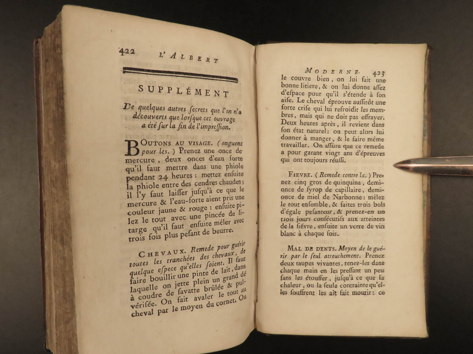 L’Albert moderne, ou, Nouveaux secrets, éprouvés et licites, recueillis d’après les découvertes les plus récentes : les uns ayant pour objet de remédier à un grand nombre d’accidents qui intéressent la santé : les autres, quantité de choses utiles à savoir pour les différents besoins de la vie : d’autres enfin, tout ce qui concerne le pur agrément, tant aux champs qu’ à la ville : le tout divisé en trois parties, & rangé par ordre alphabetique