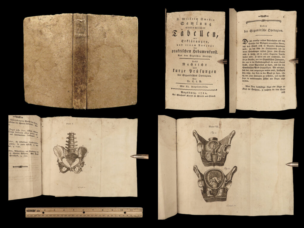 1782 obstetrics & pregnancy smellie female anatomy 40 plates medicine surgery |   william smellie was an 18<sup>th</sup>-century scottish physician best-known for his practice in obstetrics. Smellie’s “<em>set of anatomical tables</em>” was his most important contribution to obstetrics – a fascinating collection of drawings of female anatomy and reproductive system. It also illustrations the birth process, pregnancy, surgical tools, and much more.   this 1782 german edition was published in augsburg and features 40 folding engravings!