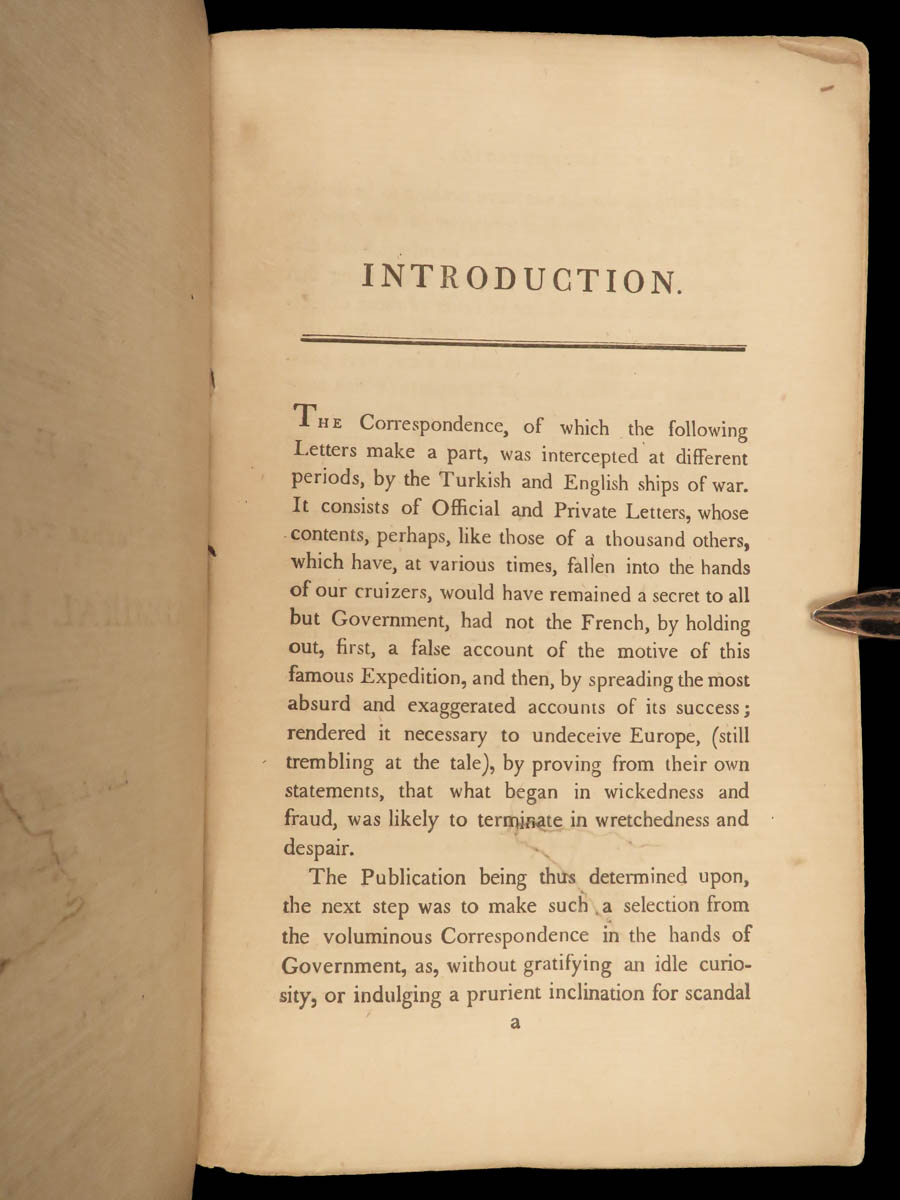 Early in the Napoleon Wars, the British Navy, led by Lord Horatio Nelson, intercepted French intelligence and seized numerous letters detailing motives and direction of the French army. These letters were published as a strong piece of anti-French propaganda and served as an affront to the French campaign in Egypt.