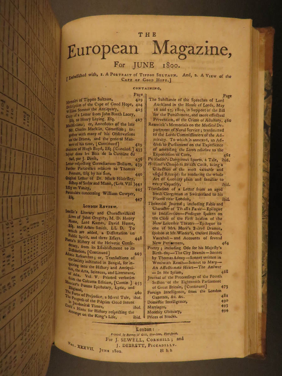 The European Magazine, and London Review, Containing the Literature, History, Politics, Arts, Manners & Amusements of the Age. Vol: 37. From Jany. To June 1800. Containing Portraits, Views, Biography, Anecdotes, Literature, History, Politics, Arts, Manners & Amusements of the Age. Vol: 38. From July to Dec. 1800