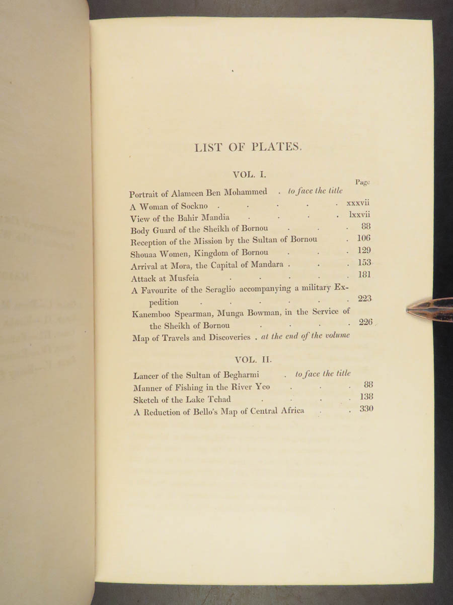 The narrative of Denham and Clapperton’s voyage was published by Murray in a fine, two-volume work filled with impressive full-page engravings depicting local tribes and people groups, culture and dress, architecture, and African landscapes. Note the hand-colored engraving of a desert oasis in this 1826 edition. This edition also includes remarkable folding maps!
