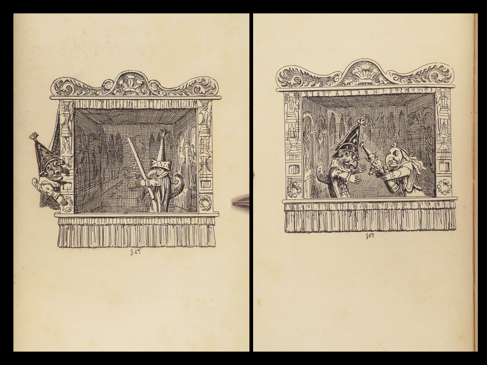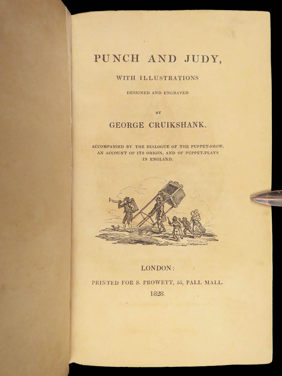A famous script of the historic and iconic British puppet show, ‘Punch and Judy.’ Mr. Punch has been a beloved puppet character in England for over 350 years. John Collier Payne’s script accompanied by the 24 engravings by the esteemed George Cruikshank offers one of the oldest recorded scripts of the tale of the puppet, Mr. Punch and his wife, Judy.