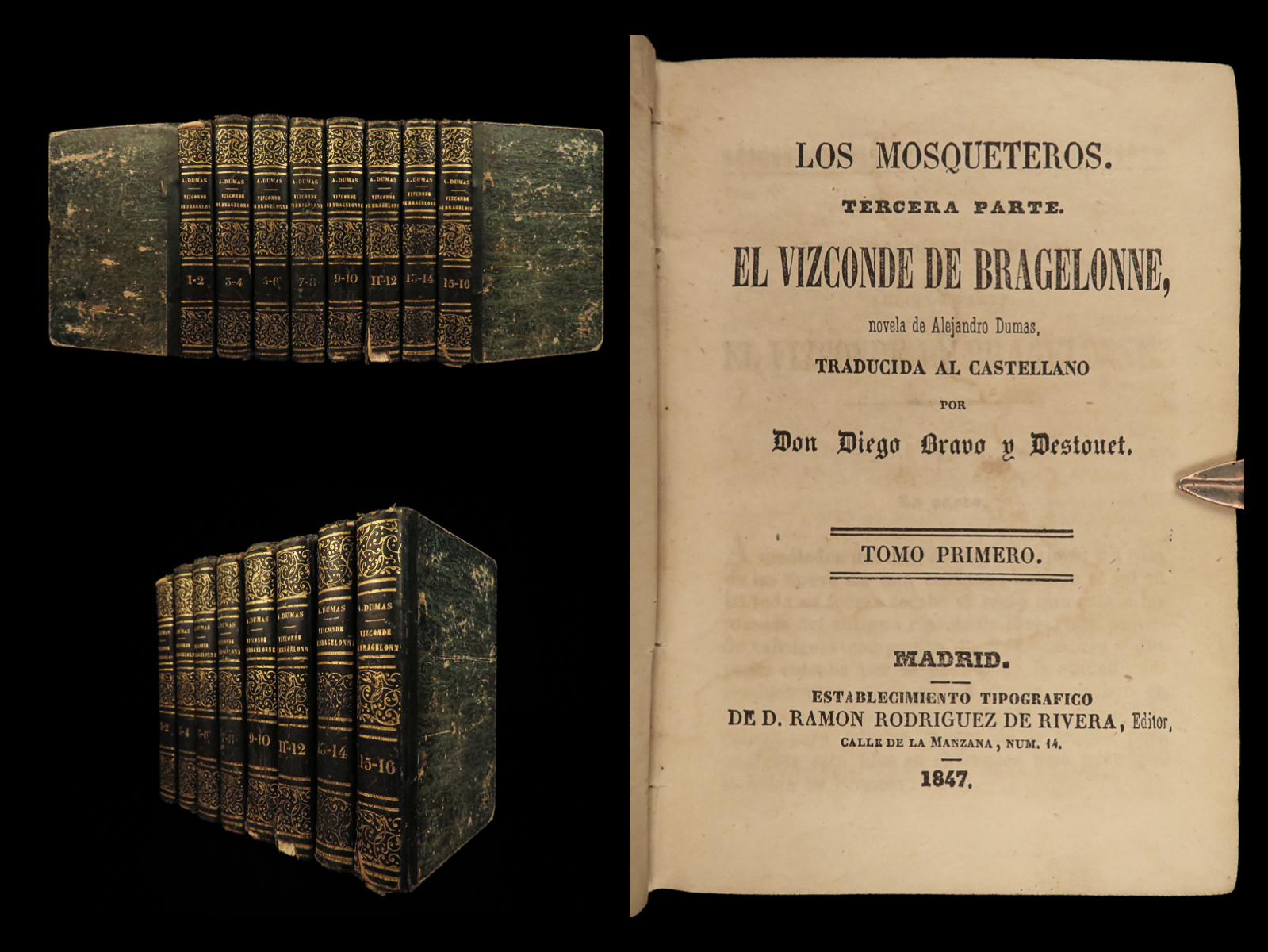This 1847 Spanish edition encompasses the third part of ‘Musketeers’ entitled “The Vicomte of Bragelonne” and was published in Madrid by Ramon Rodriguez de Rivera.
