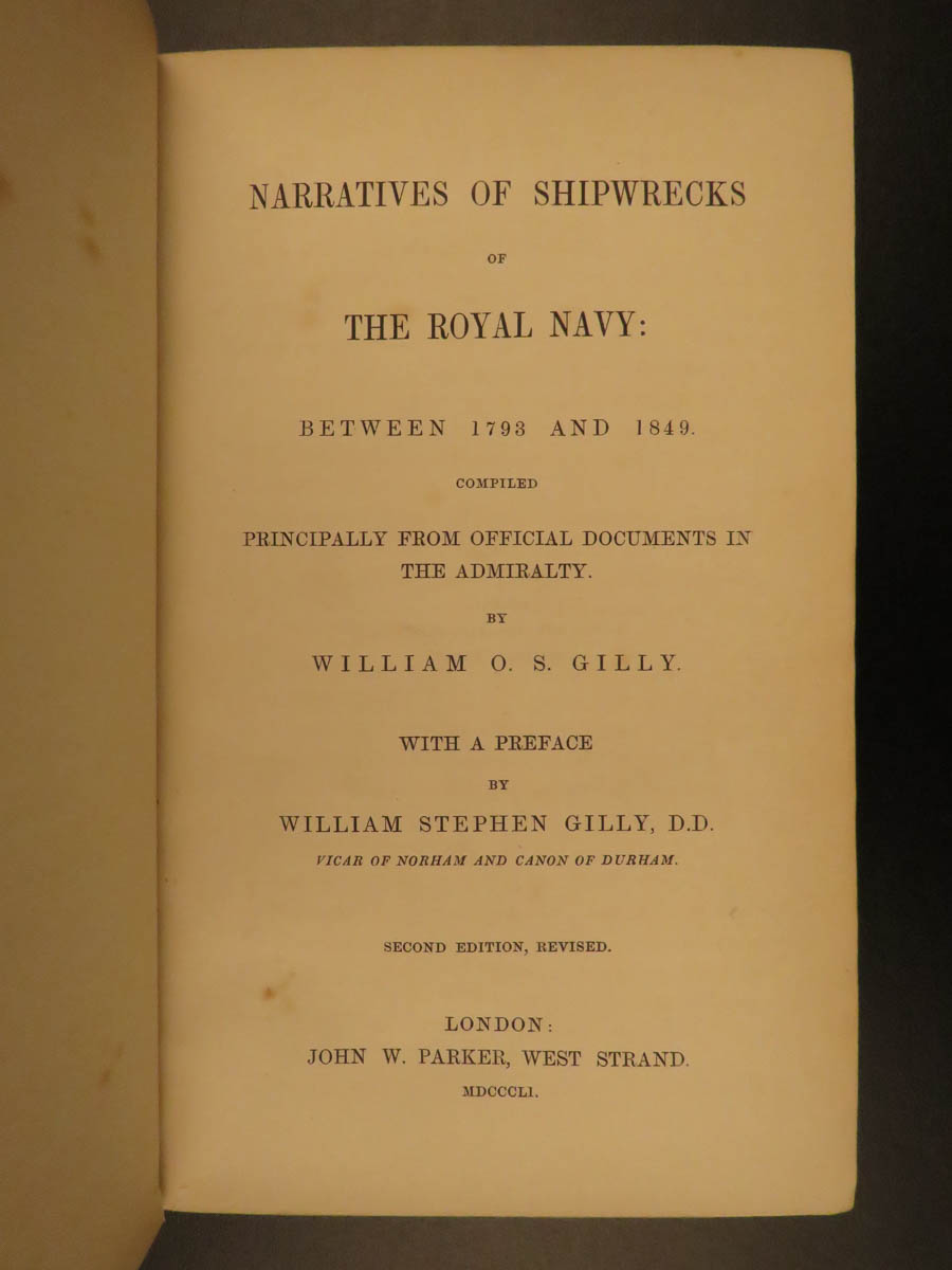 ‘Narratives of Shipwrecks of the Royal Navy’ is a collection of stories of different shipwrecks whose purpose is to depict “the discipline and heroism displayed by British Seamen under the most trying circumstances of danger.” (preface). Gilly uses a wide array of narratives from the tale of the Drake which offered inspiration as a model of behavior for future generations to the tale of the Medusa which served as a warning to all sailors to take heed of the British naval code of discipline and honor.