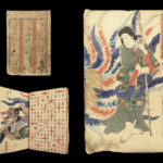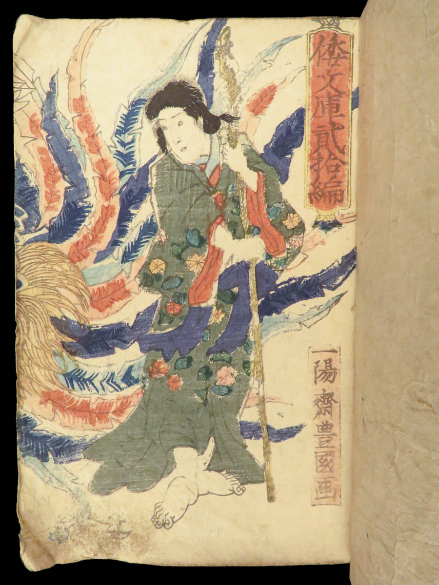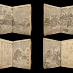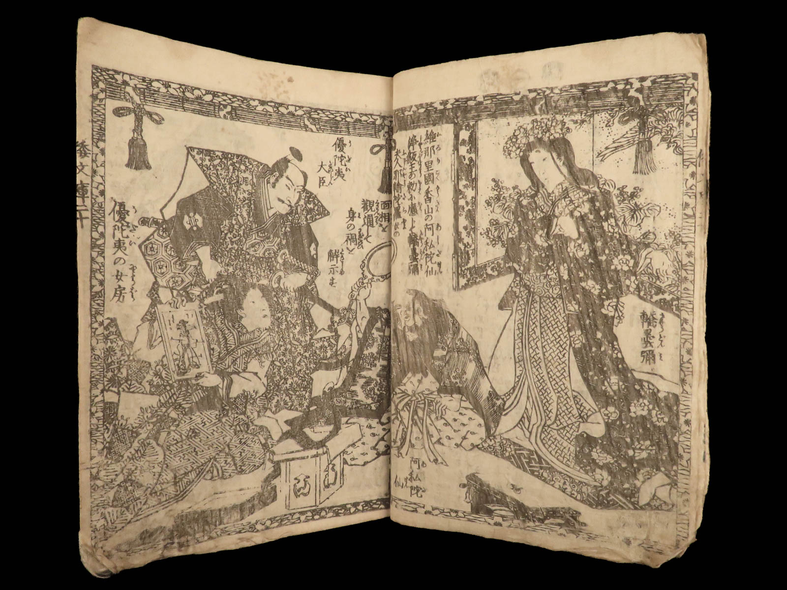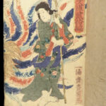 A rare, 19th-century Japanese woodblock print of ‘Shaka Hassou Yamato Bunko,’ a biography of Buddha by Mantei Oga, illustrated by Utagawa Kunisada. The book uses the “eight phases” of Buddha’s life to teach important points and entertain the general populace about Shaka’s life, who is known in Japan as Shakamuni. Kunisada’s illustrations are highly praised for their expressive style and attention to detail. The book is considered a masterpiece of Japanese kusazoshi, a type of Japanese illustrated book from the Edo era, literature and reflects the popularity of Buddhism during the Edo period.