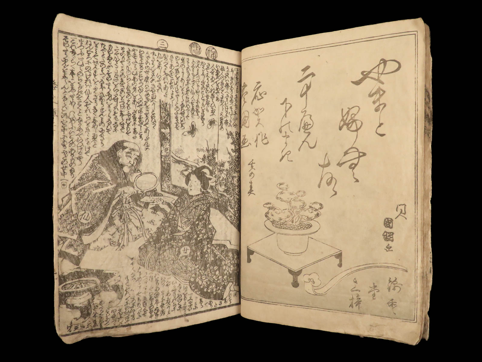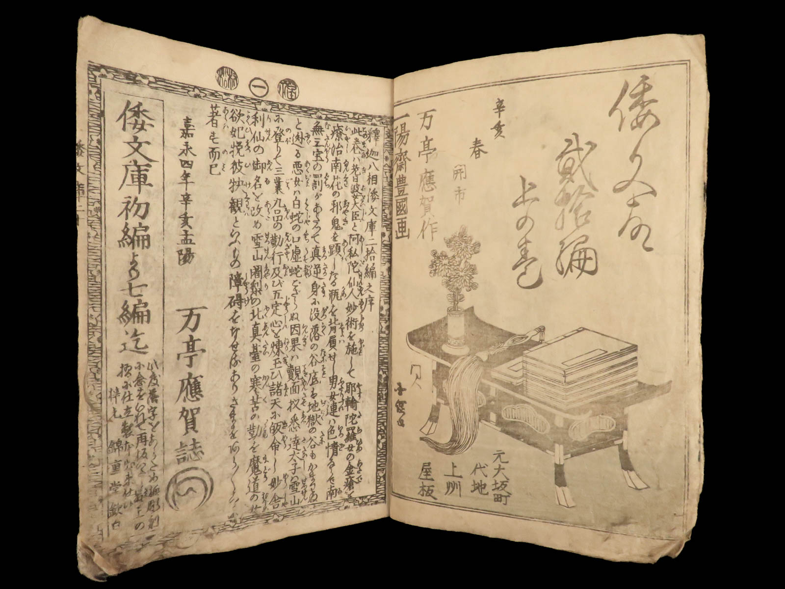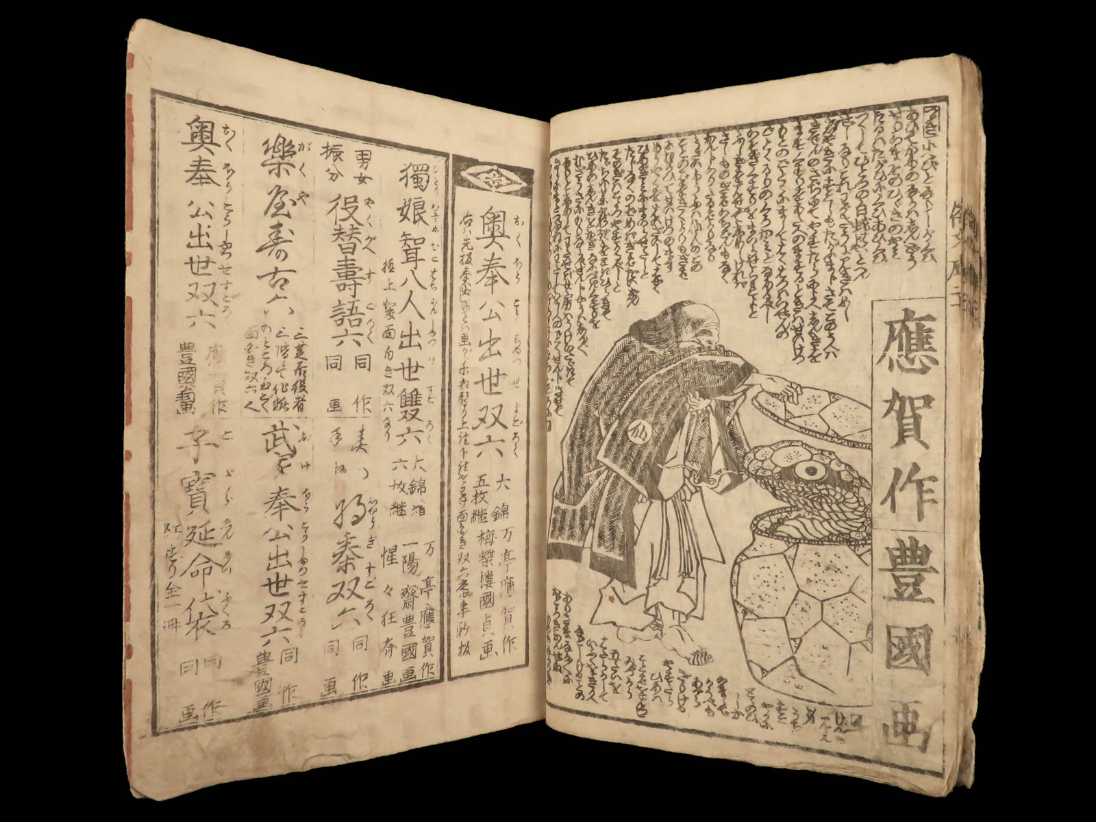 This rare 1866 edition is written in the typical handwritten column format with illustrations of samurai, courtesans, attacks, animals, weapons, and more!