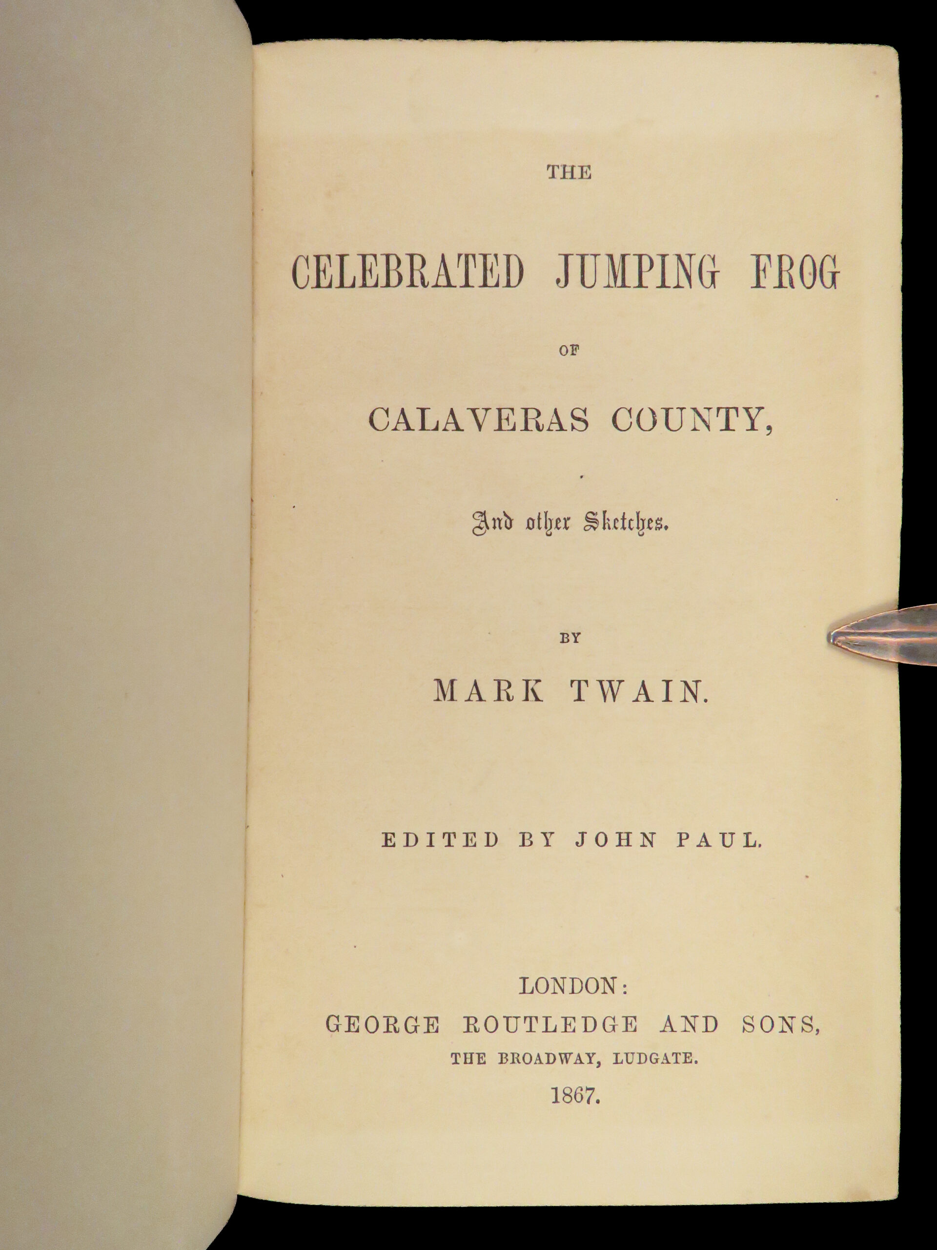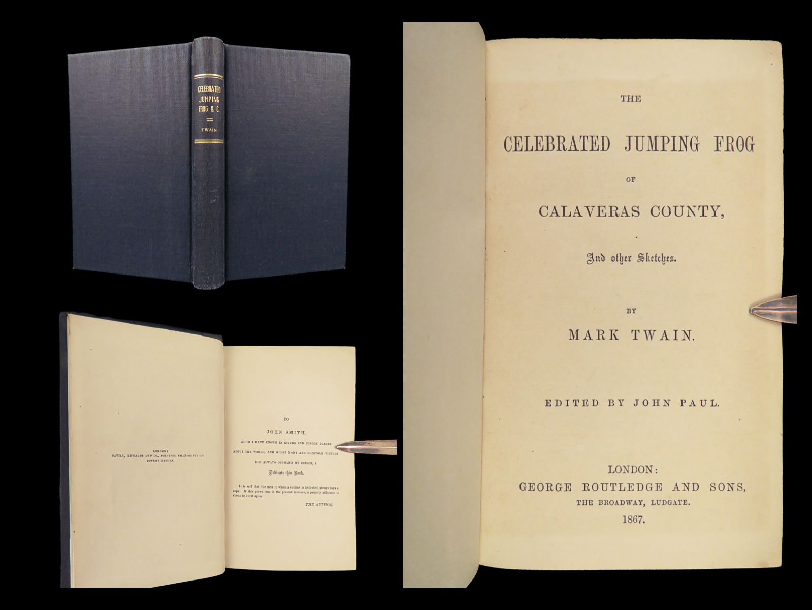 Mark Twain and his works were immensely popular all on their own. “Jumping Frog” was Mark Twain’s first great success as a writer and brought him national attention. It was published in 1865 as part of a small collection of short stories. This 1867 first English edition was edited by John Paul as a printing of the original material including: