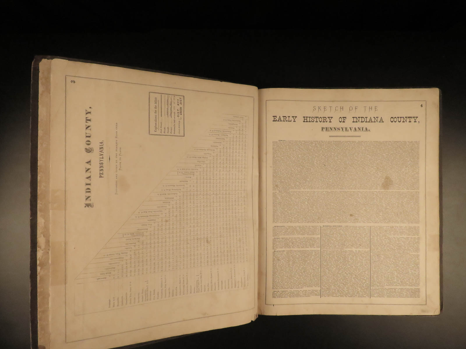 A rare 19th-century atlas of Indiana County, Pennsylvania. Collected by D.G. Beers, this atlas features 40 colored maps of the towns in west-central Pennsylvania. Beers atlases are considered to highly accurate and very popular, even to today.