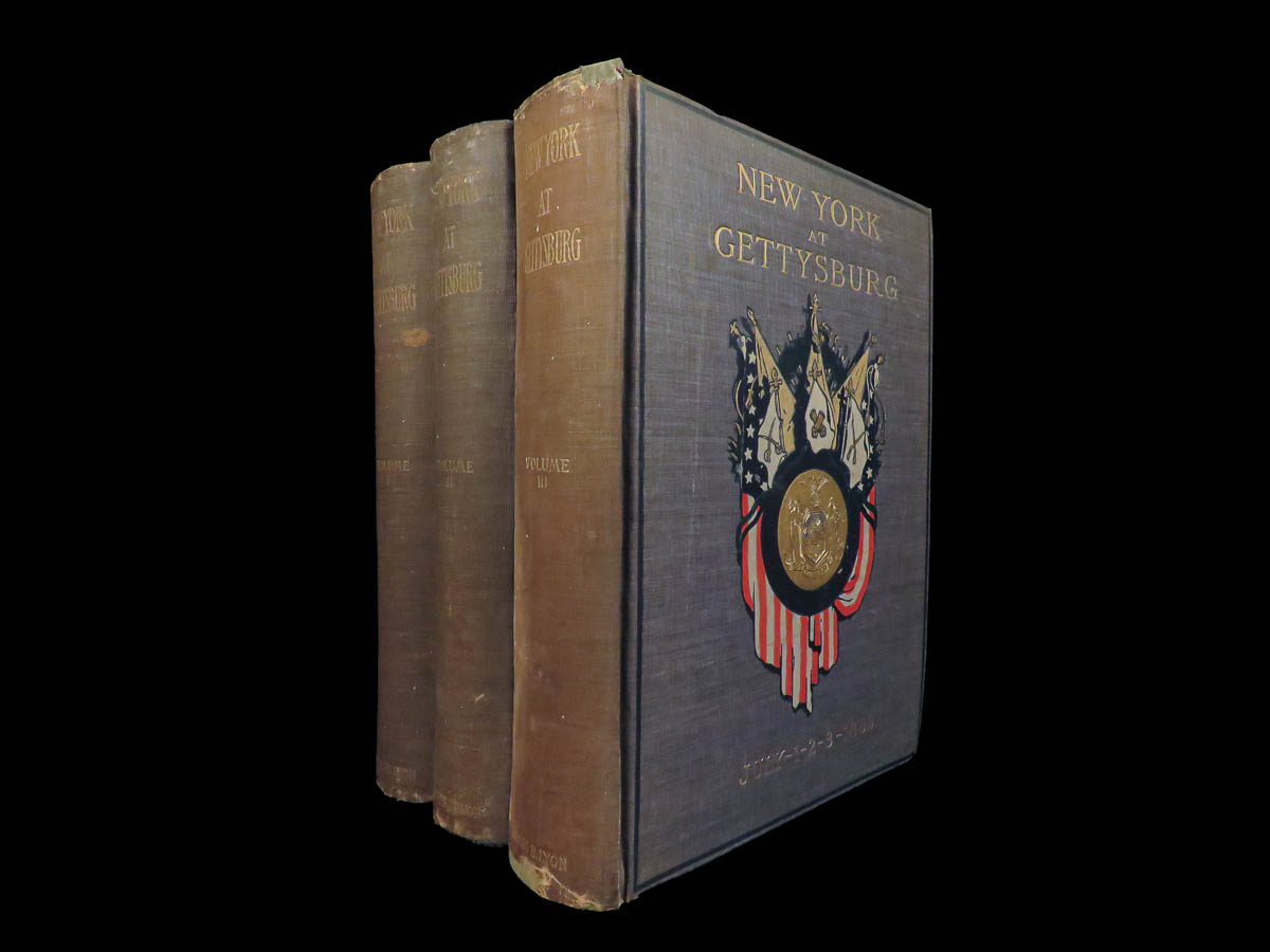 A rare 1902 report of the history of the Battle of Gettysburg. This impressive three-volume set includes all the expected maps and is bound in original blue cloth with a decorative, colored stamp on the front. This work was composed and funded by the New York Monuments Commission, which sought to honor the dead soldiers from the Battle of Gettysburg, Battle of Chattanooga, and the Battle of Antietam.