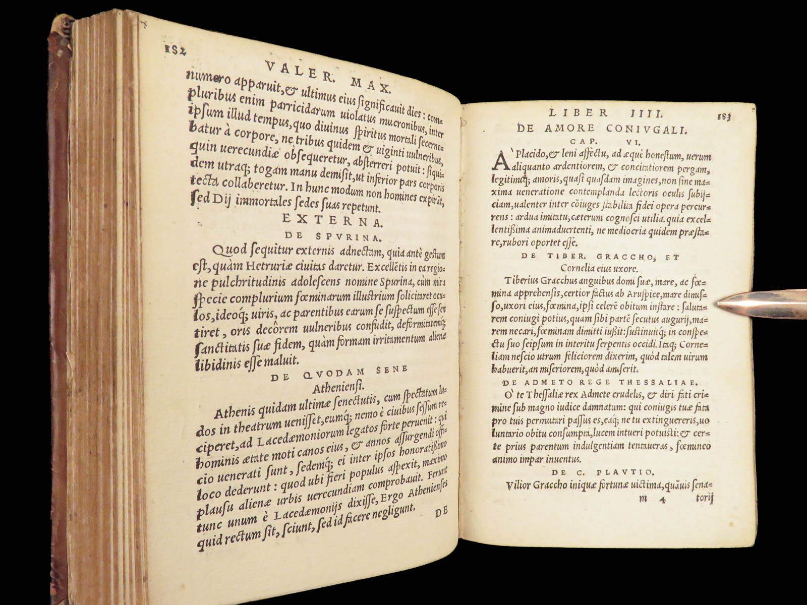 A rare printing of Valerius’s “Dictorum et Factorum” or Historical Anecdotes. This work is a collection of short stories, sayings, and phrases, memorial to Tiberius Caesar, who was reigning during Valerius’ lifetime. These anecdotes depict ancient Greek life and philosophy as well as famous kings and Caesars. Many modern historians claim that Valerius’s work was taken from Cicero, Livy, and Sallust, as well as other ancient historians and philosophers, rather than creating original works.