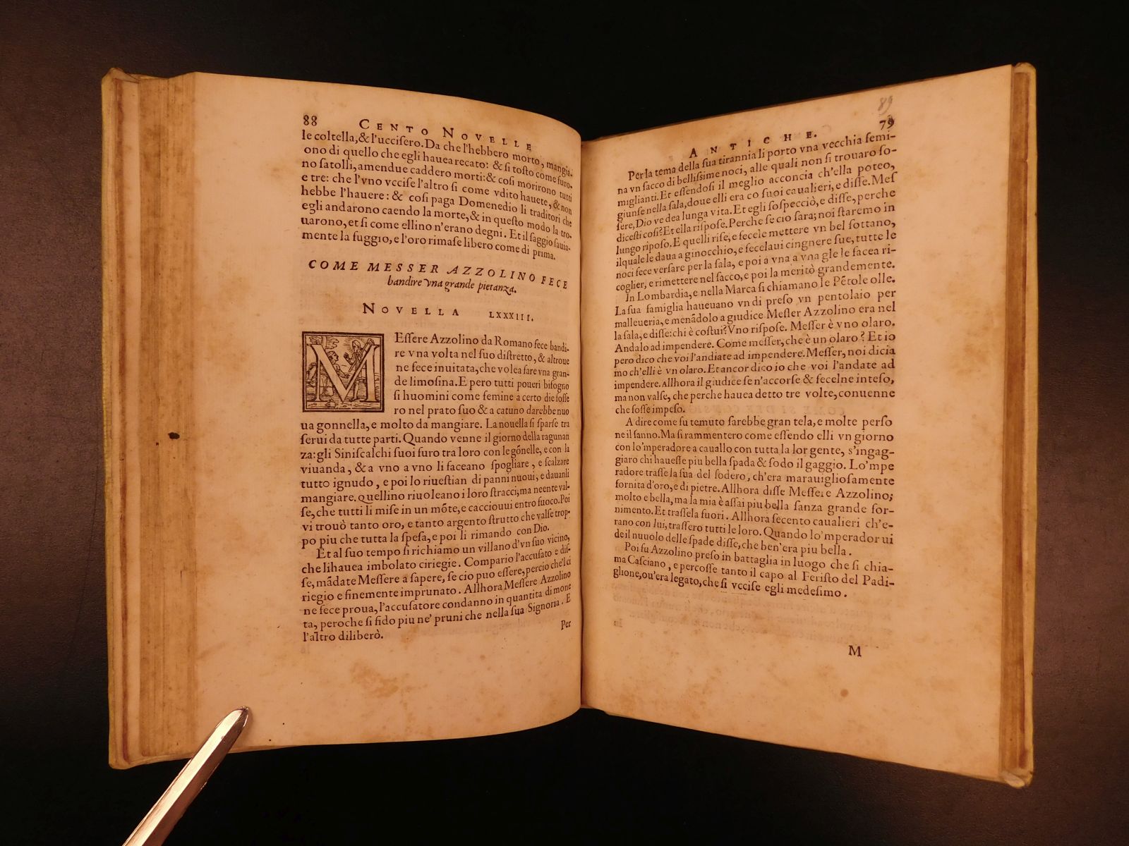 The ‘Princeps’ or ‘Novellino’ by Carlo Gualteruzzi is a 16th-century collection of ancient tales. Joseph Consoli, a Gualteruzzi expert, says “The principal innovative aspect of ‘The Novellino’ is its inclusion of everyday people in the ranks of its protagonists.” This collection is important in that before this work,