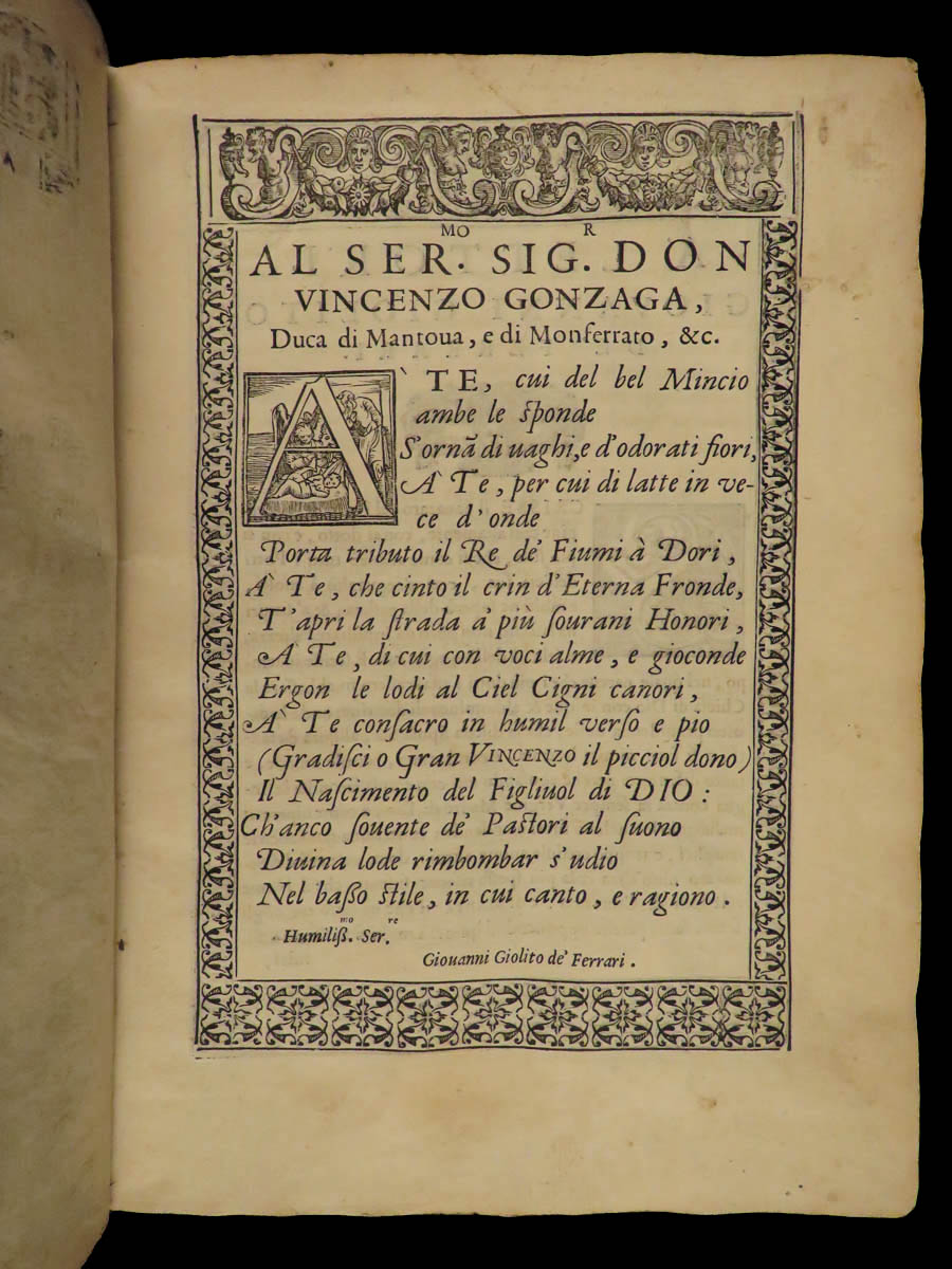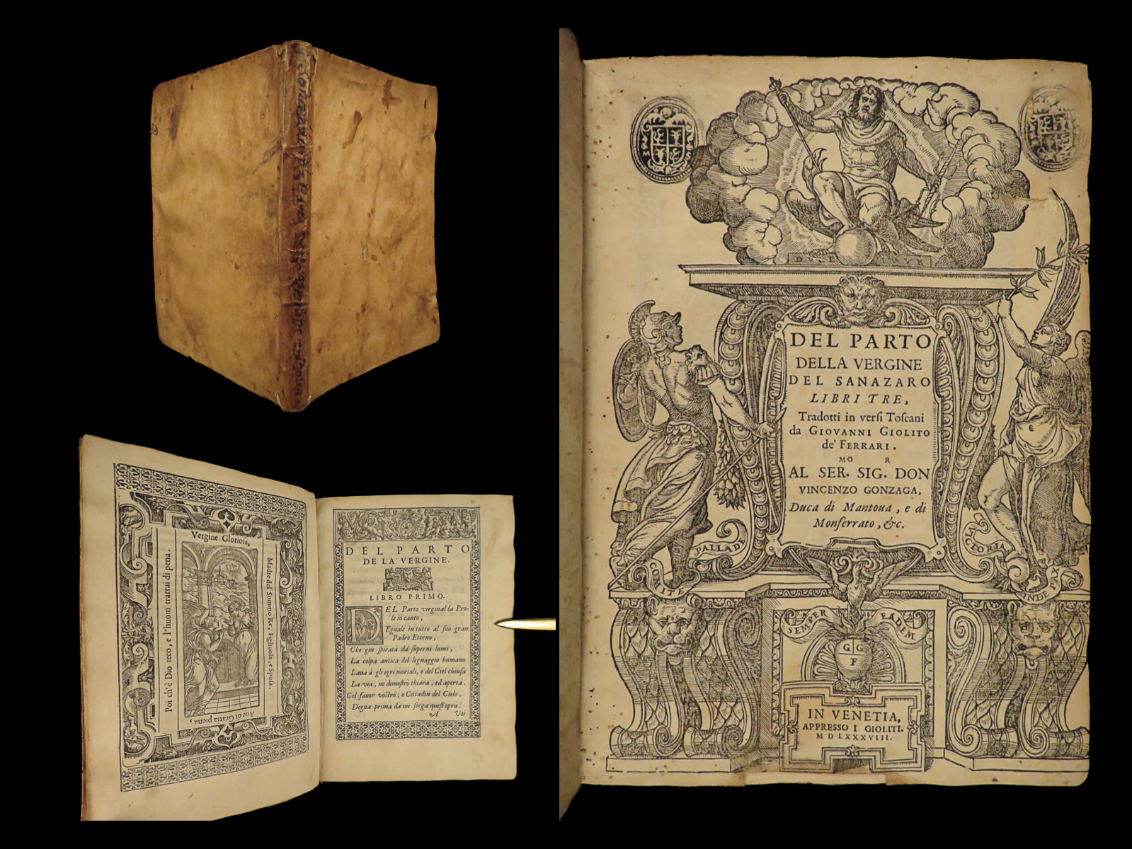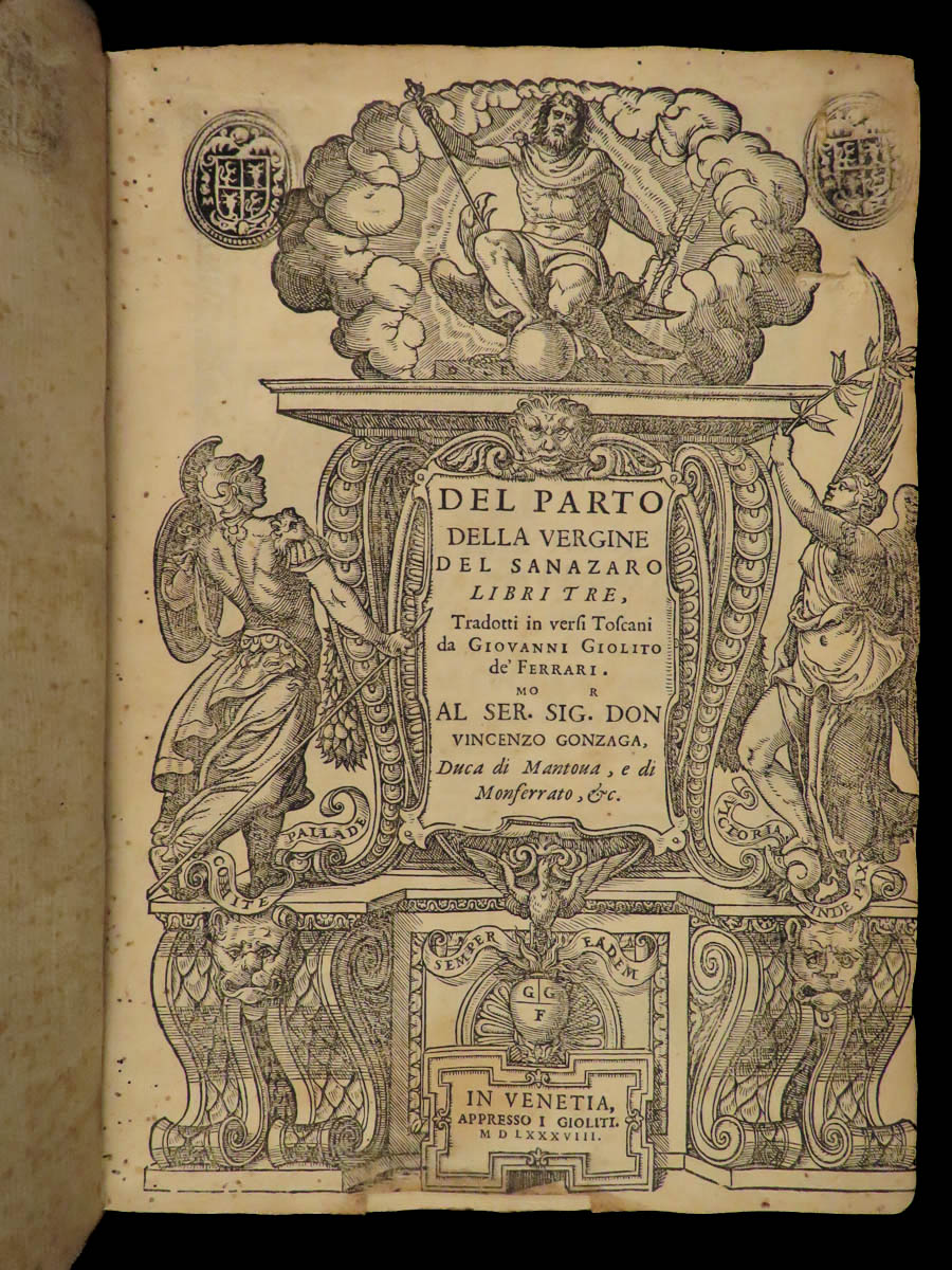 Del parto della Vergine del Sanazaro libri tre : tradotti in versi Toscani da Giovanni Giolito de’ Ferrari. Al Sermo. Sigr. Don Vincenzo Gonzaga, Duca di Mantoua, e di Monferrato, &c.