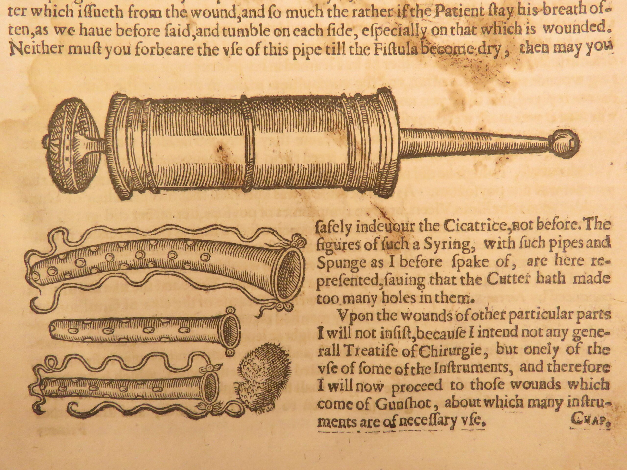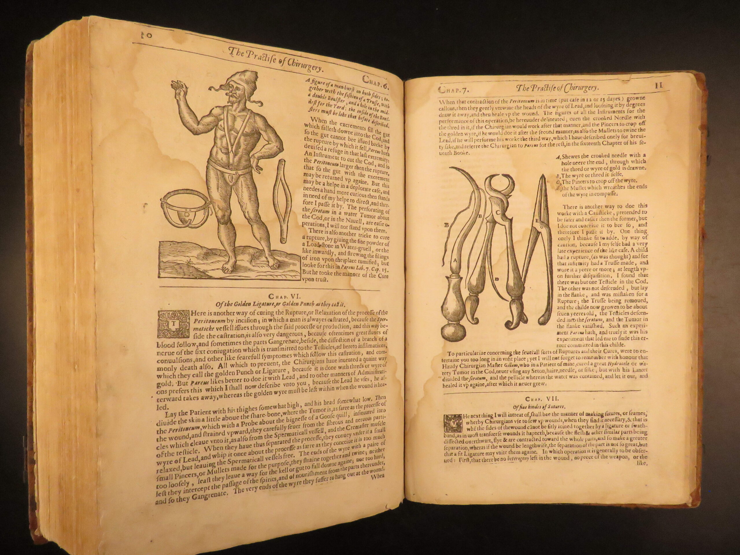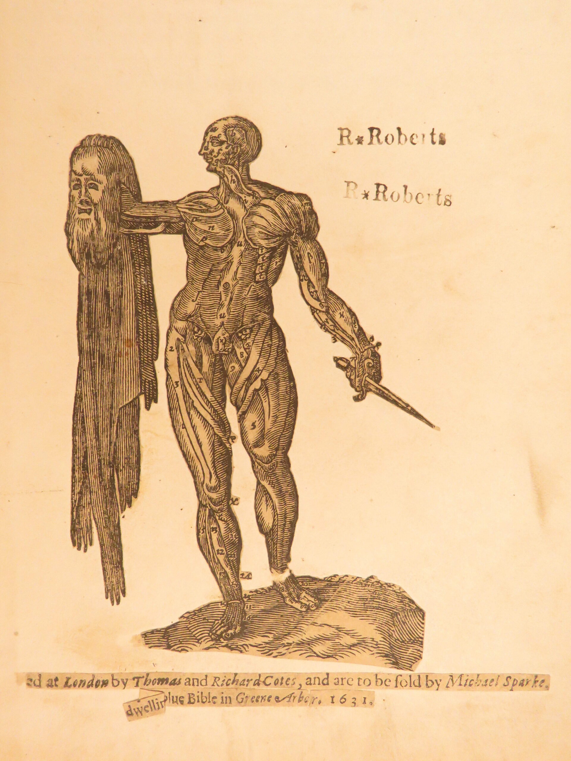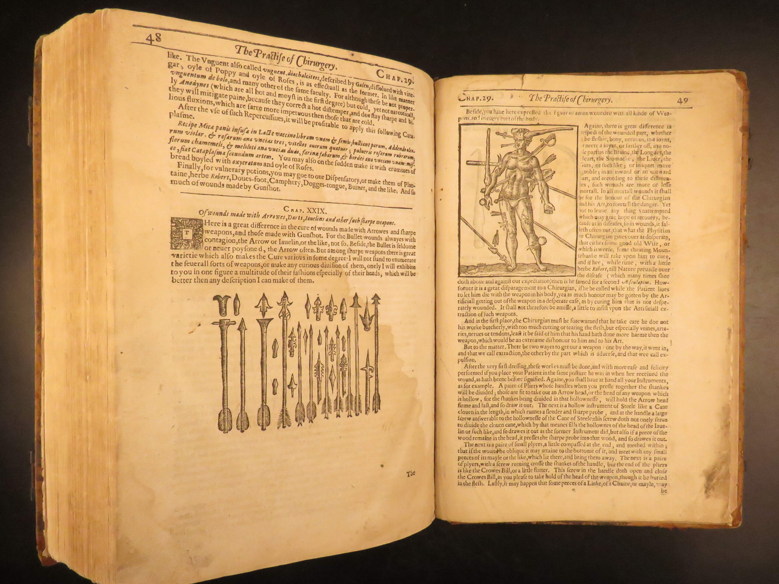 Nevertheless, the book was tremendously successful throughout England much in part to the countless in-text illustrations depicting bizarre, grotesque, and often gruesome views of anatomy and injury. The illustration of the “man wounded with all kinds of Weapons in every part of the body” is a rather curious image.