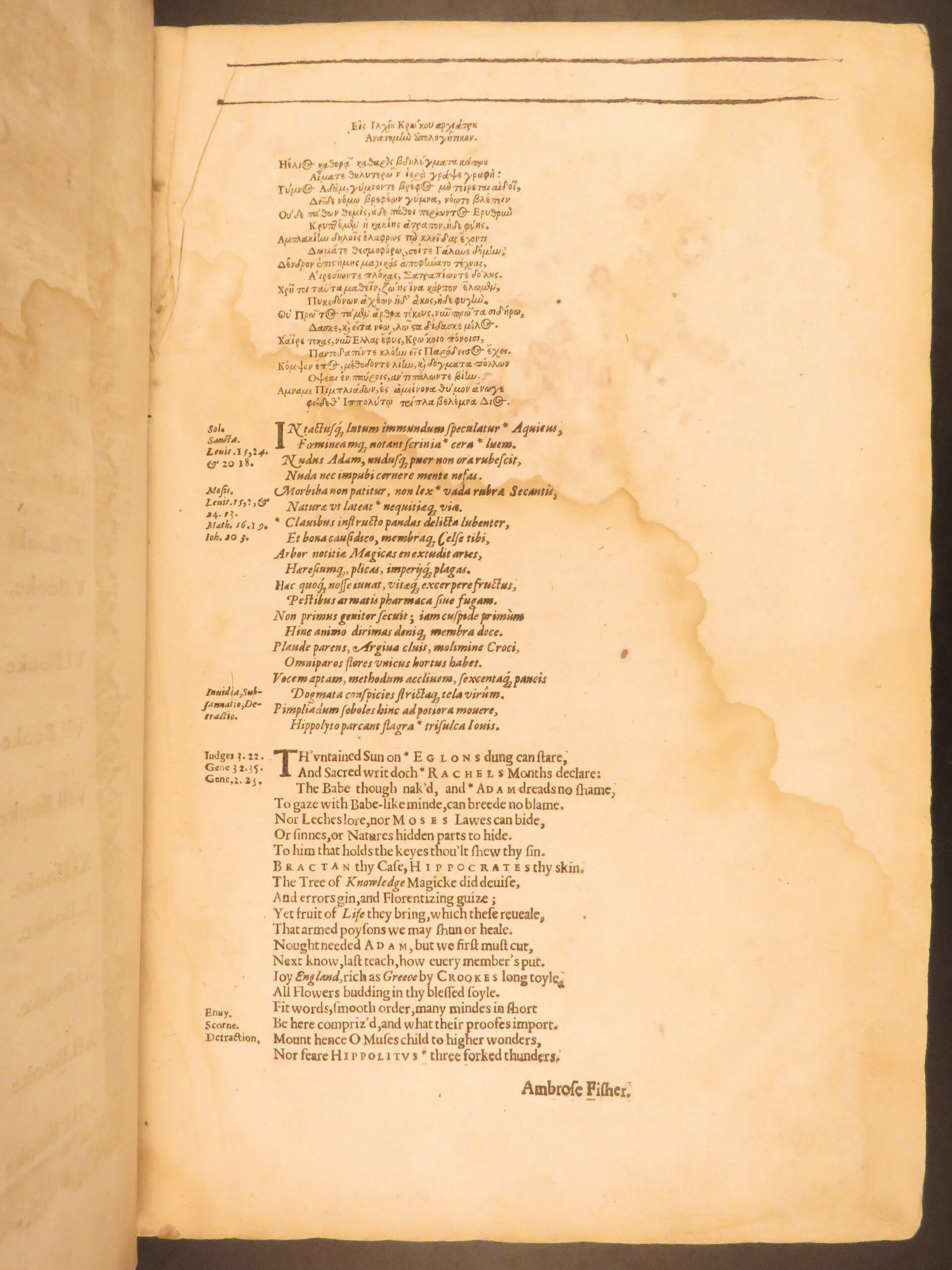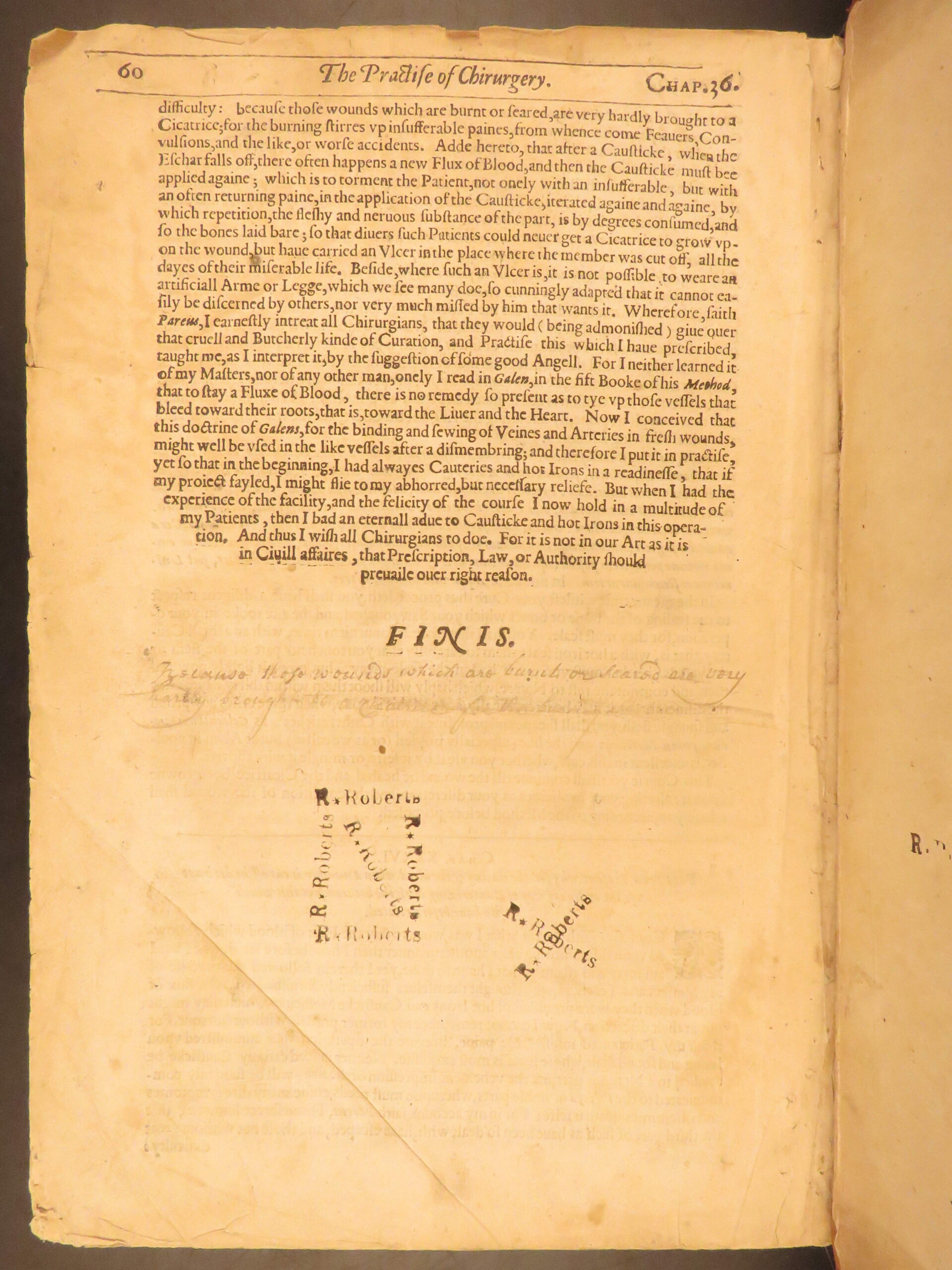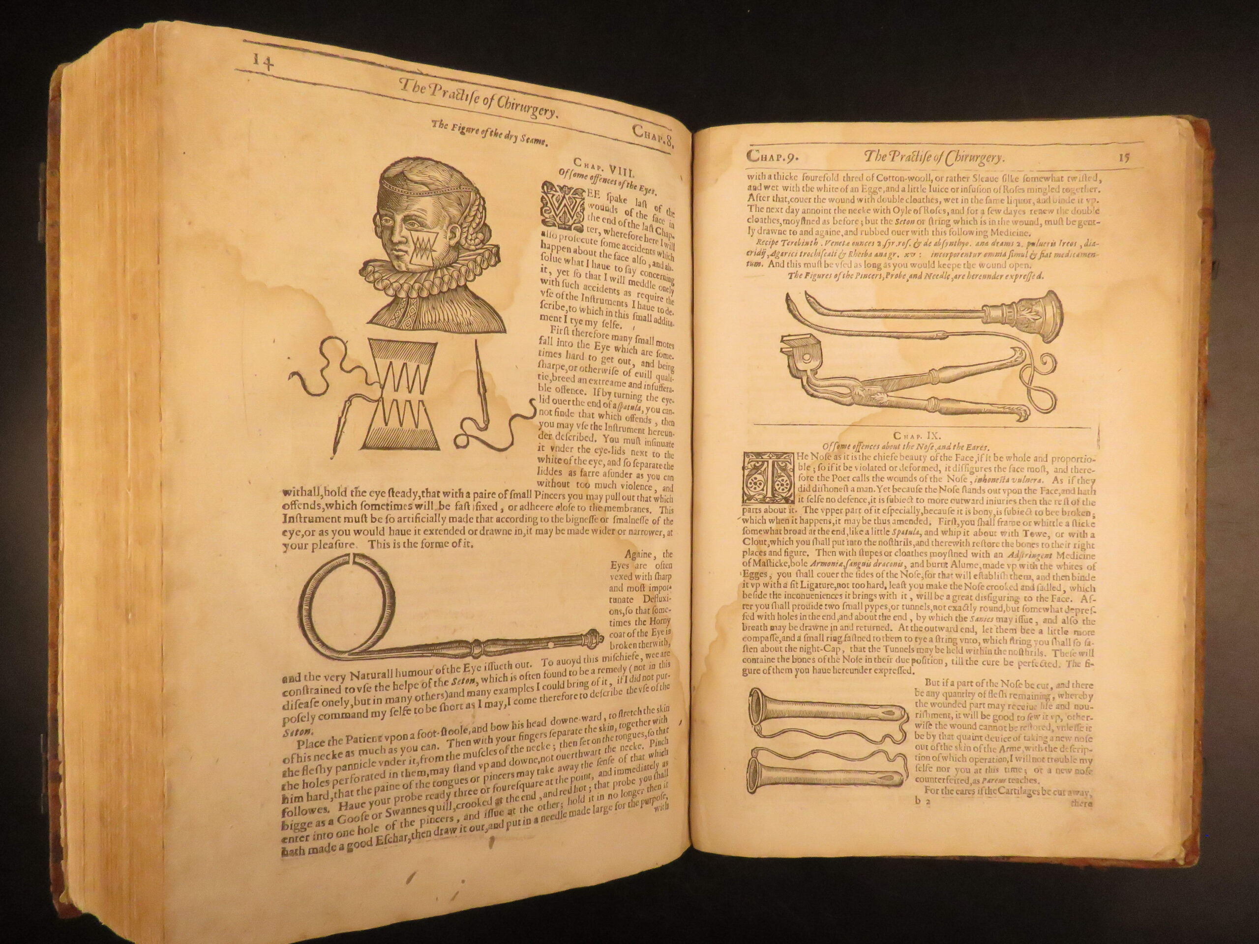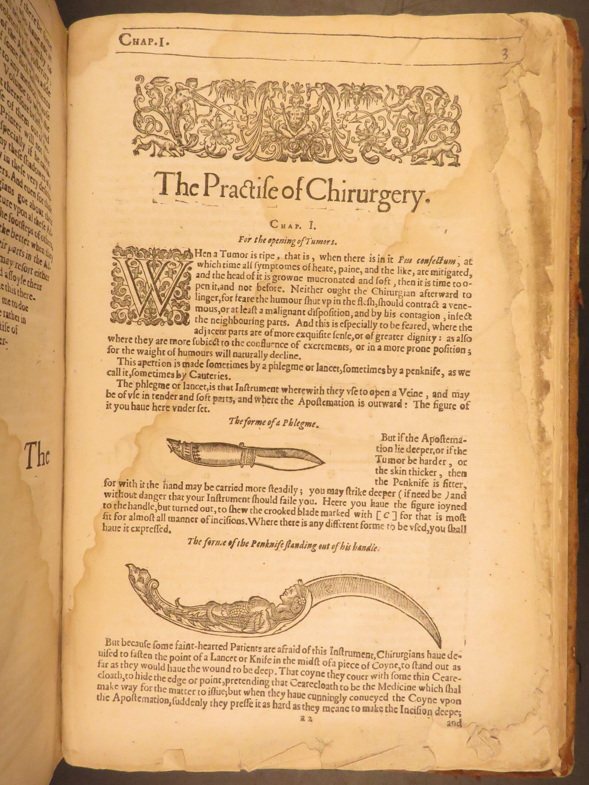 Nevertheless, the book was tremendously successful throughout England much in part to the countless in-text illustrations depicting bizarre, grotesque, and often gruesome views of anatomy and injury. The illustration of the “man wounded with all kinds of Weapons in every part of the body” is a rather curious image.