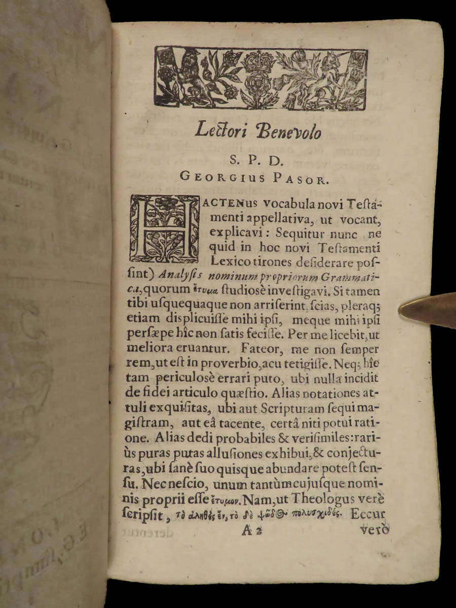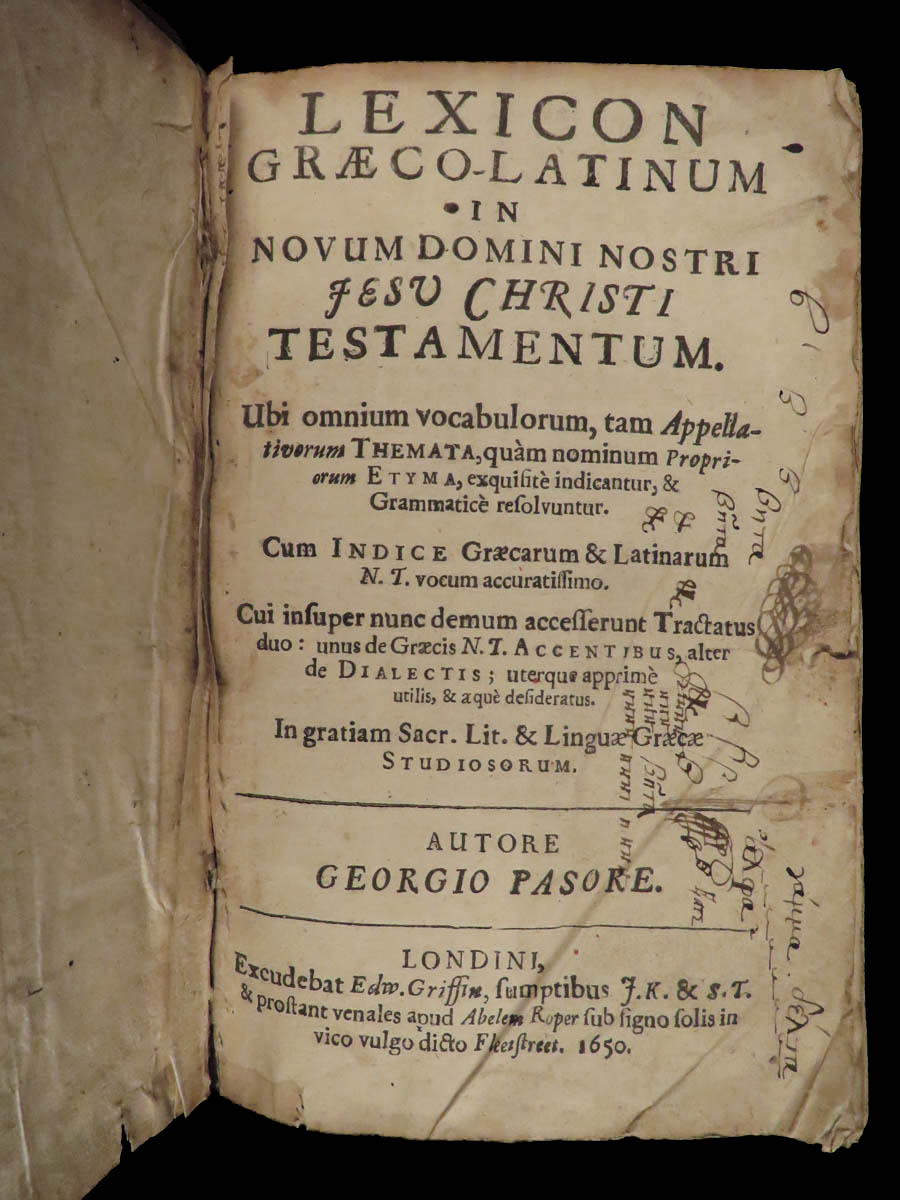 A rare 1650 edition Georg Pasor’s New Testament dictionary and thesaurus. Pasor was well-known for his numerous works on language and grammar, but none are prominent as this one on the New Testament. First appearing in 1619, his ‘Lexicon Graeco-Latinum’ would see several editions from several cities of the next few decades. This work features an additional section of Pasor’s analysis of the Hebrew Syriacorum.