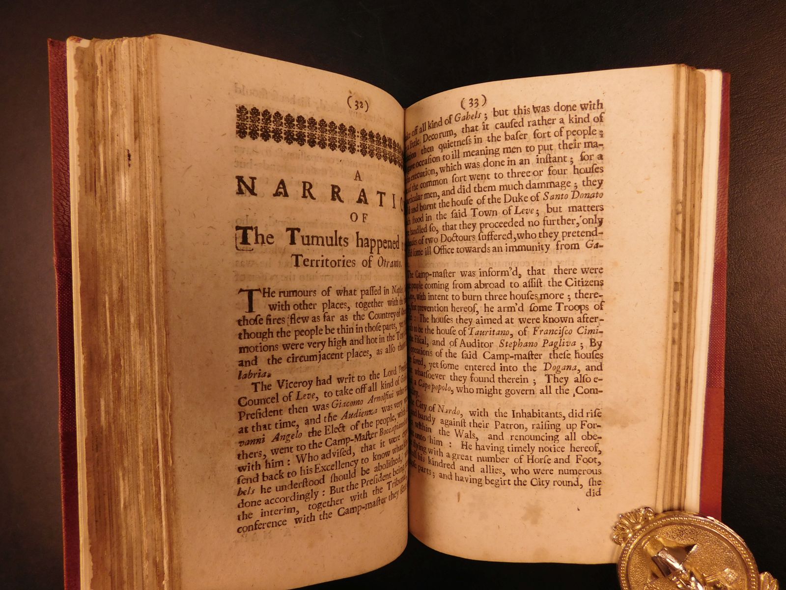 This fine book, finely rebound in Moroccan red leather, includes a full-page woodcut portrait of Masaniello.