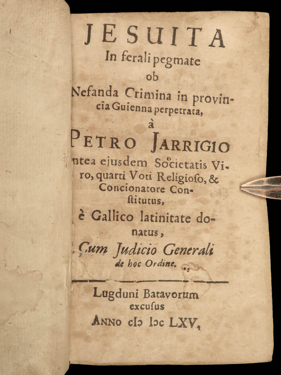 Jesuita in ferali pegmate ob nefanda crimina in provincia Guienna perpetrata à Petro Jarrigio … è Gallico latinitate donatus, cum judicio generali de hoc ordine