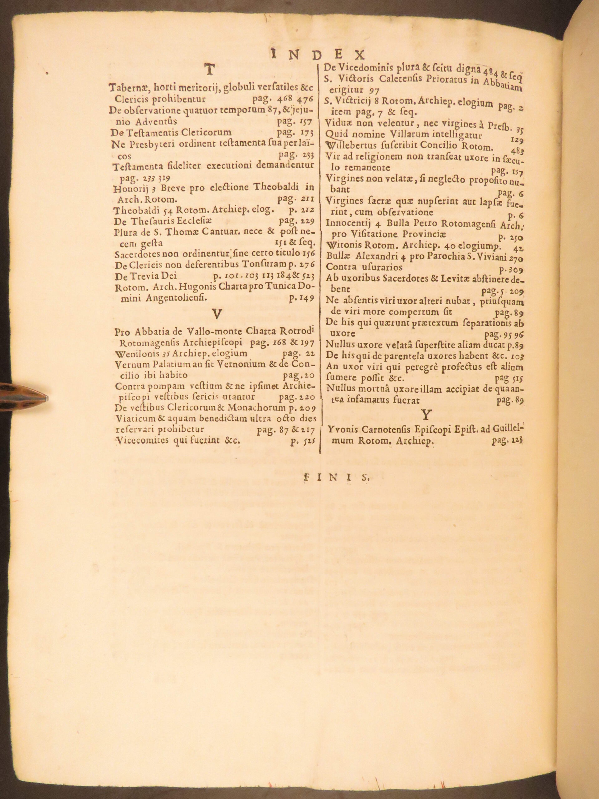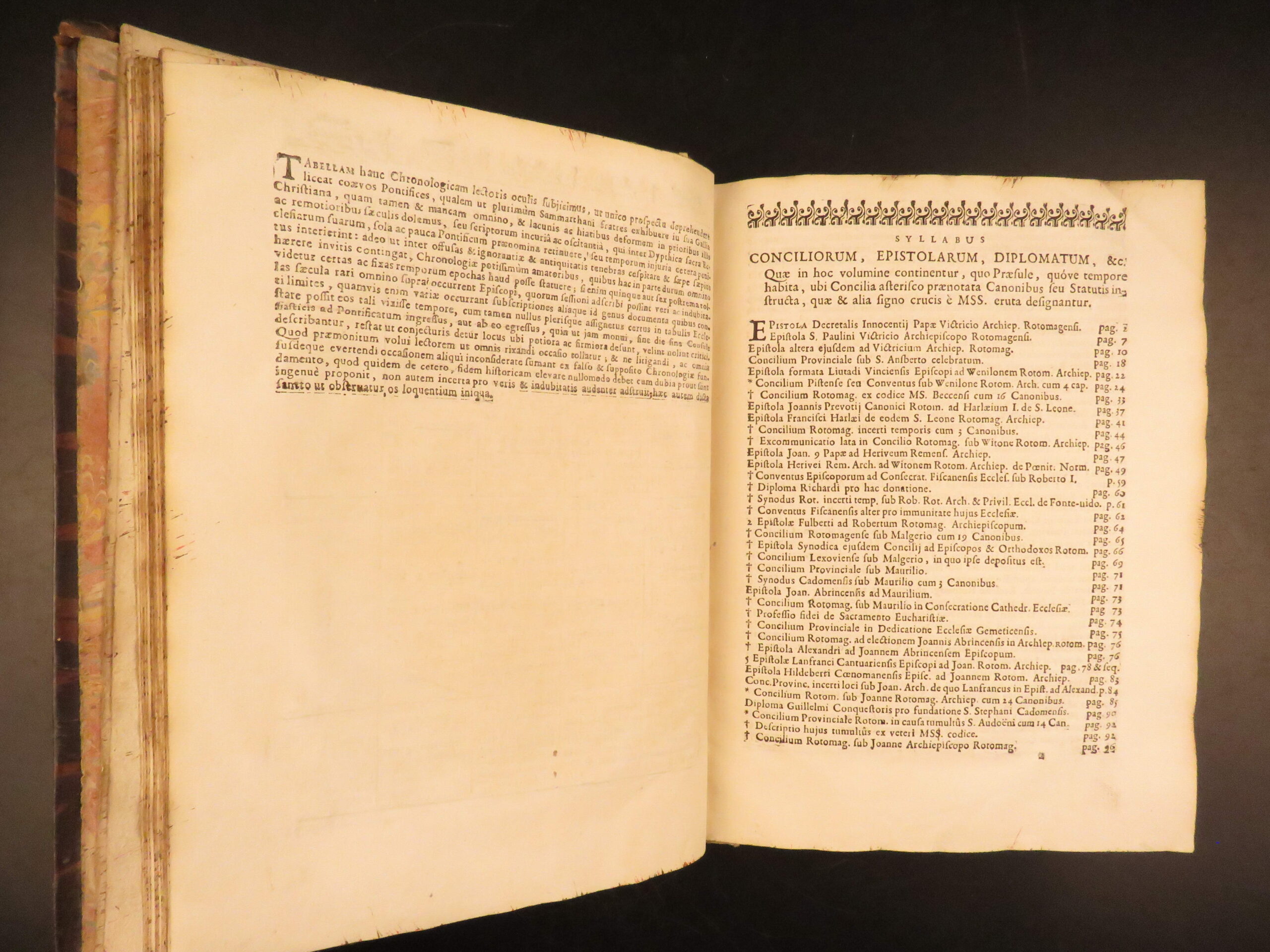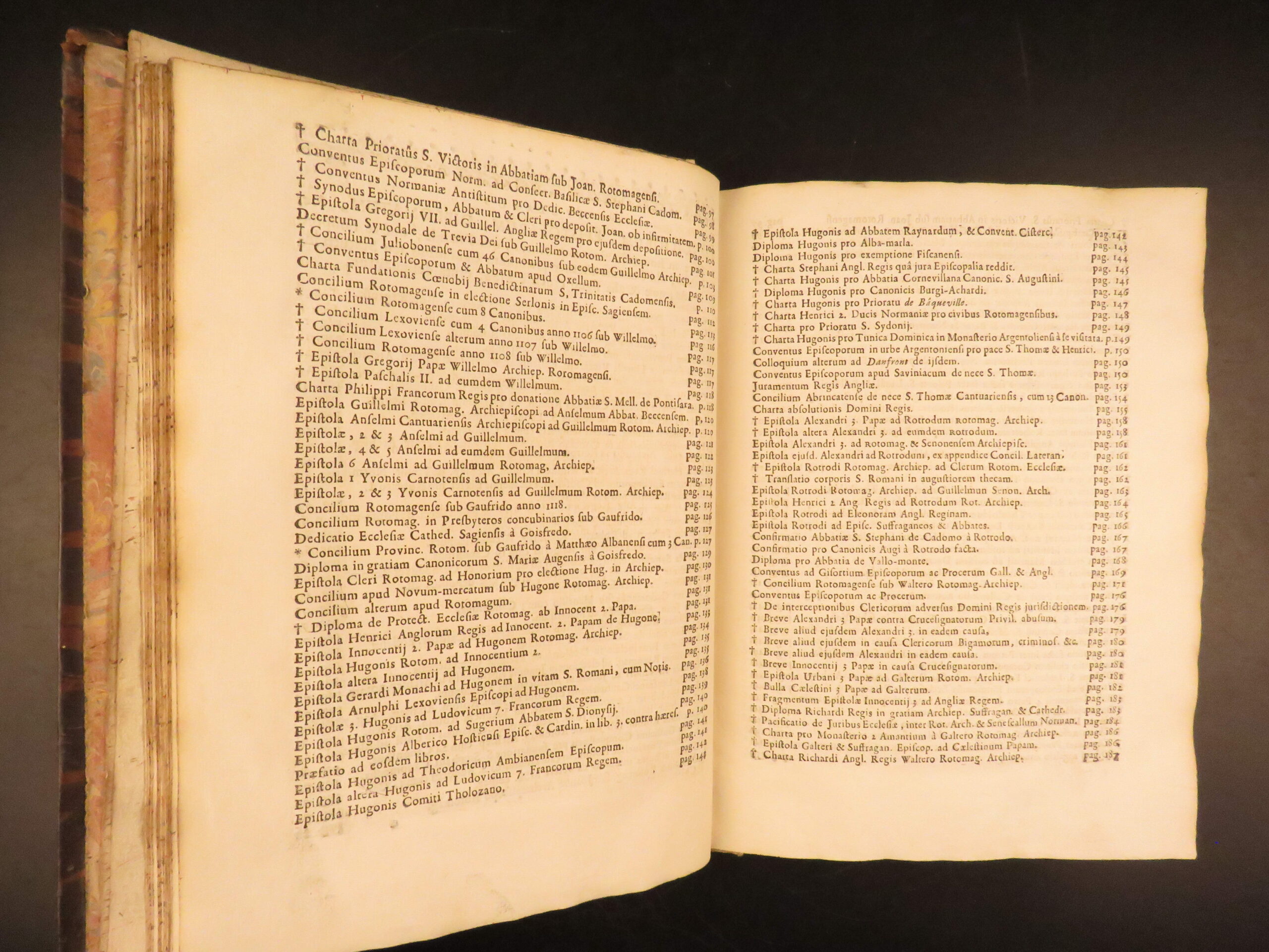 This fine work in was collected and edited by Francois Pommeraye, a Benedictine monk from Rouen who wrote numerous works on the history of Rouen from its cathedral, to archbishops, various abbeys, and even almsgiving practices in Rouen. Pommeraye was well acquainted with the earliest manuscripts held in Rouen and utilized them to write this book, “Sanctæ Rotomagensis ecclesiæ concilia”. He included the names of the supreme pontiffs of Rouen, Rouen letters, legal agreements, and even the names of the Archbishops of Normandy.
