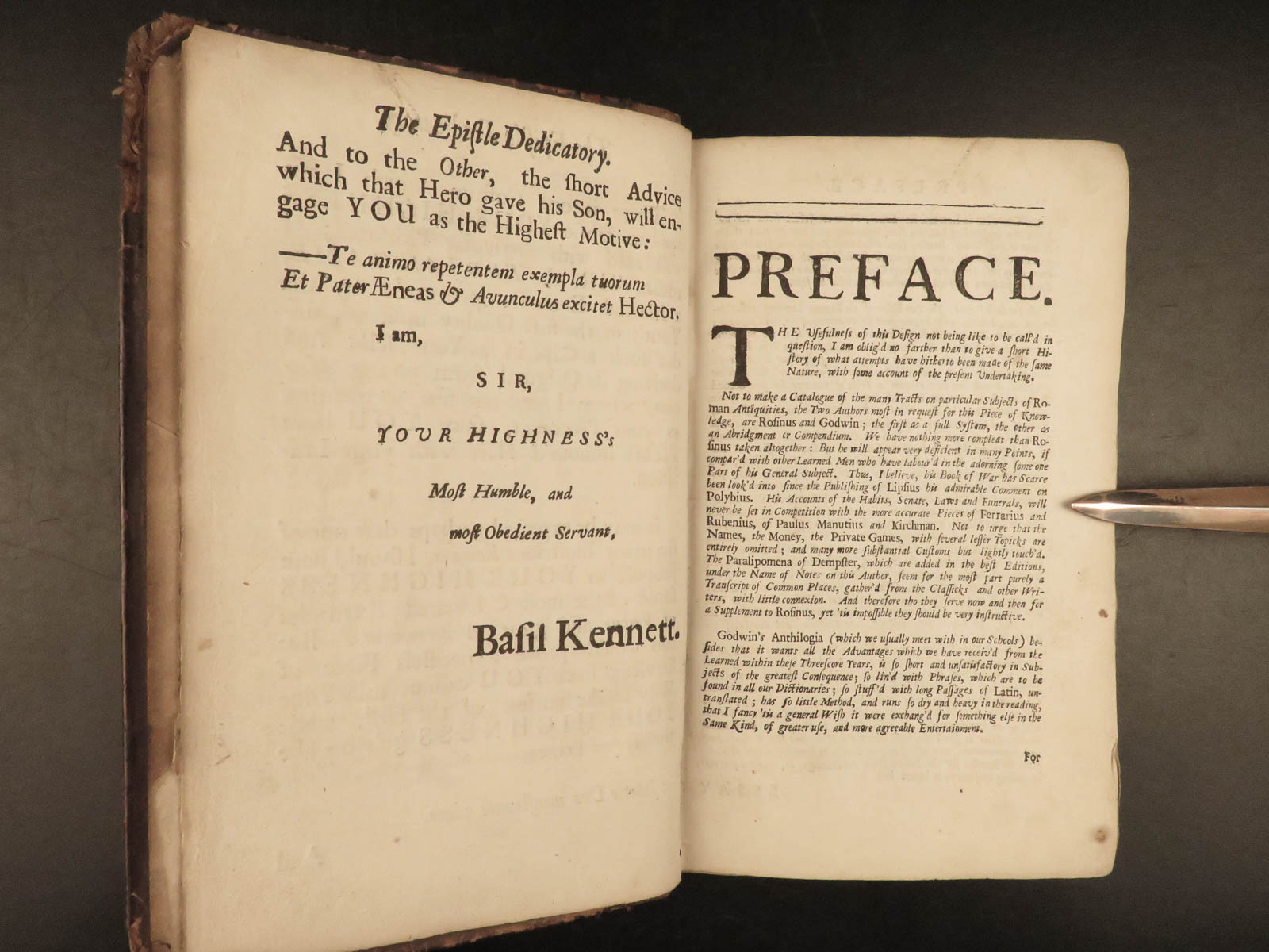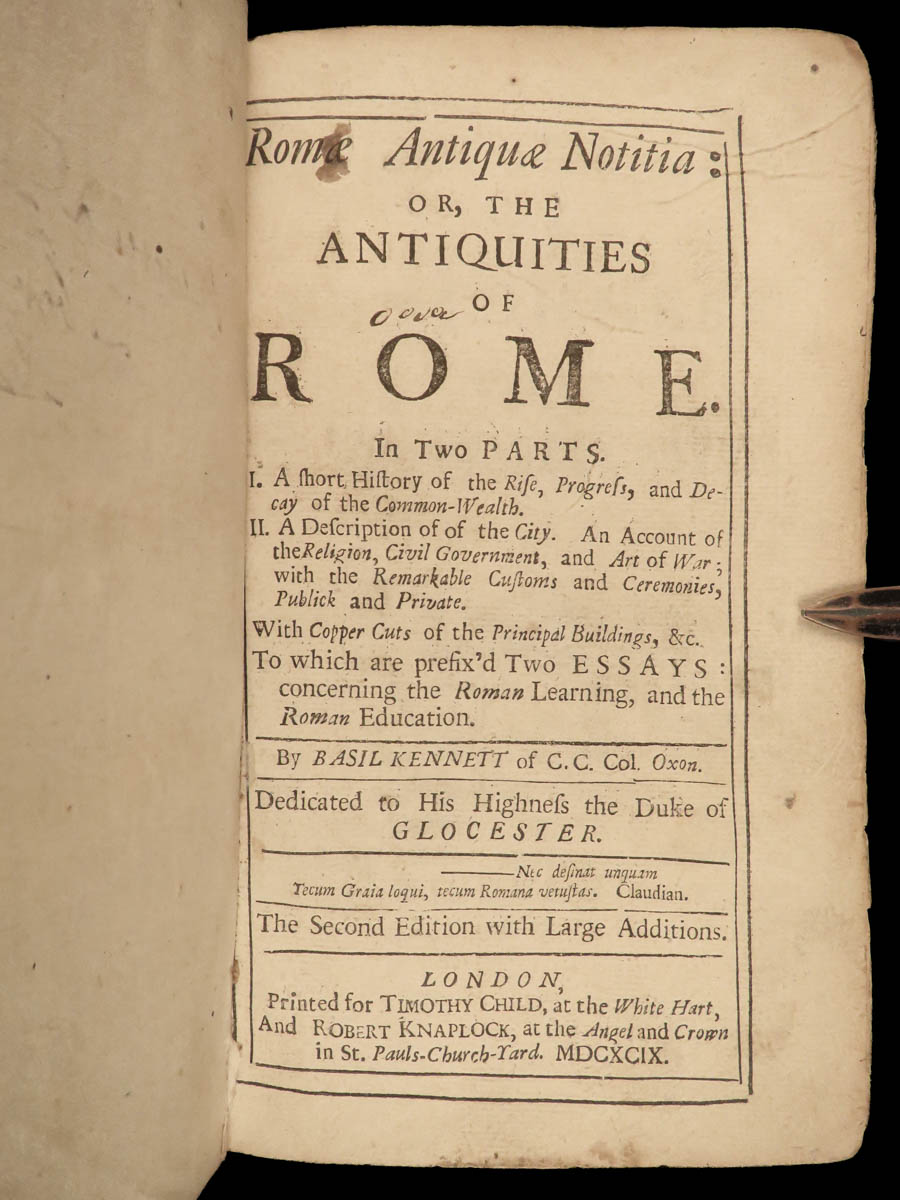 Basil Kennett was a 17th-century English chaplain much better known for his academic scholarship. This work became the standard on the history of Rome during its time. While other books on the history of Rome were certainly available, this work was written in a way of encouraging the study of classical philosophy and history, more so than just reiterating historical facts. This 1699 edition contains Kennett’s two essays which, according to the title page, concern “the Roman learning and the Roman Education”.