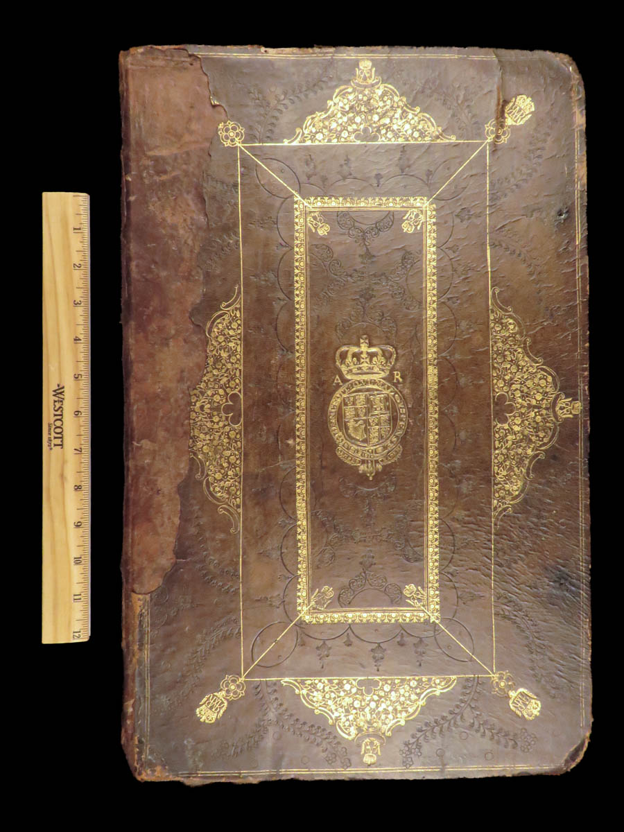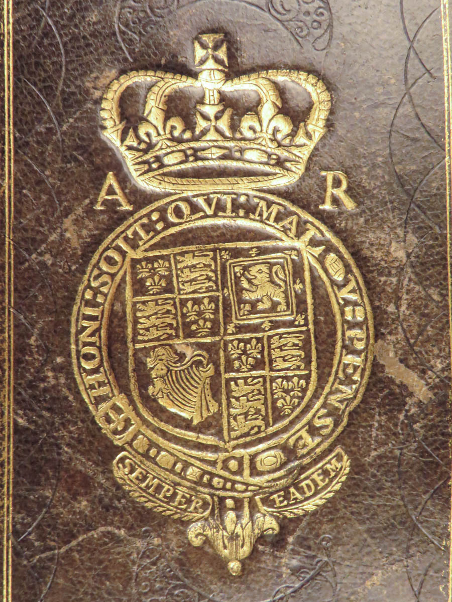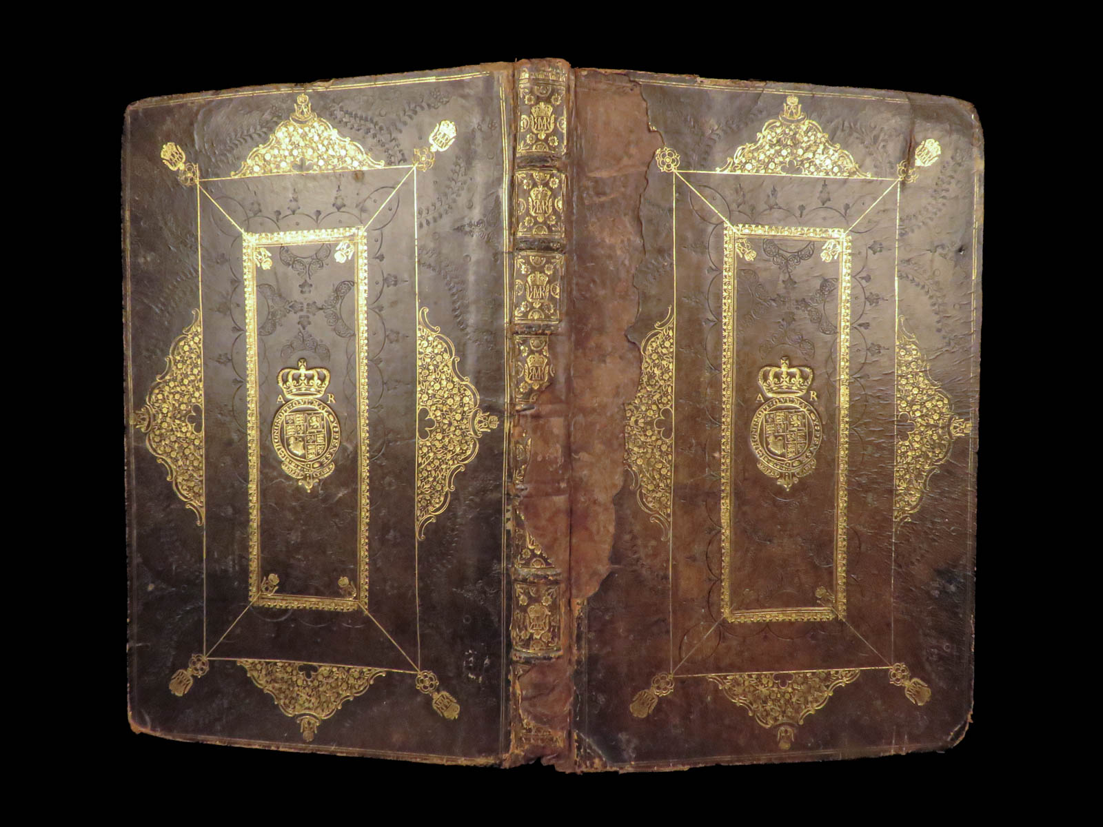 This particular edition was published by Bill with credit given to the deceased Thomas Newcomb, printers to Queen Elizabeth. It was bound in an armorial leather binding with the royal arms impressed into the front and back boards.