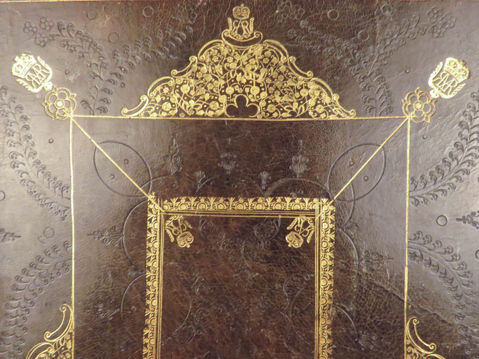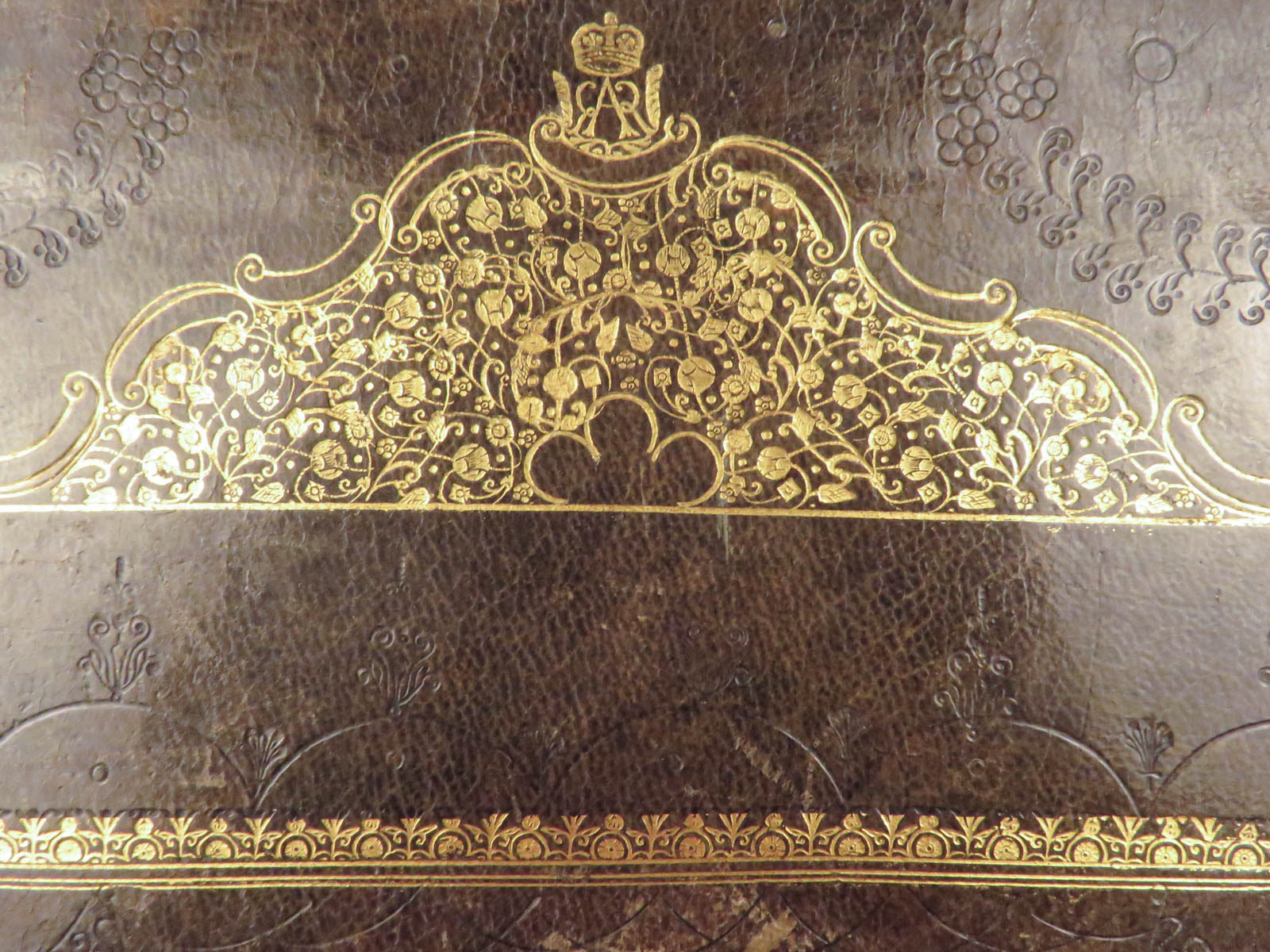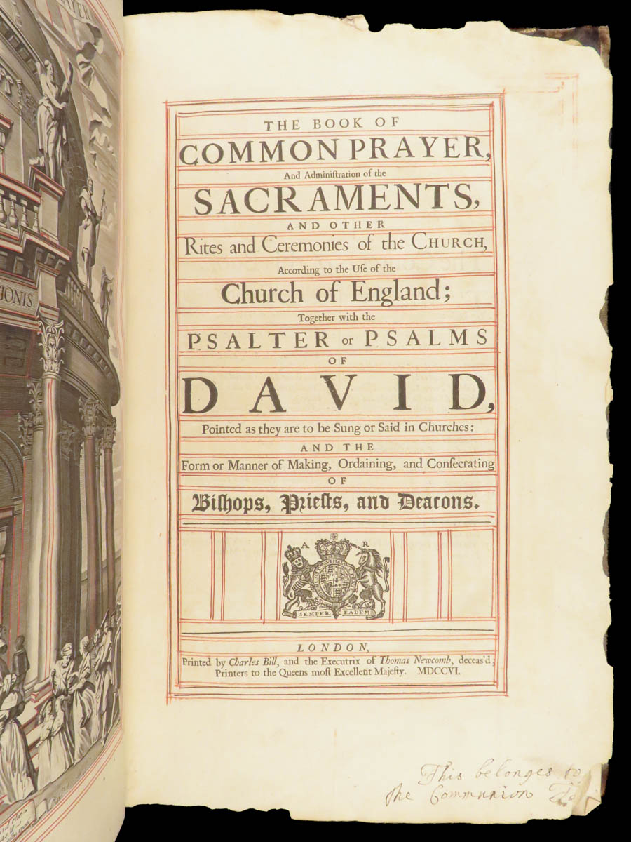 This particular edition was published by Bill with credit given to the deceased Thomas Newcomb, printers to Queen Elizabeth. It was bound in an armorial leather binding with the royal arms impressed into the front and back boards.