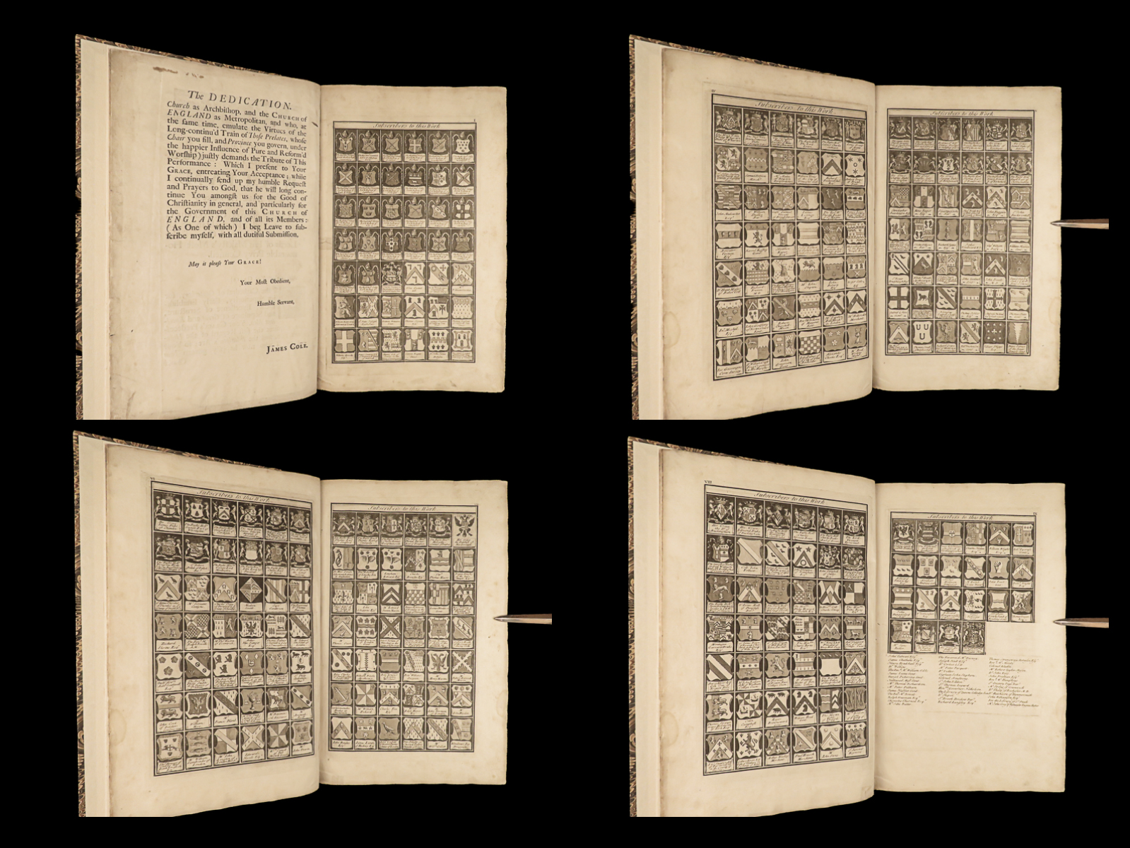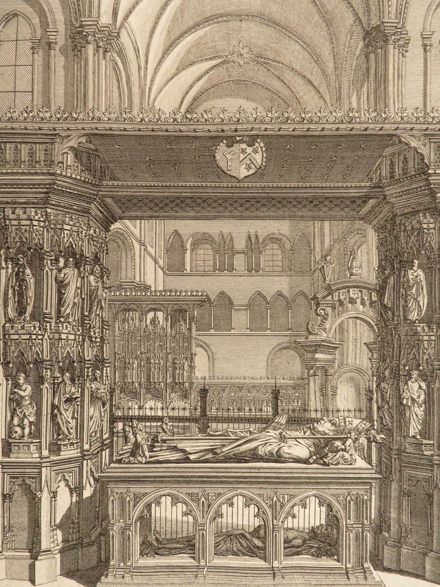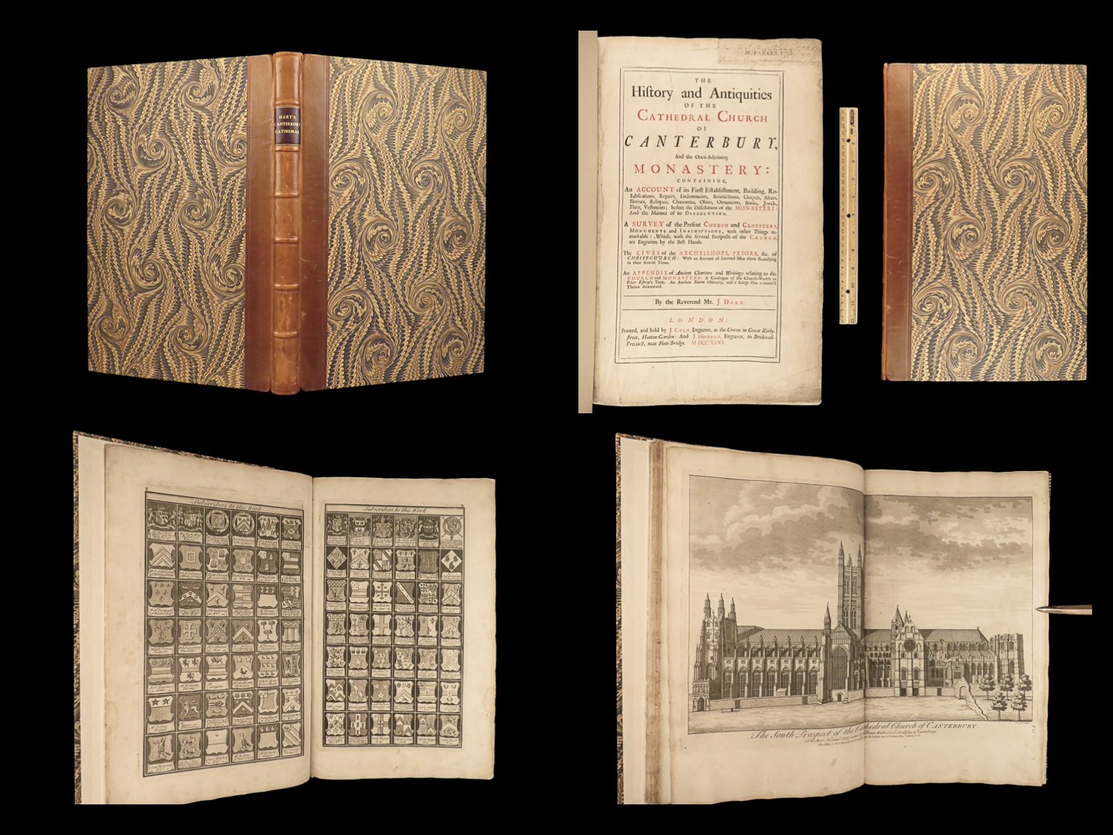While the historical contents of this enormous folio first edition of Dart’s “Canterbury” are important, the subscriber pages are perhaps the most interesting aspect of this work. Unlike most works from this era, this book features engraved views of each subscriber’s arms – hundreds of illustrated figures of coats-of-arms! Other full-page engravings appear throughout this book – views of tombs, portraits, and places of rest of English saints and nobles.
