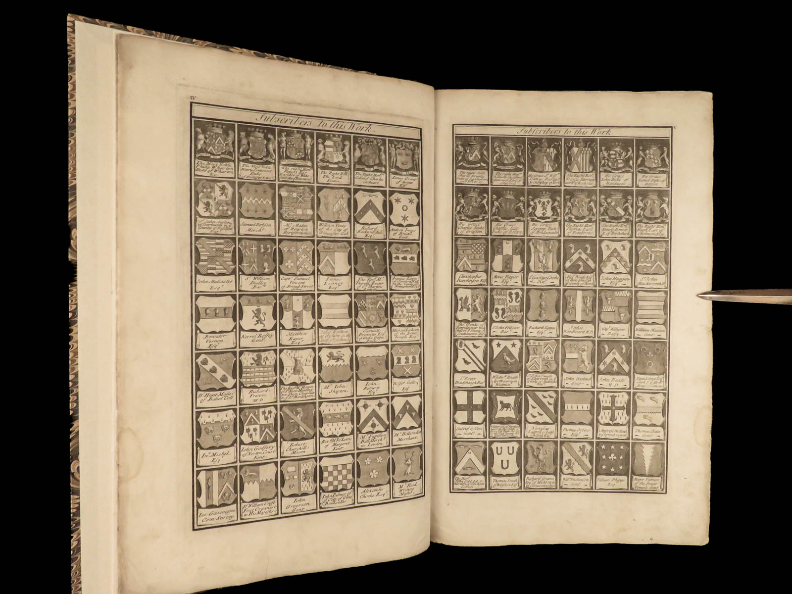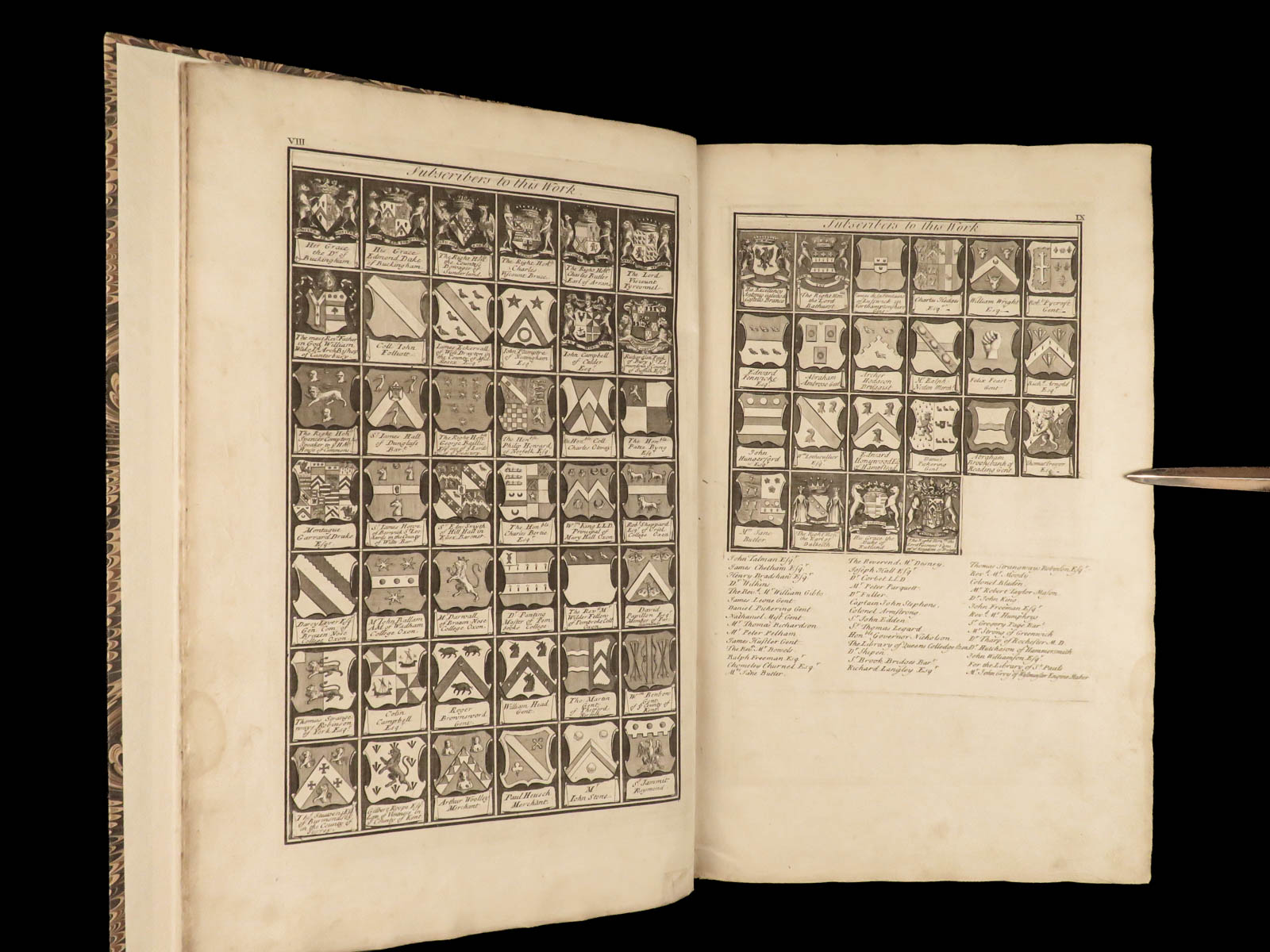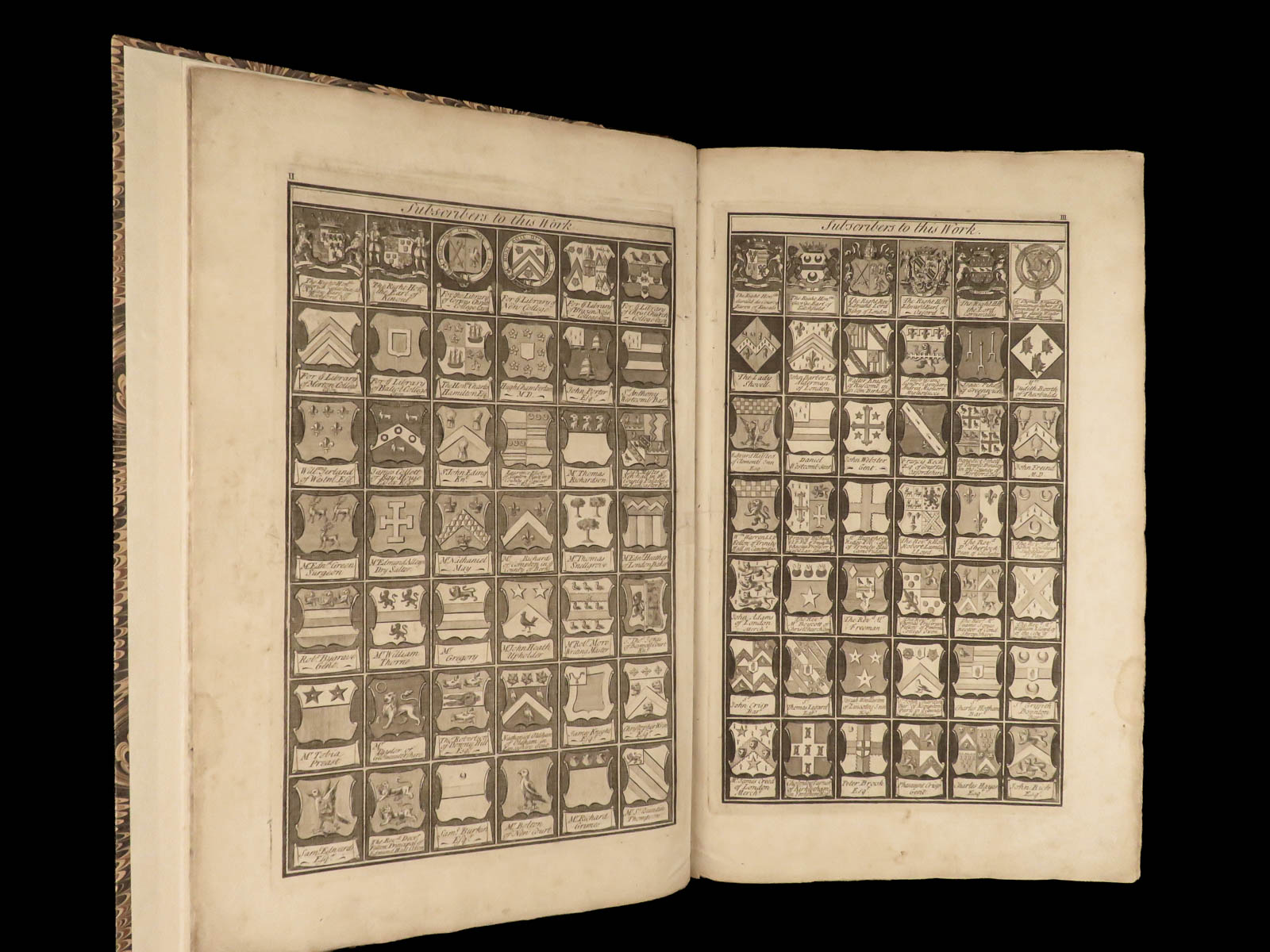 While the historical contents of this enormous folio first edition of Dart’s “Canterbury” are important, the subscriber pages are perhaps the most interesting aspect of this work. Unlike most works from this era, this book features engraved views of each subscriber’s arms – hundreds of illustrated figures of coats-of-arms! Other full-page engravings appear throughout this book – views of tombs, portraits, and places of rest of English saints and nobles.