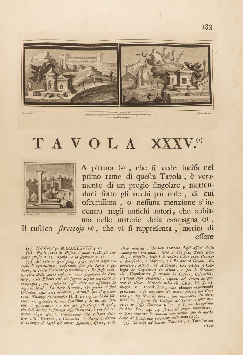 This work was the first published by Stamperia and was the first official book dedicated to the study of Herculaneum. Charles III of Spain, (or Carlo VII, Kingdom of Two Sicilies) ordered the excavation of Herculaneum in 1738 and the Regale Stamperia was formed for the express purpose of publishing the discoveries of the camp. (Mattusch, p.65)