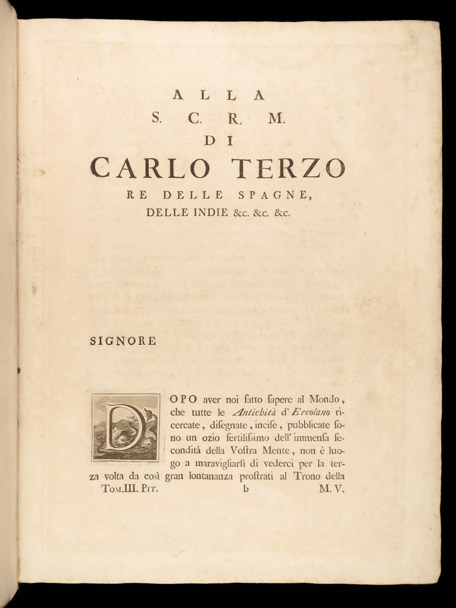 This work was the first published by Stamperia and was the first official book dedicated to the study of Herculaneum. Charles III of Spain, (or Carlo VII, Kingdom of Two Sicilies) ordered the excavation of Herculaneum in 1738 and the Regale Stamperia was formed for the express purpose of publishing the discoveries of the camp. (Mattusch, p.65)