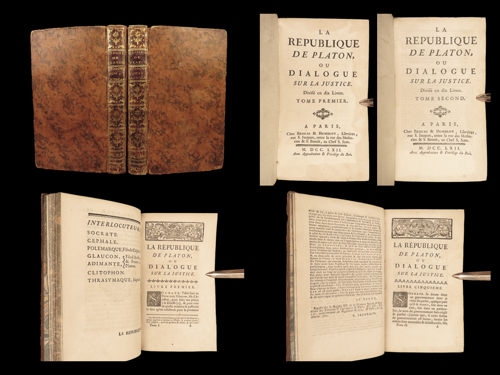 This rare 18th-century edition of the works of Plato was published in Paris by Brocas and Humblot. This two-volume edition of ‘The Republic’ also contains Plato’s dialogue on justice.