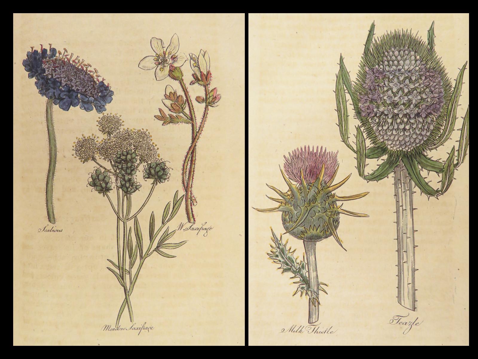 1820 herbal medicine john hill plants flowers botany distillation homeopathy | john hill was an 18<sup>th</sup>-century english botanist who published a number of botanical works including an important family medical book entitled ‘<em>the family herbal</em>’. Seeing reprints for nearly a century after its first edition, this work is filled with direction on growing plants and vegetables, their medical properties, preservation of roots, leaves, seeds, and flowers, recipes for distillation and medical syrups, and much more. And while the contents of this work are highly interesting, the most desirable aspect of this work is the abundance of beautiful, full-page color engravings throughout.