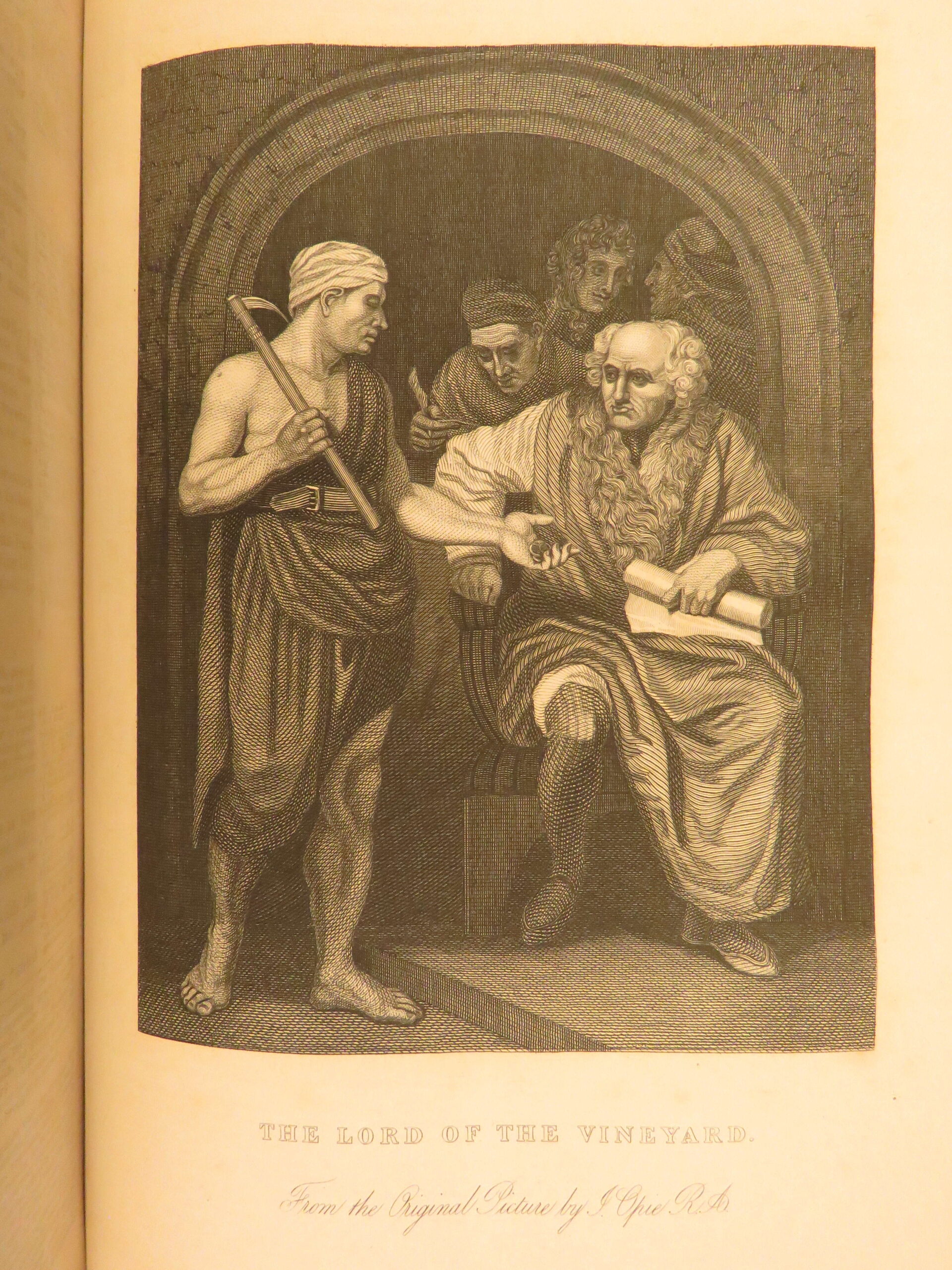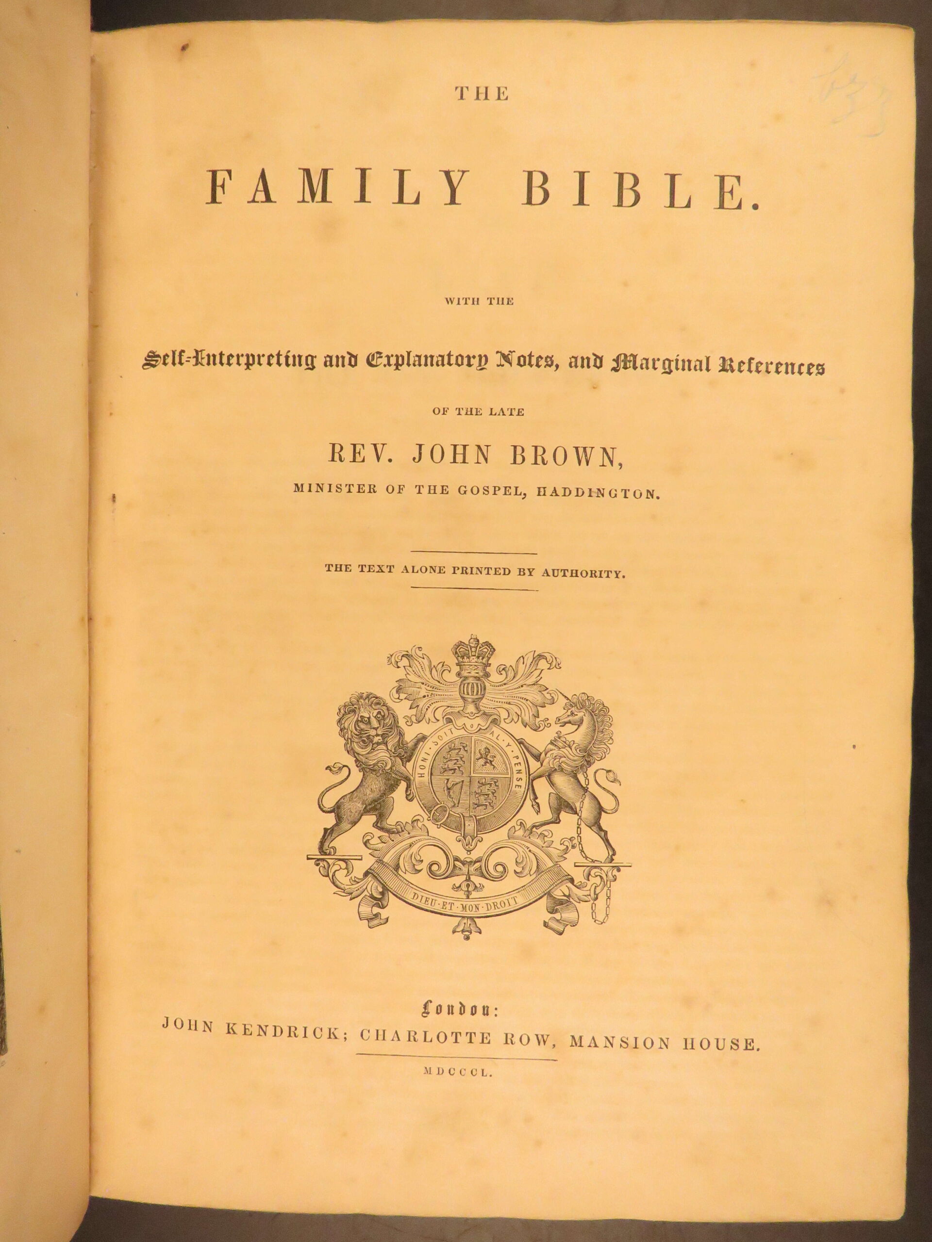 A mid-Victorian family Bible published in London in 1850, containing both Testaments with commentary by John Brown, beautifully bound.