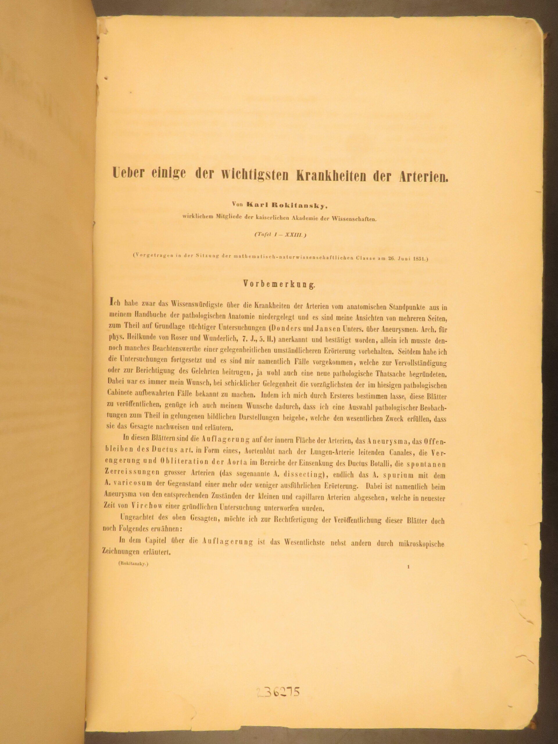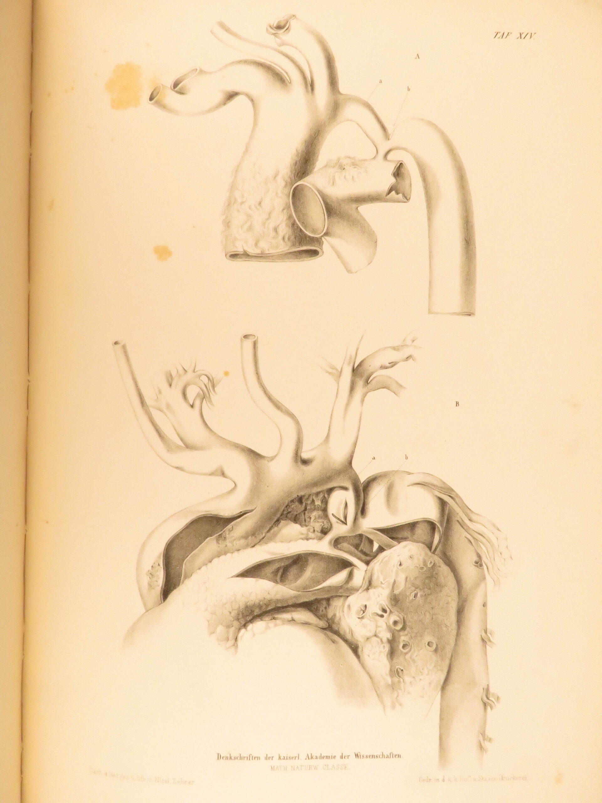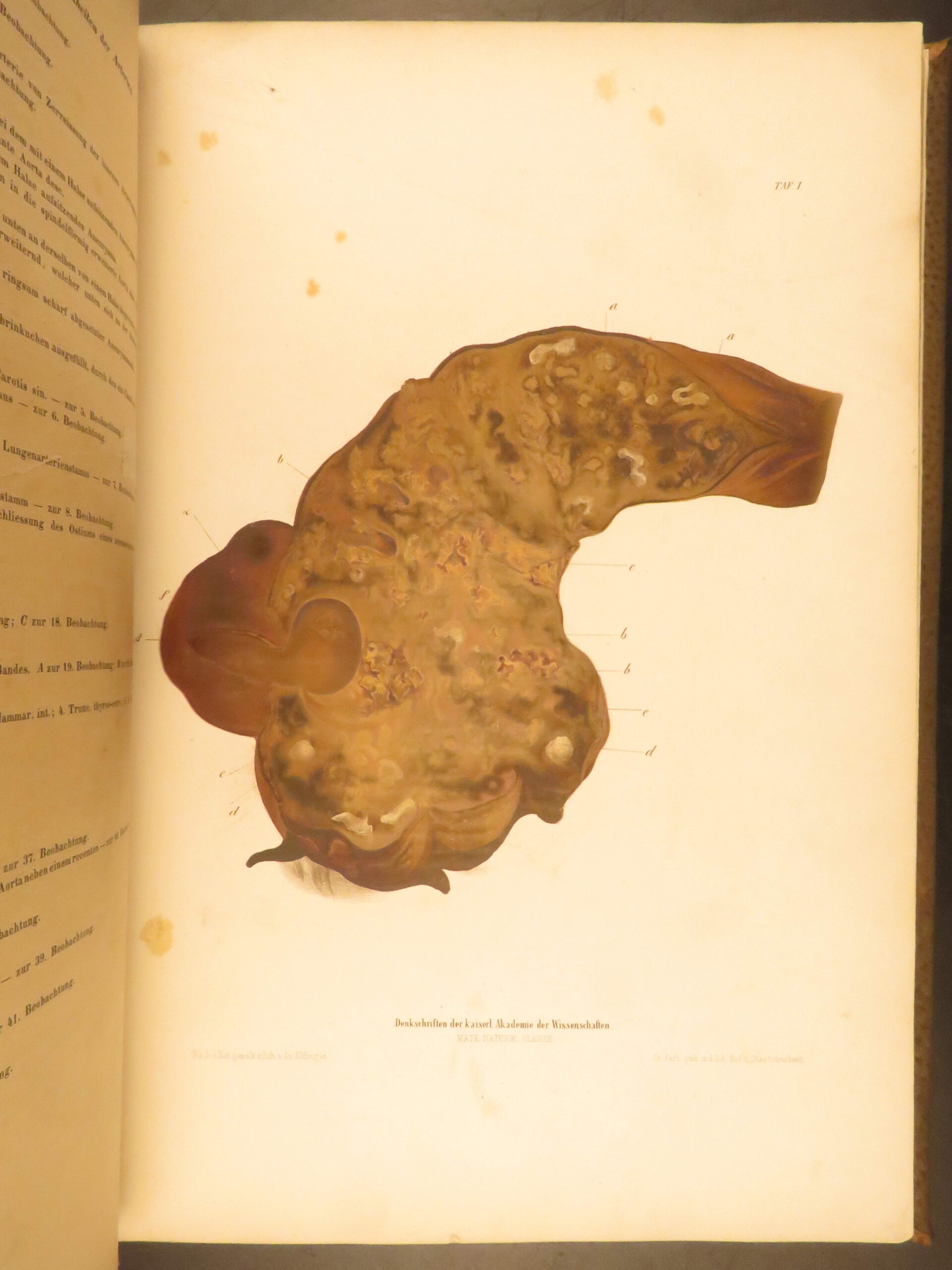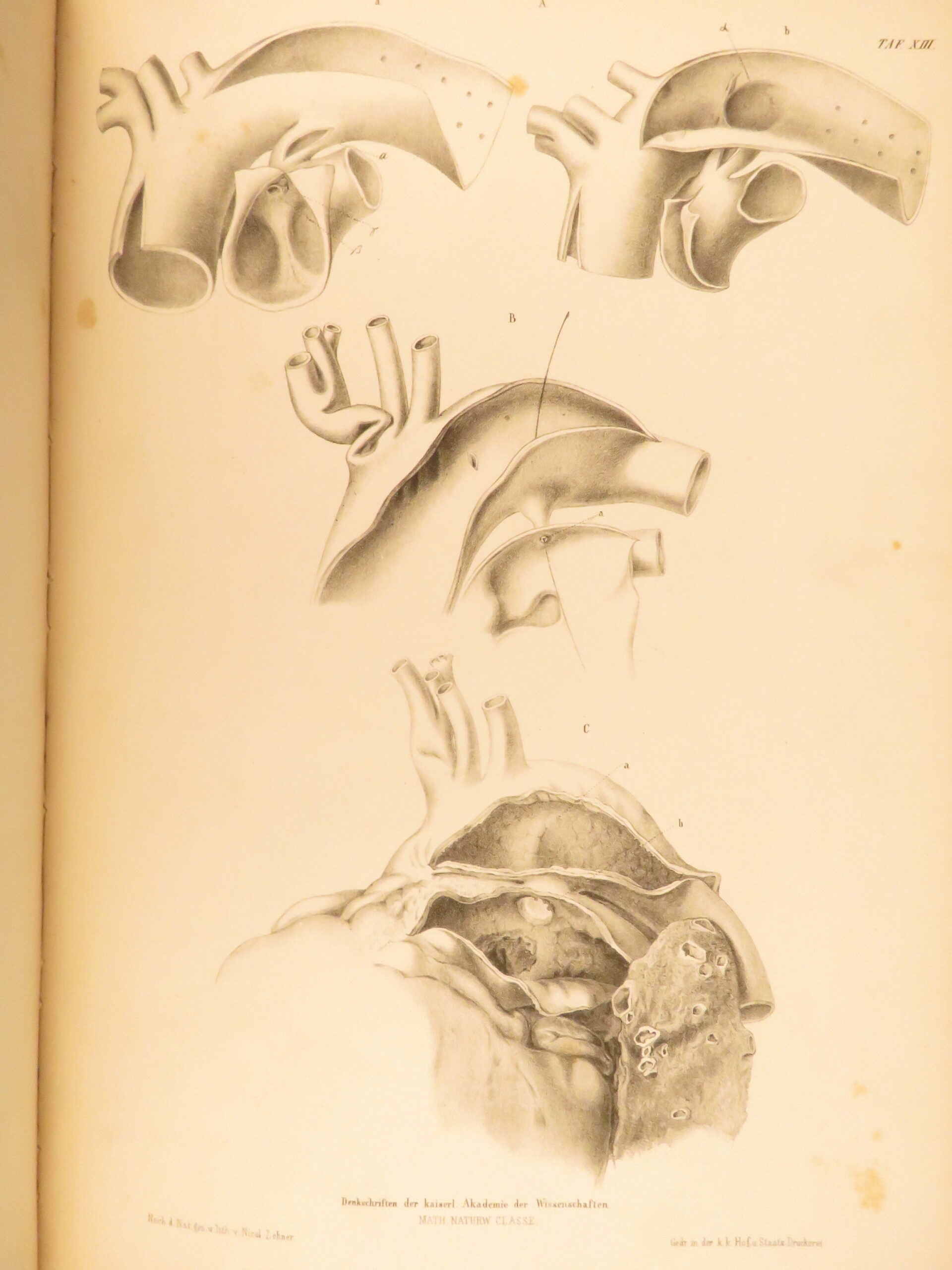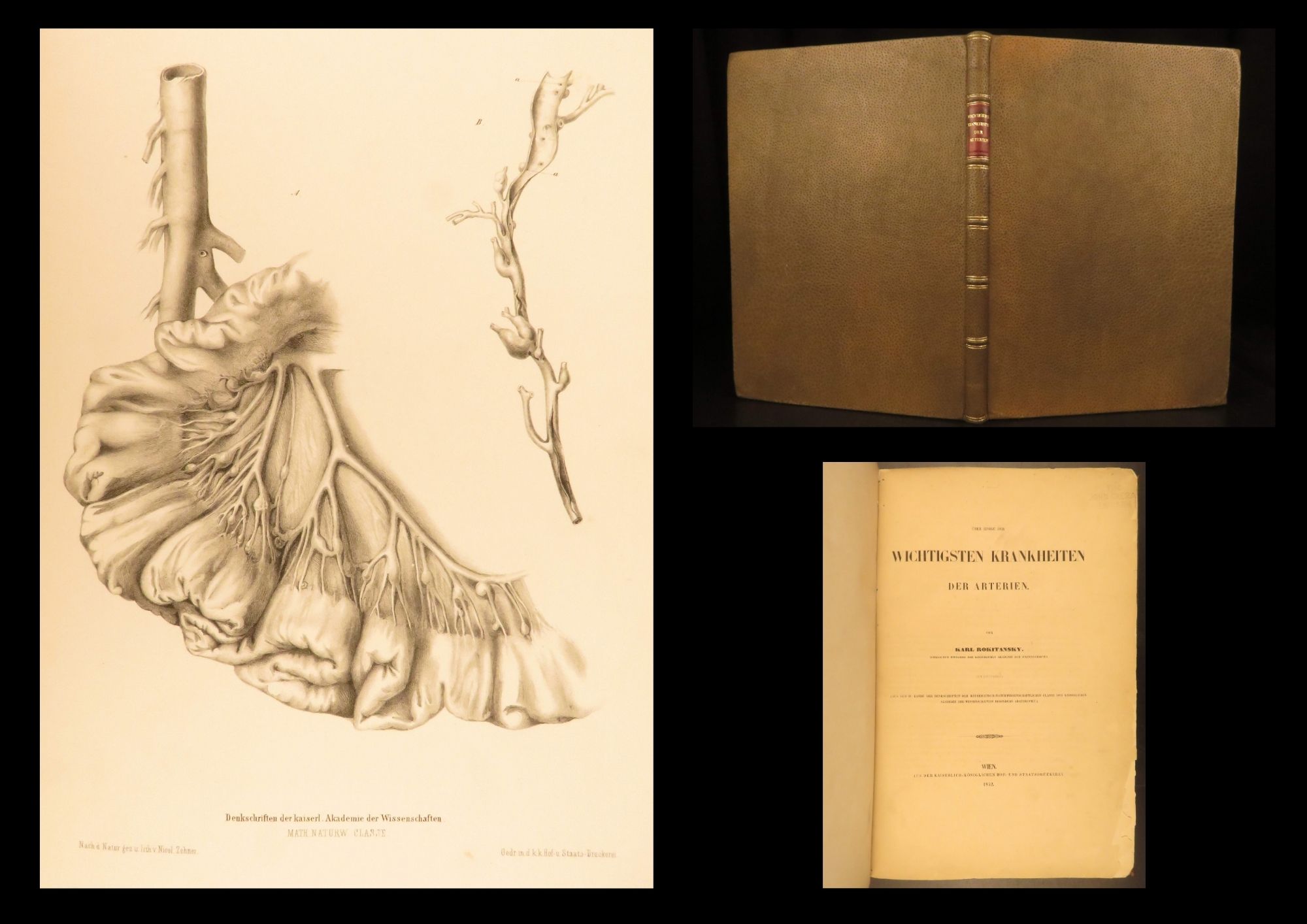 1852 rokitansky diseases of arteries medicine surgery illustrated german folio |   carl von rokitansky was a 19<sup>th</sup>-century austrian physician who, in addition to establishing schools of medicine, was a key figure in developing diagnostic methods using science. It was through his own methods of testing and experimenting that he was able to identify some of the most common diseases of the arteries. In his book “diseases of the arteries”, rokitansky describes his autopsy methods for looking at and describing arteries. First published in 1851, this book was a massive success and proved to be a reliable resource for physicians treating arterial diseases. This 1852 folio of rokitansky’s ‘arteries’ includes 23 full-page engravings. While 19<sup>th</sup>-century medical folios are rare in themselves, a work specifically focused on arteries is considerably more exclusive.   item number: #26163 price: $750
