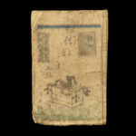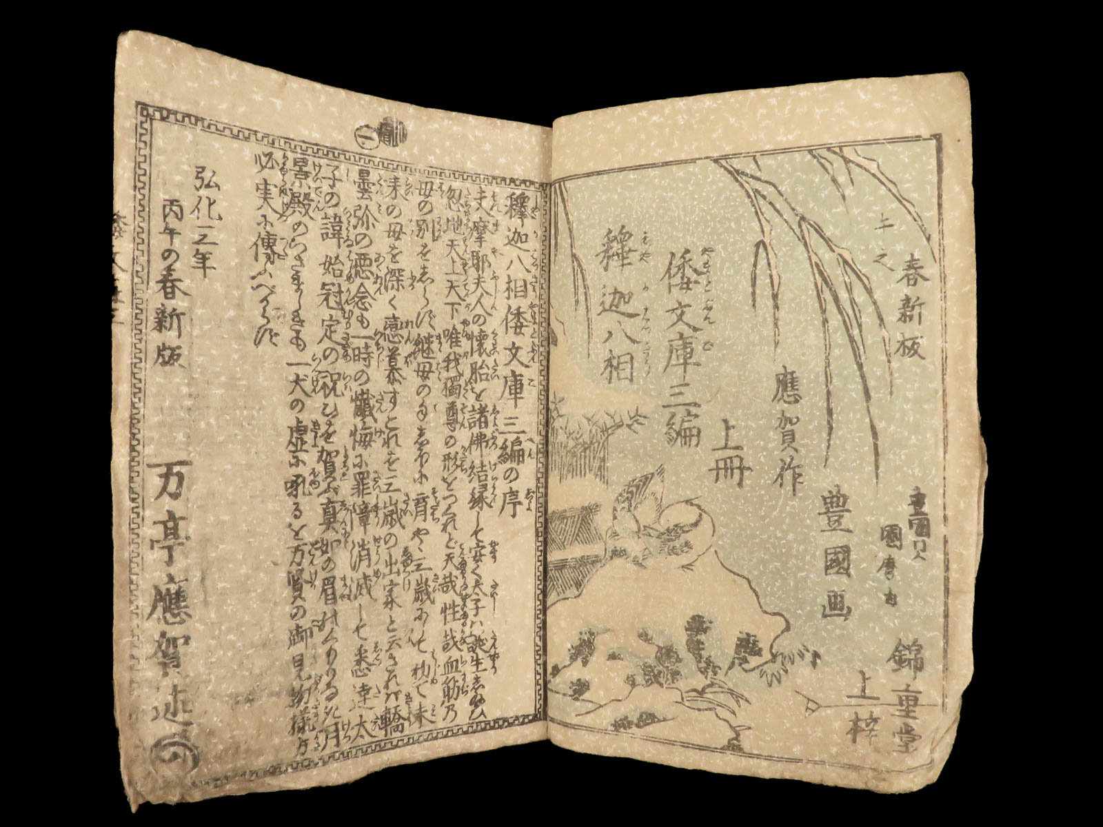 A rare, 19th-century Japanese woodblock print of ‘Shaka Hassou Yamato Bunko,’ a biography of Buddha by Mantei Oga, illustrated by Utagawa Kunisada. The book uses the “eight phases” of Buddha’s life to teach important points and entertain the general populace about Shaka’s life, who is known in Japan as Shakamuni. Kunisada’s illustrations are highly praised for their expressive style and attention to detail. The book is considered a masterpiece of Japanese kusazoshi, a type of Japanese illustrated book from the Edo era, literature and reflects the popularity of Buddhism during the Edo period.