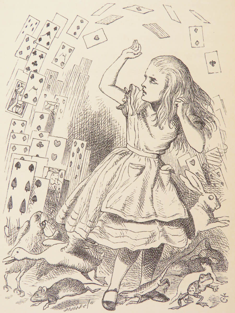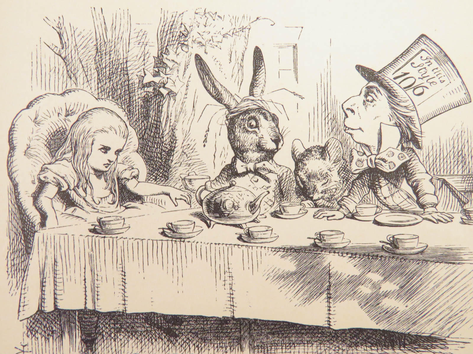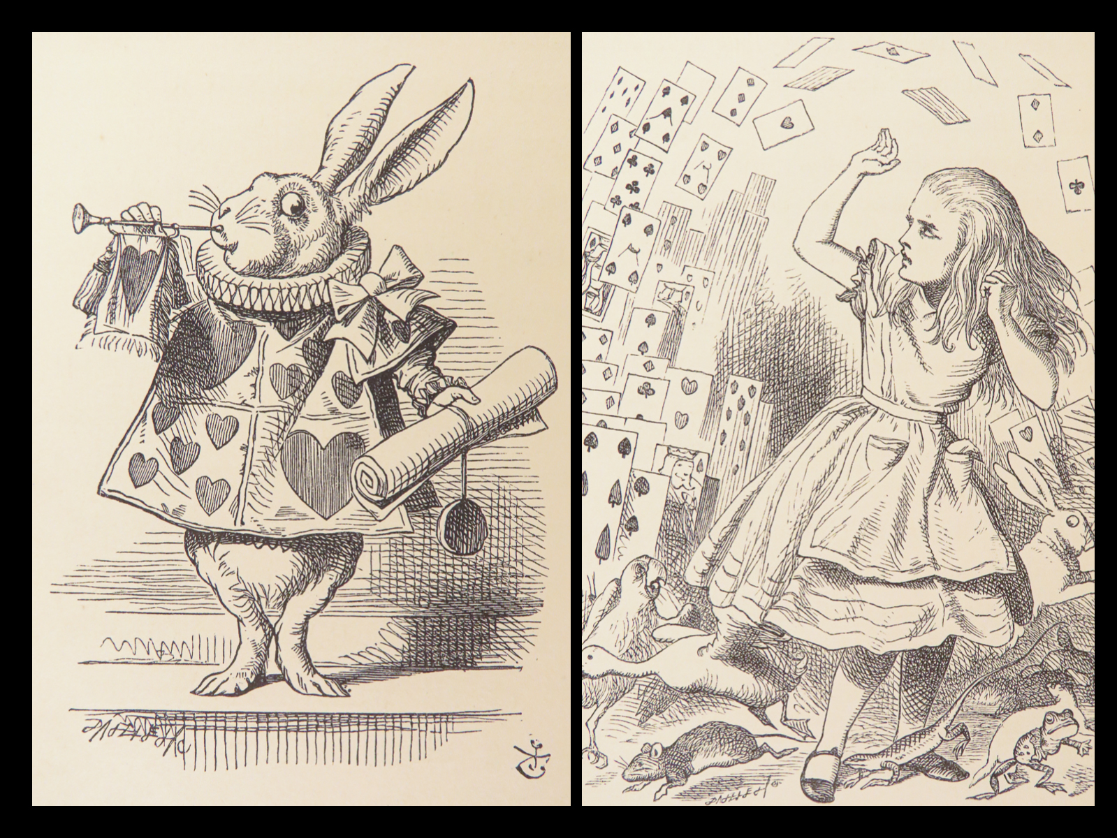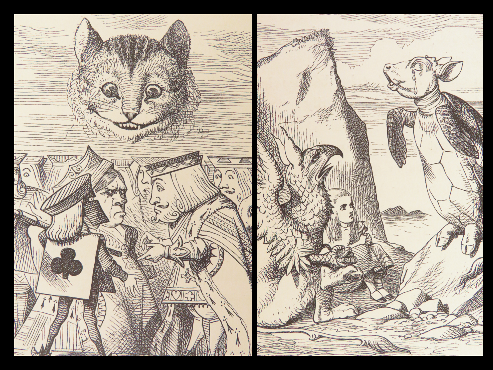 - PMM: “Alice’s Adventures in Wonderland and its hardly less famous sequel Through the Looking Glass (1872), although ostensibly written for children are unique among ‘juveniles’ in appealing equally if not more strongly to adults. Written by an Oxford don, a clergyman, and a professional mathematician, they abound in characters—the White Knight, the Red Queen, the Mad Hatter, Humpty Dumpty—who are part of everybody’s mental furniture. And the philosophic profundity of scores, if not hundreds, of these characters’ observations, long household words wherever English is spoken, gains mightily from the delicious fantasy of their setting”