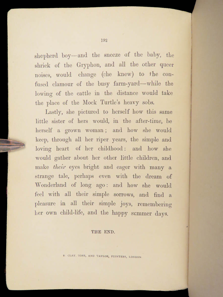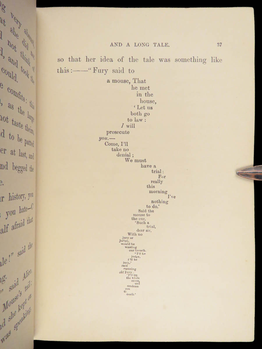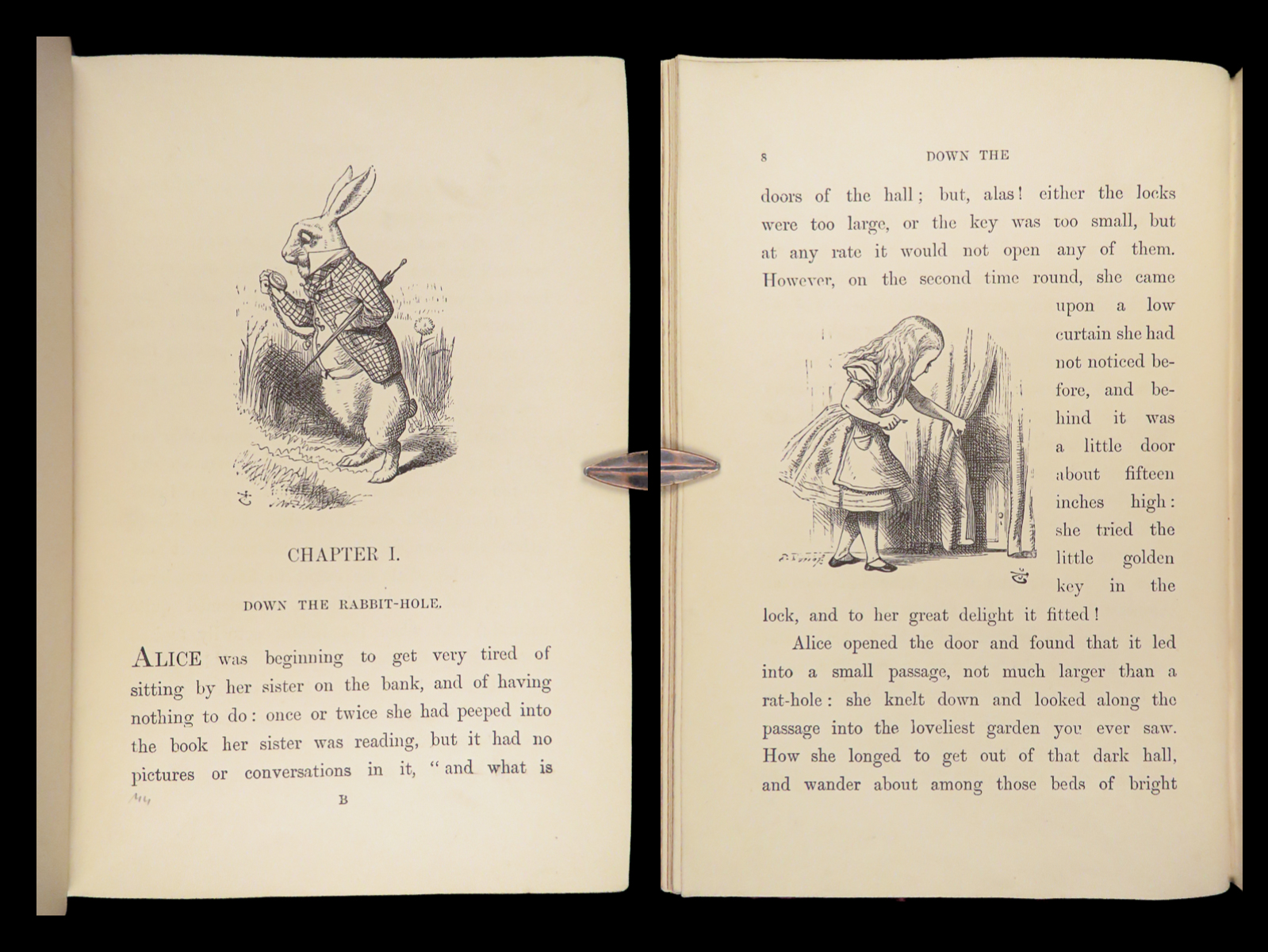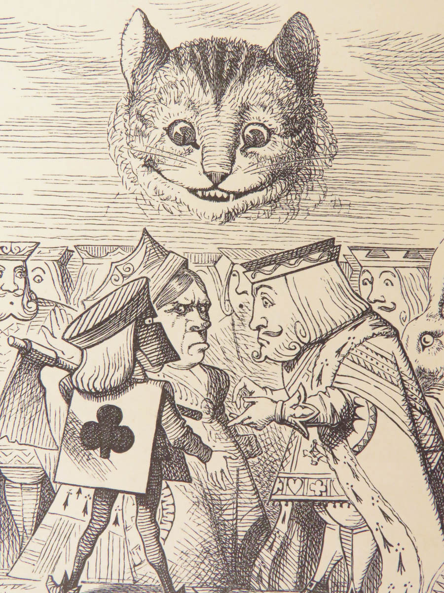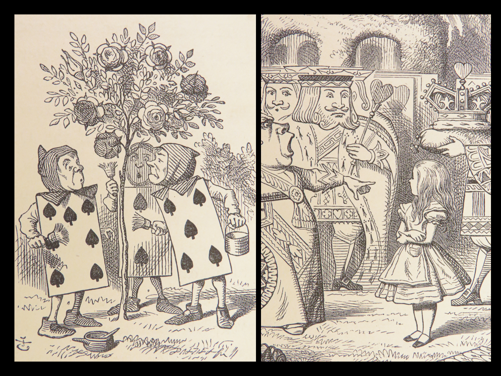 - PMM: “Alice’s Adventures in Wonderland and its hardly less famous sequel Through the Looking Glass (1872), although ostensibly written for children are unique among ‘juveniles’ in appealing equally if not more strongly to adults. Written by an Oxford don, a clergyman, and a professional mathematician, they abound in characters—the White Knight, the Red Queen, the Mad Hatter, Humpty Dumpty—who are part of everybody’s mental furniture. And the philosophic profundity of scores, if not hundreds, of these characters’ observations, long household words wherever English is spoken, gains mightily from the delicious fantasy of their setting”