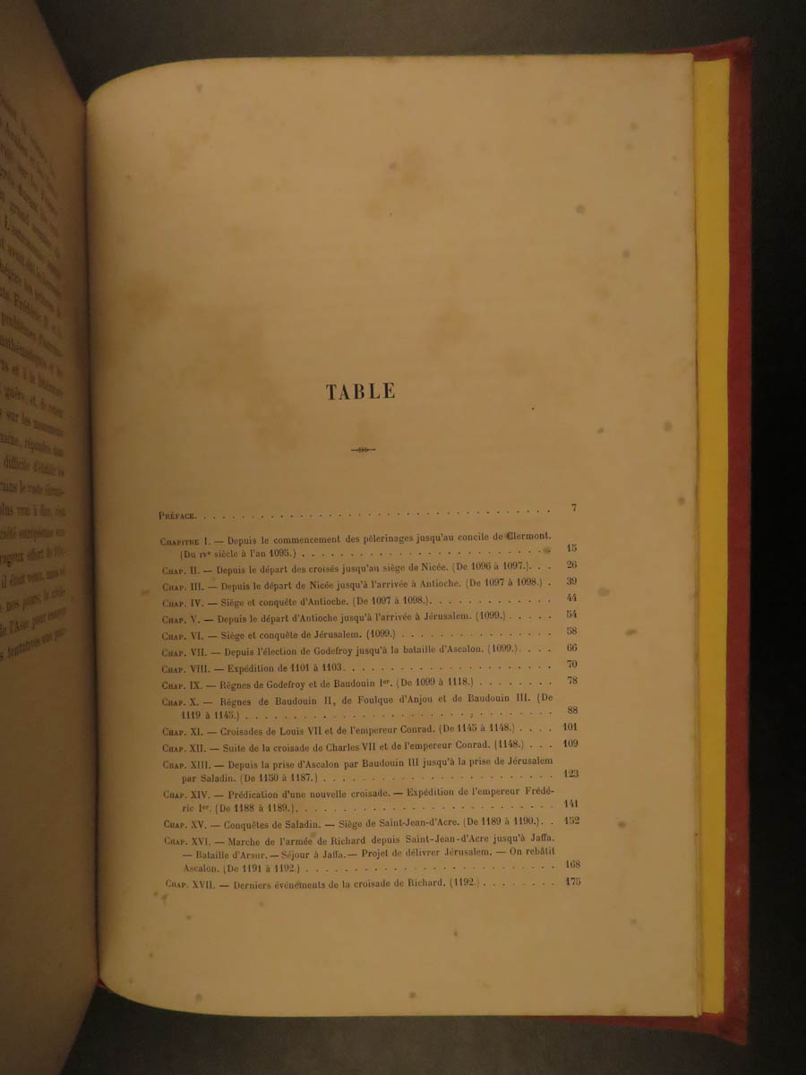 A rare, 19th-century printing of Joseph-François Michaud’s “History of the Crusades”. Michaud’s principal work discusses the beginning of the crusades through the Council of Clermont. It covers the departure of crusaders after the Council of Nicee, the Siege of Antioch, Election of Godefroy, Battle of Ascalon, reign of Baudouin II, conquests of Saladin, and the events designed to protect Jerusalem from a fall…
