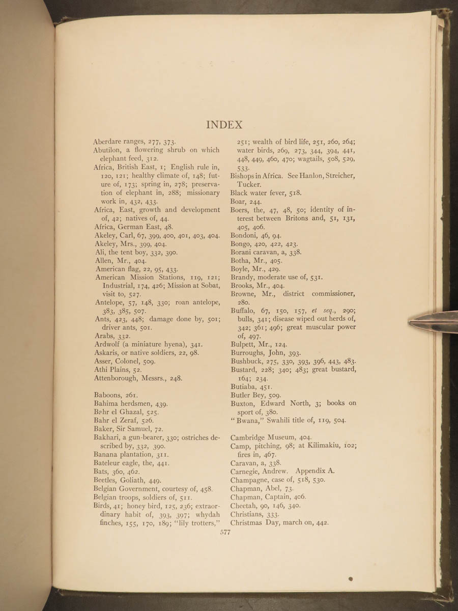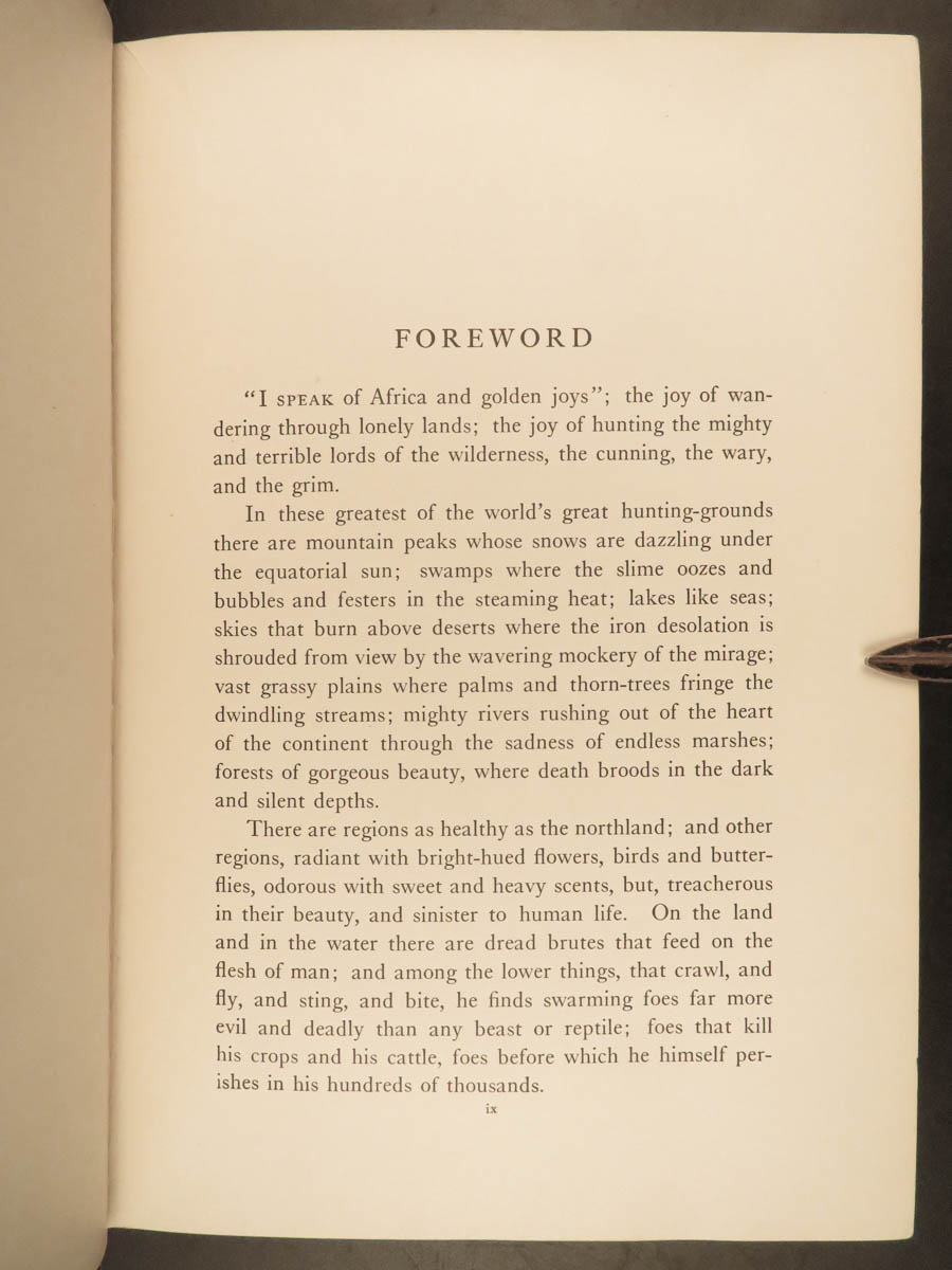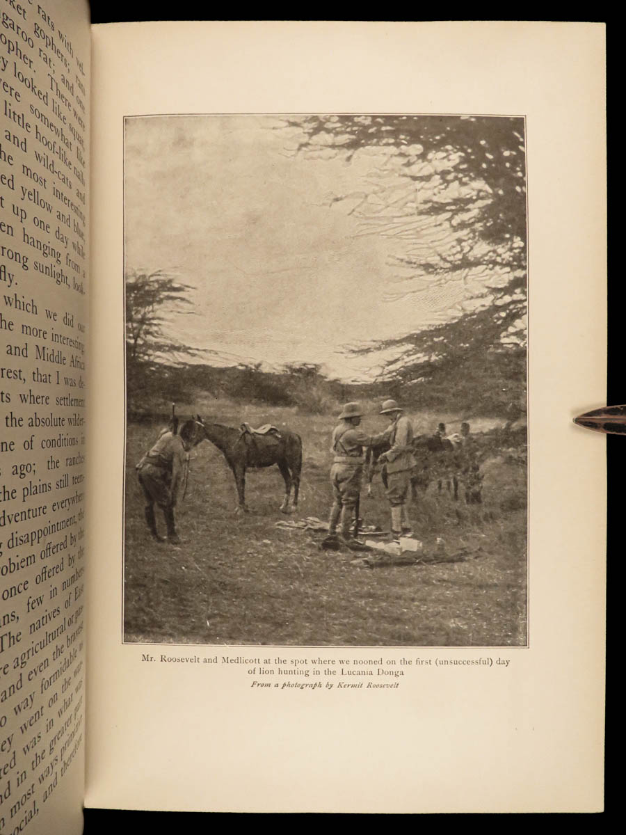 In this 1910 first edition, Roosevelt describes the excitement of the chase, the people he met, as well as the flora and fauna he collected in the name of science. Long out of print, this classic is one of the preeminent examples of Africana and belongs on every collector’s shelf.
