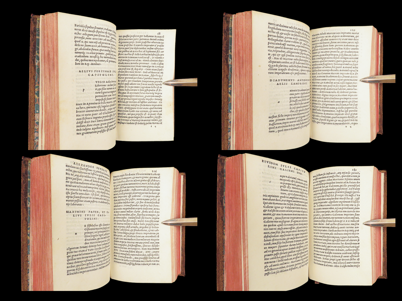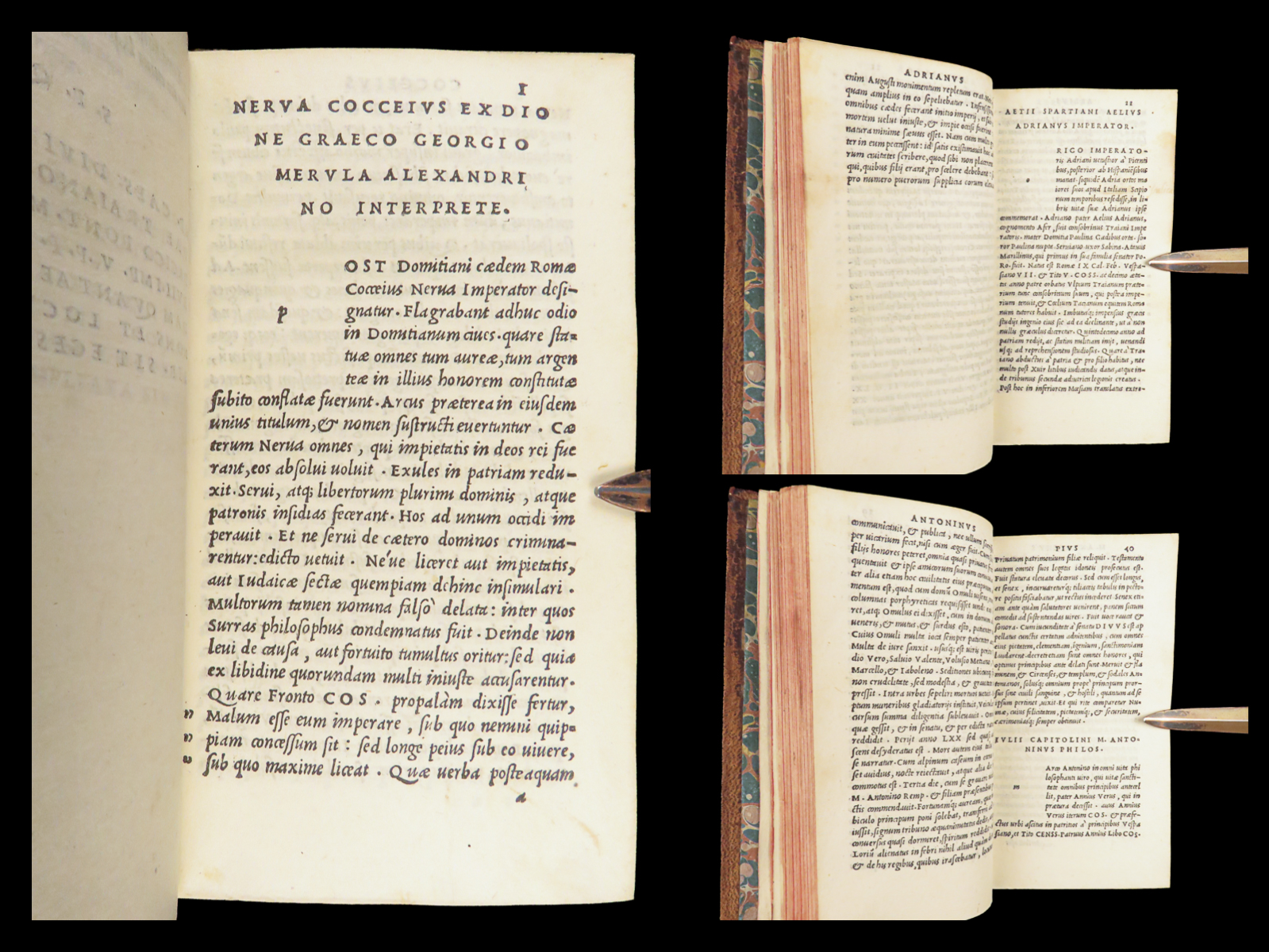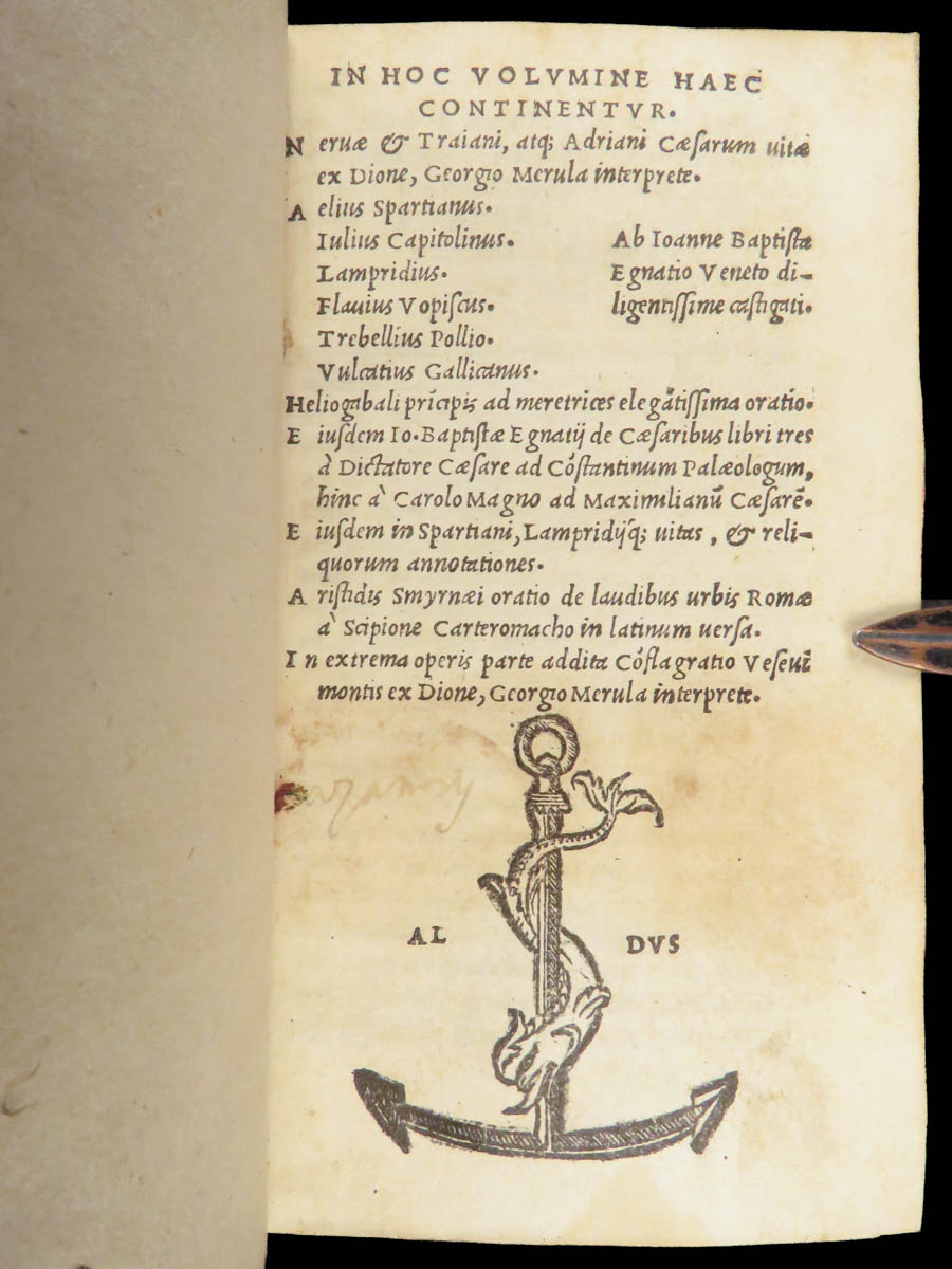 In hoc volumine haec continentur… edited by Giovanni Battista Egnazio, was published by Aldus Manutius in 1519. Aldine brings together a remarkable set of Roman imperial biographies and speeches. Notable works include extracts from Cassius Dio’s lives of Nerva, Trajan, and Hadrian; selections from the often controversial Historia Augusta biographies; and rhetorical writings once attributed to Heliogabalus. It also includes Egnazio’s own De Caesaribus. It is, however, the inclusion of Aelius Aristides’ Oration on Rome and a description of the eruption of Vesuvius that make this work so desirable.