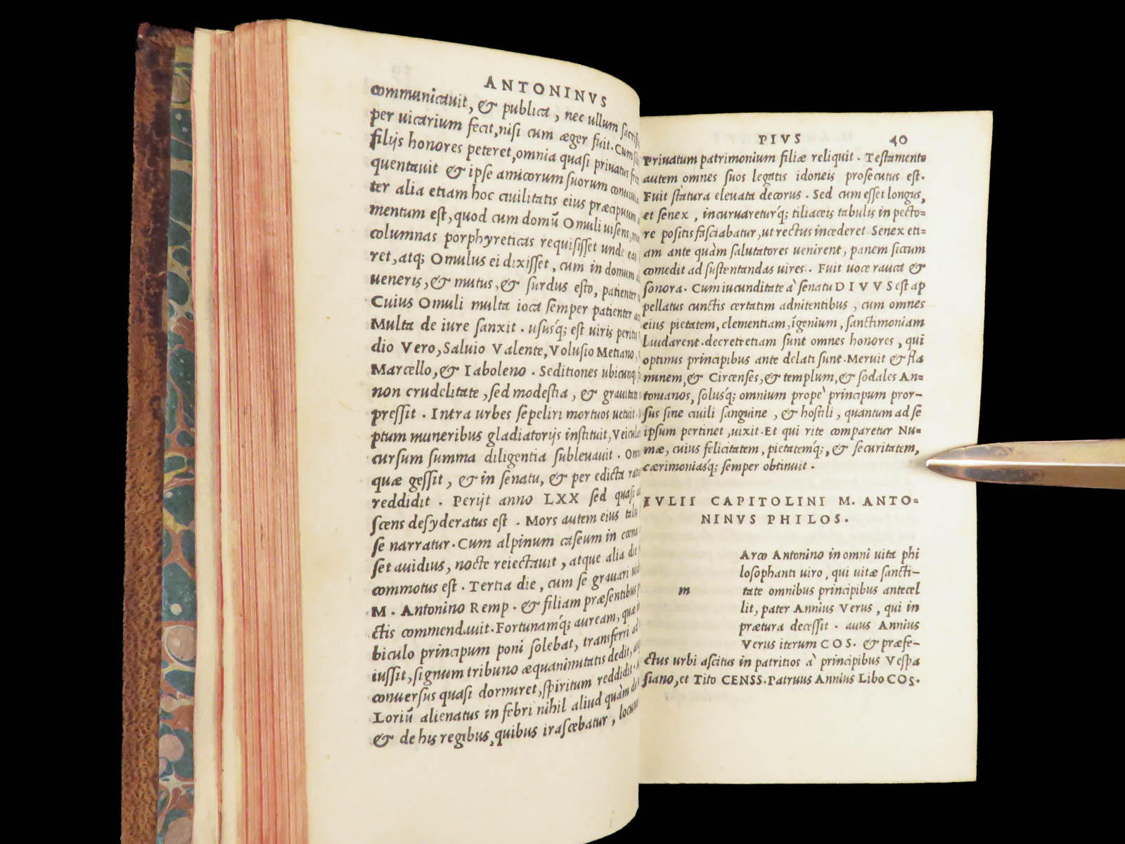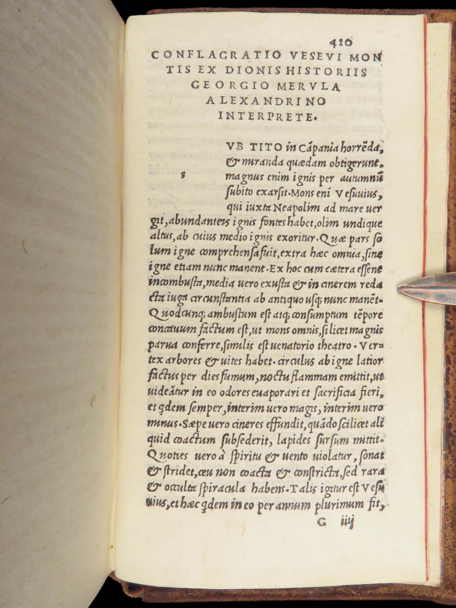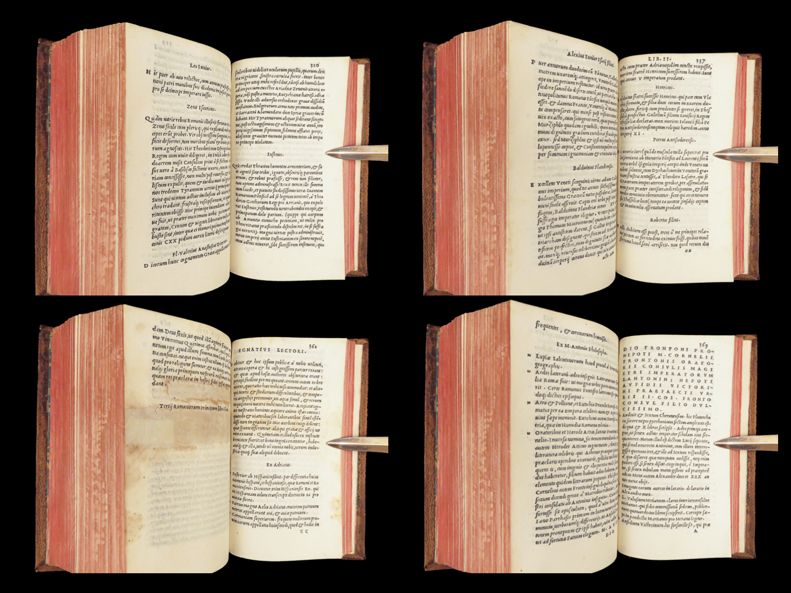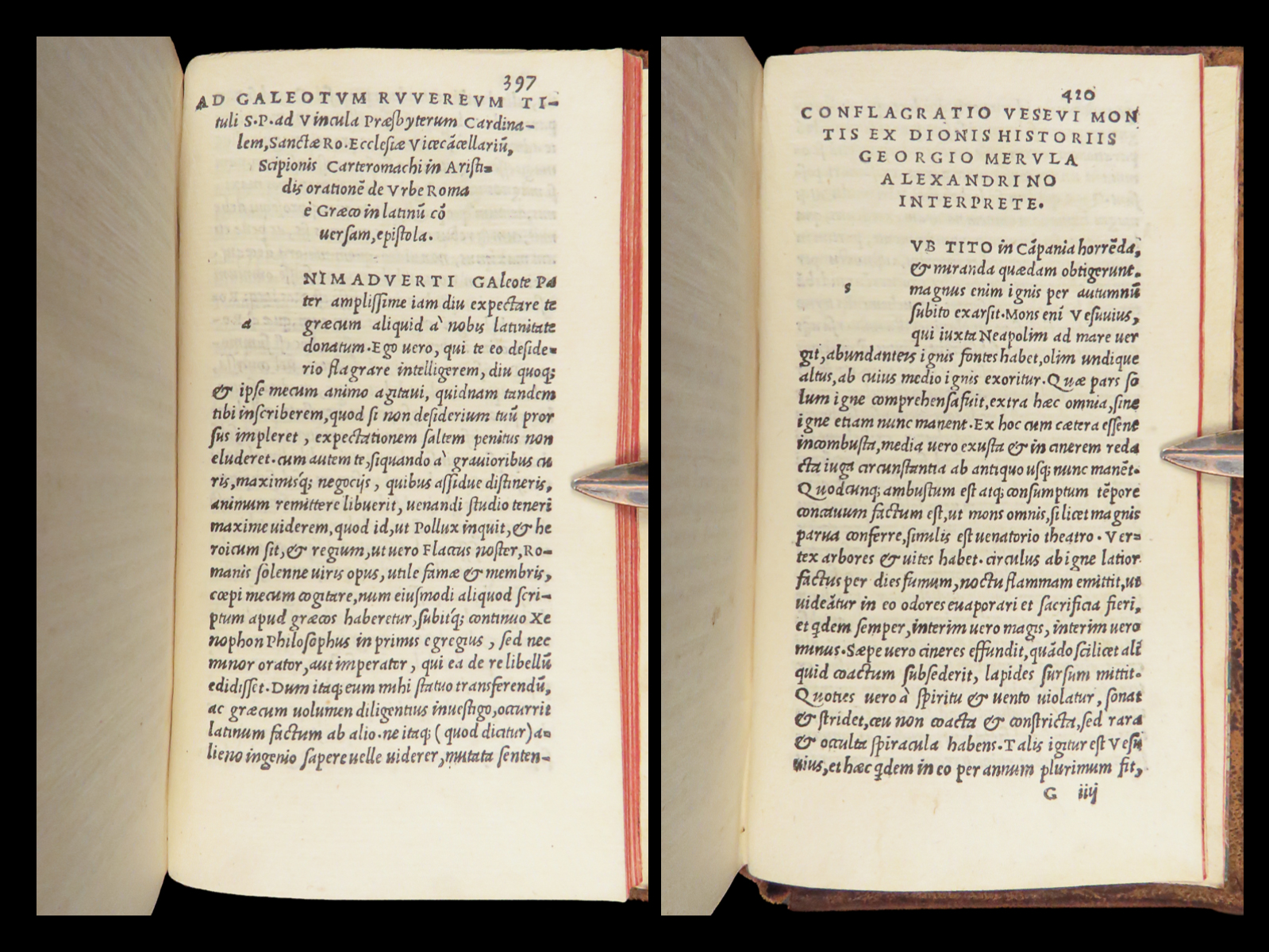 In hoc volumine haec continentur… edited by Giovanni Battista Egnazio, was published by Aldus Manutius in 1519. Aldine brings together a remarkable set of Roman imperial biographies and speeches. Notable works include extracts from Cassius Dio’s lives of Nerva, Trajan, and Hadrian; selections from the often controversial Historia Augusta biographies; and rhetorical writings once attributed to Heliogabalus. It also includes Egnazio’s own De Caesaribus. It is, however, the inclusion of Aelius Aristides’ Oration on Rome and a description of the eruption of Vesuvius that make this work so desirable.