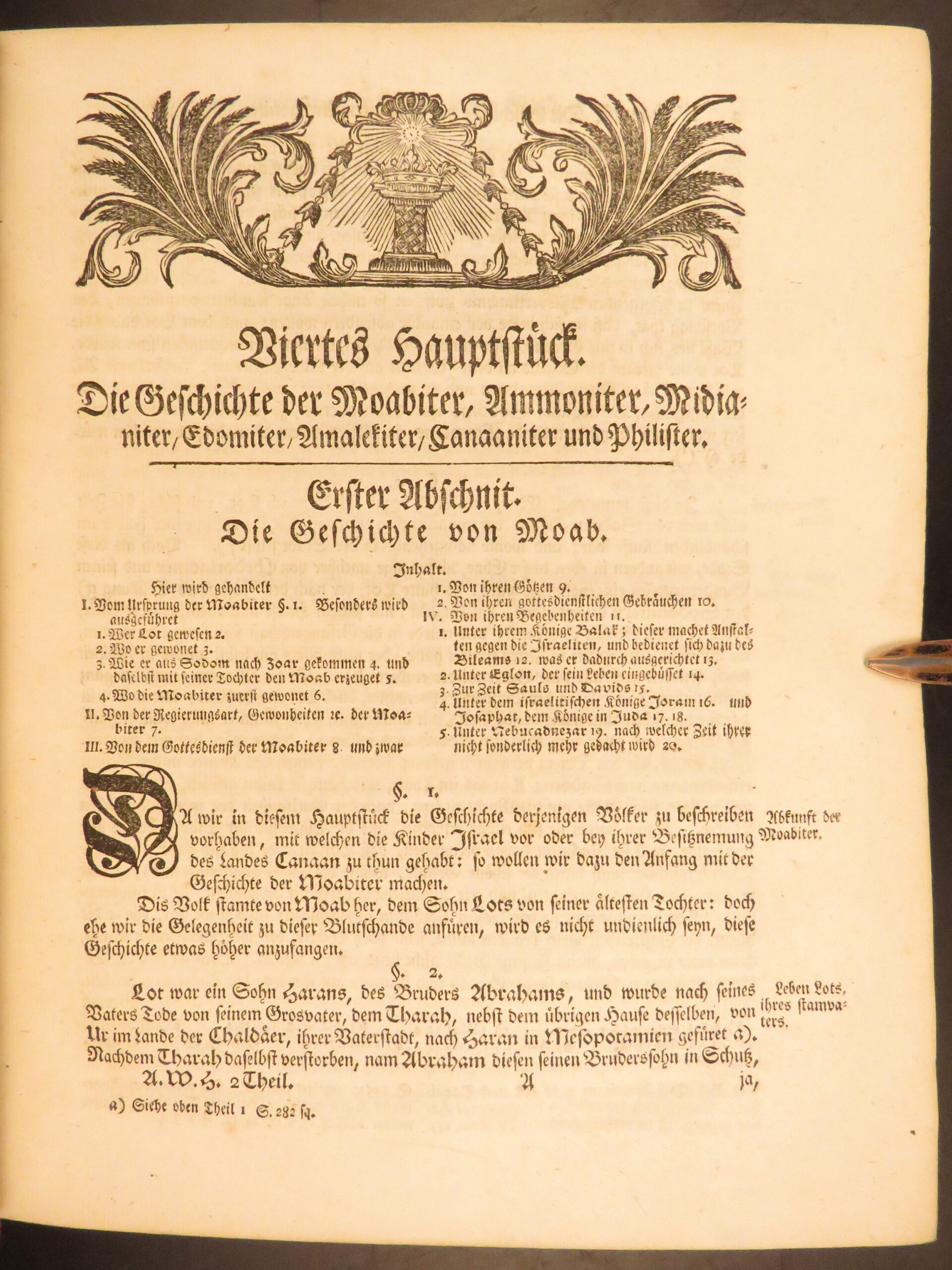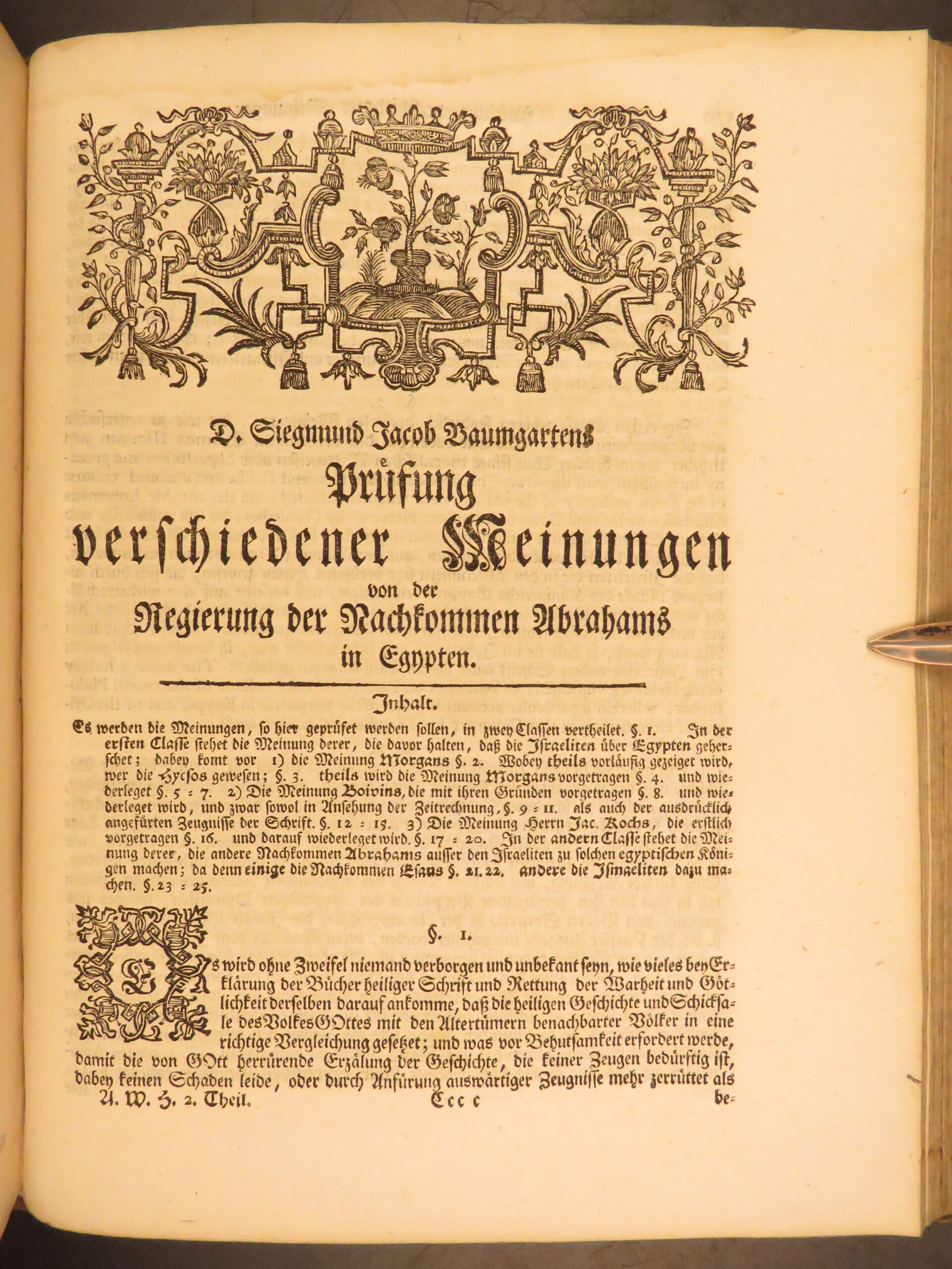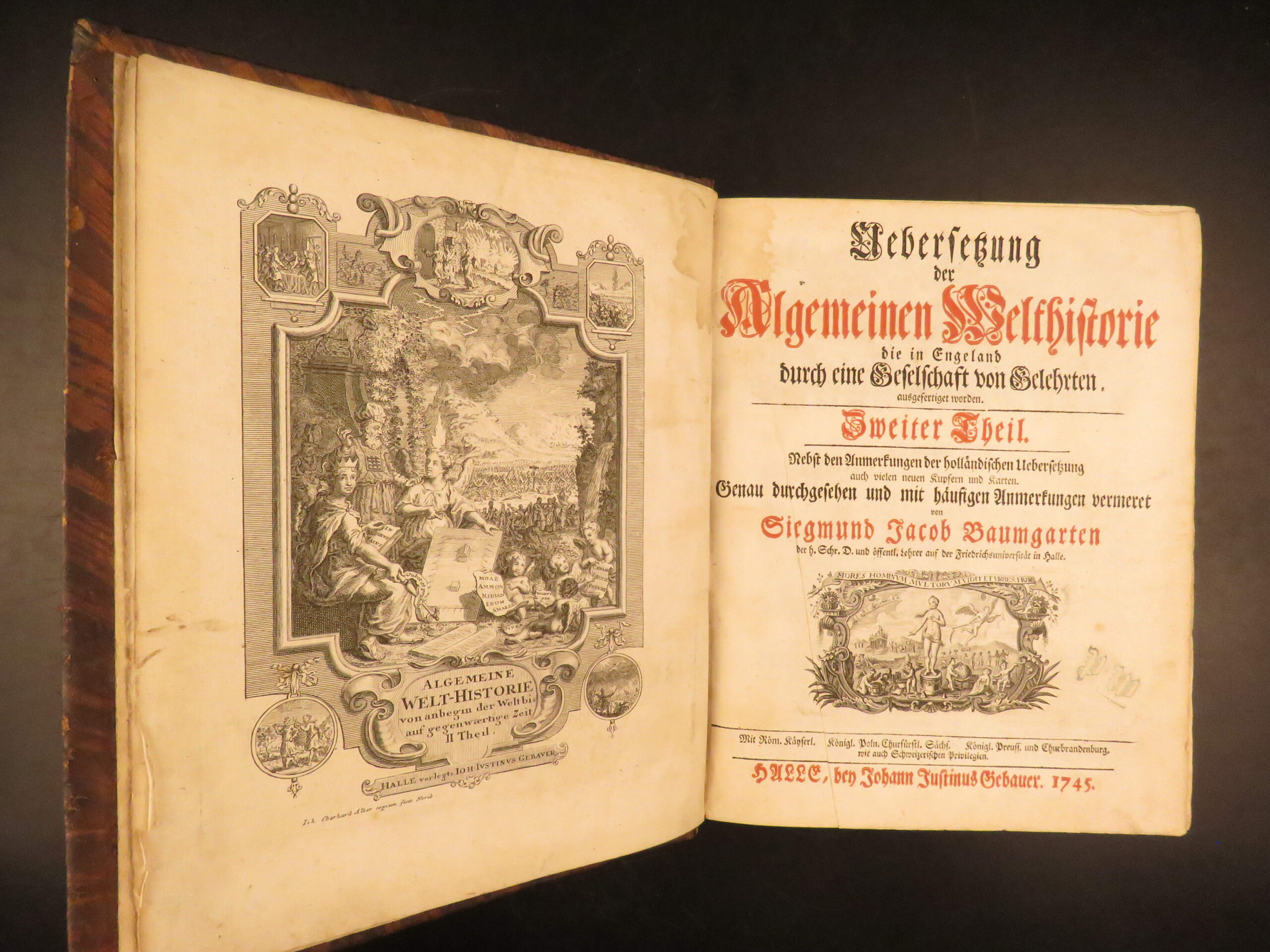 1745 first edition of Uebersetzung der Algemeinen Welthistorie edited by Baumgarten and Semler. German translation of English historical scholarship covering Exodus history, ancient Near Eastern peoples, and classical antiquities with ten engraved plates.