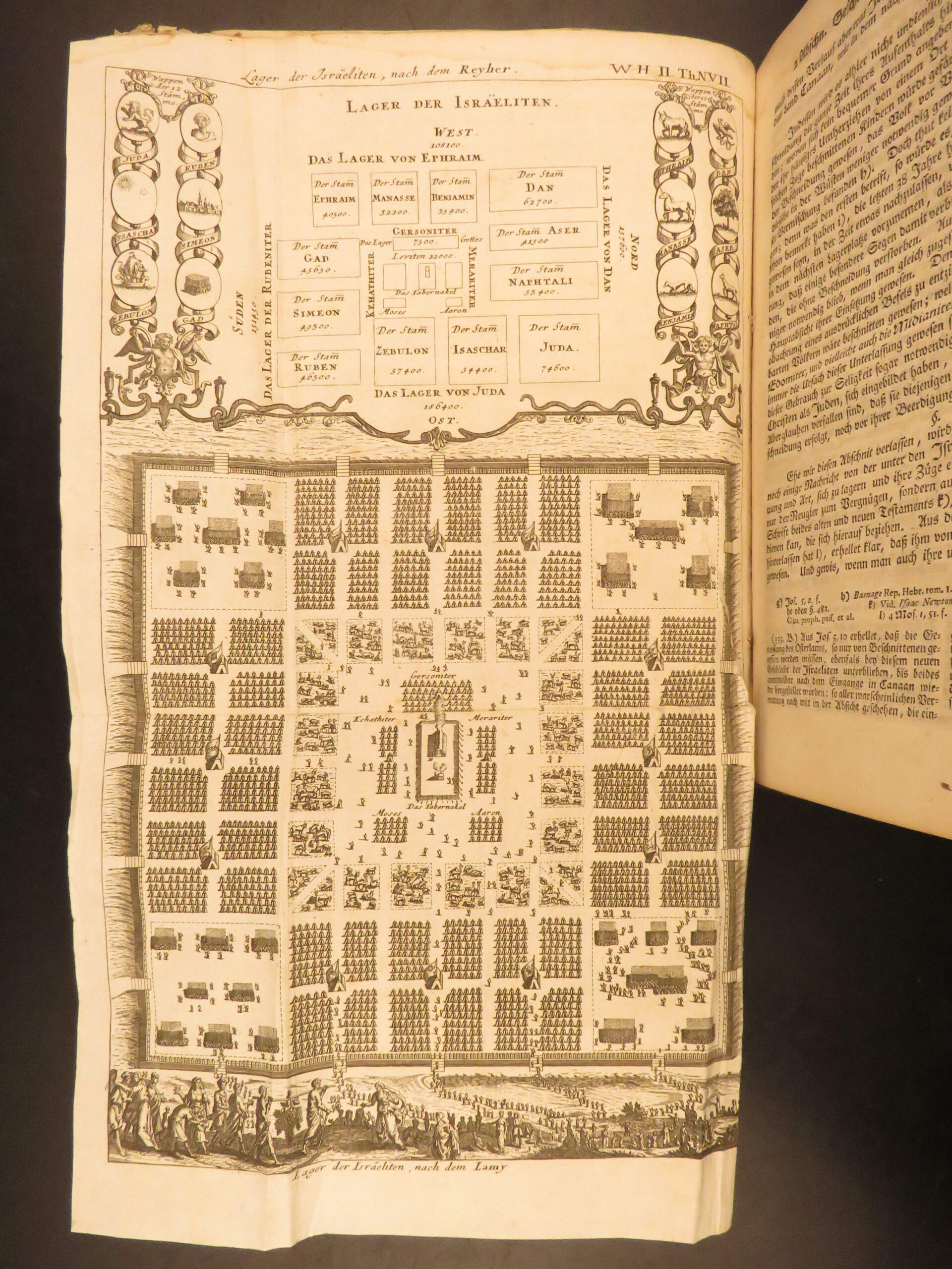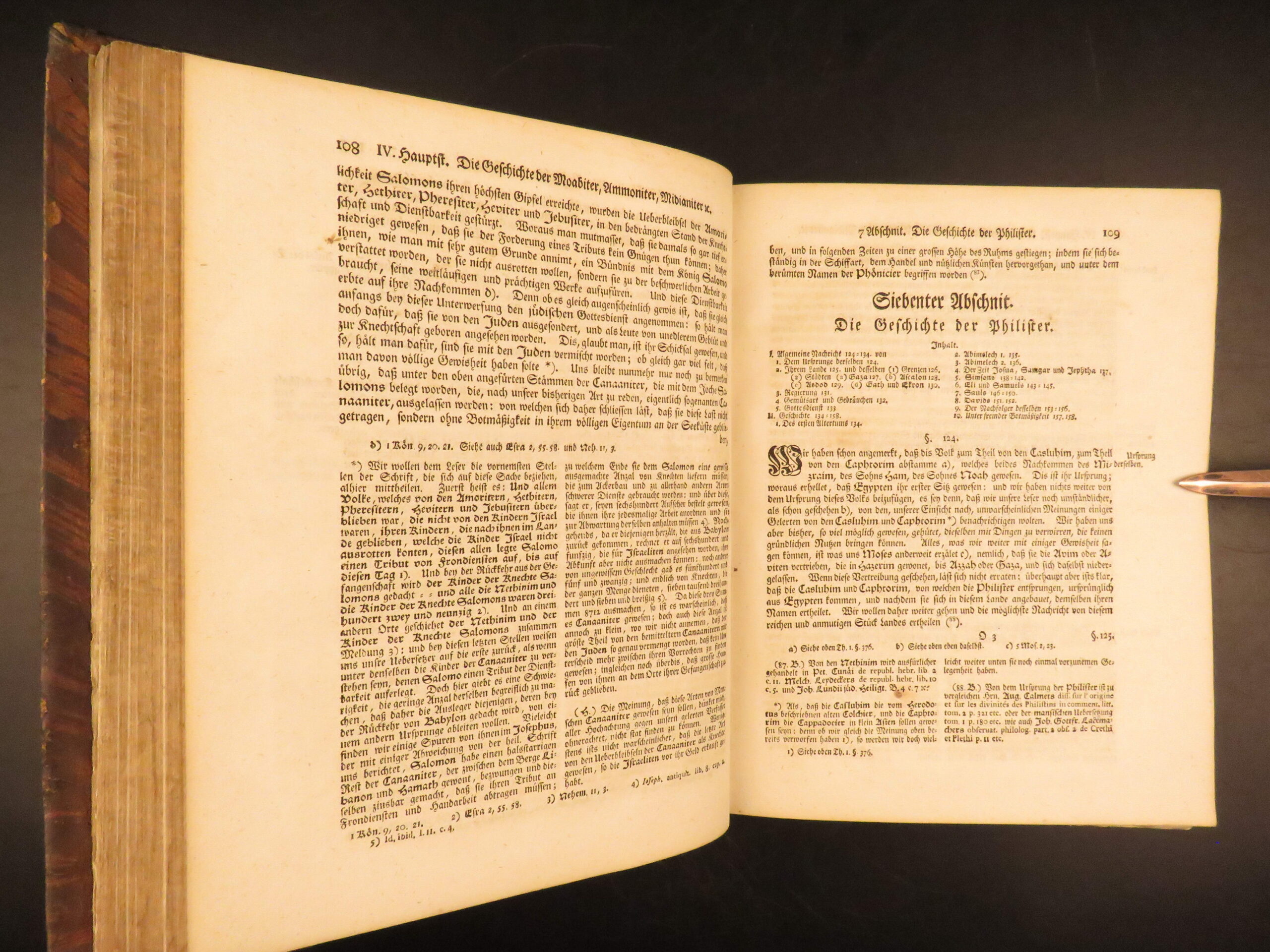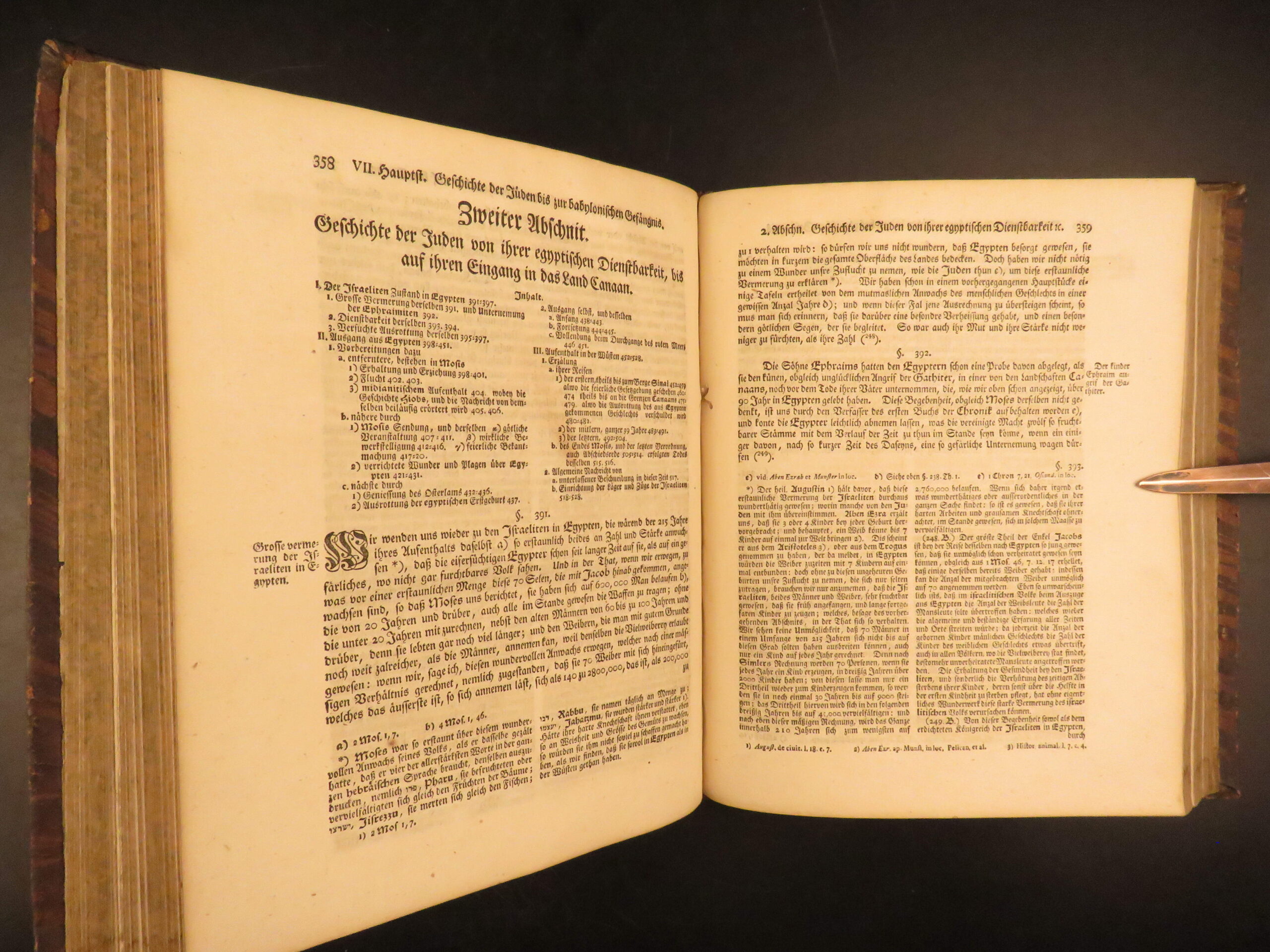 1745 first edition of Uebersetzung der Algemeinen Welthistorie edited by Baumgarten and Semler. German translation of English historical scholarship covering Exodus history, ancient Near Eastern peoples, and classical antiquities with ten engraved plates.
