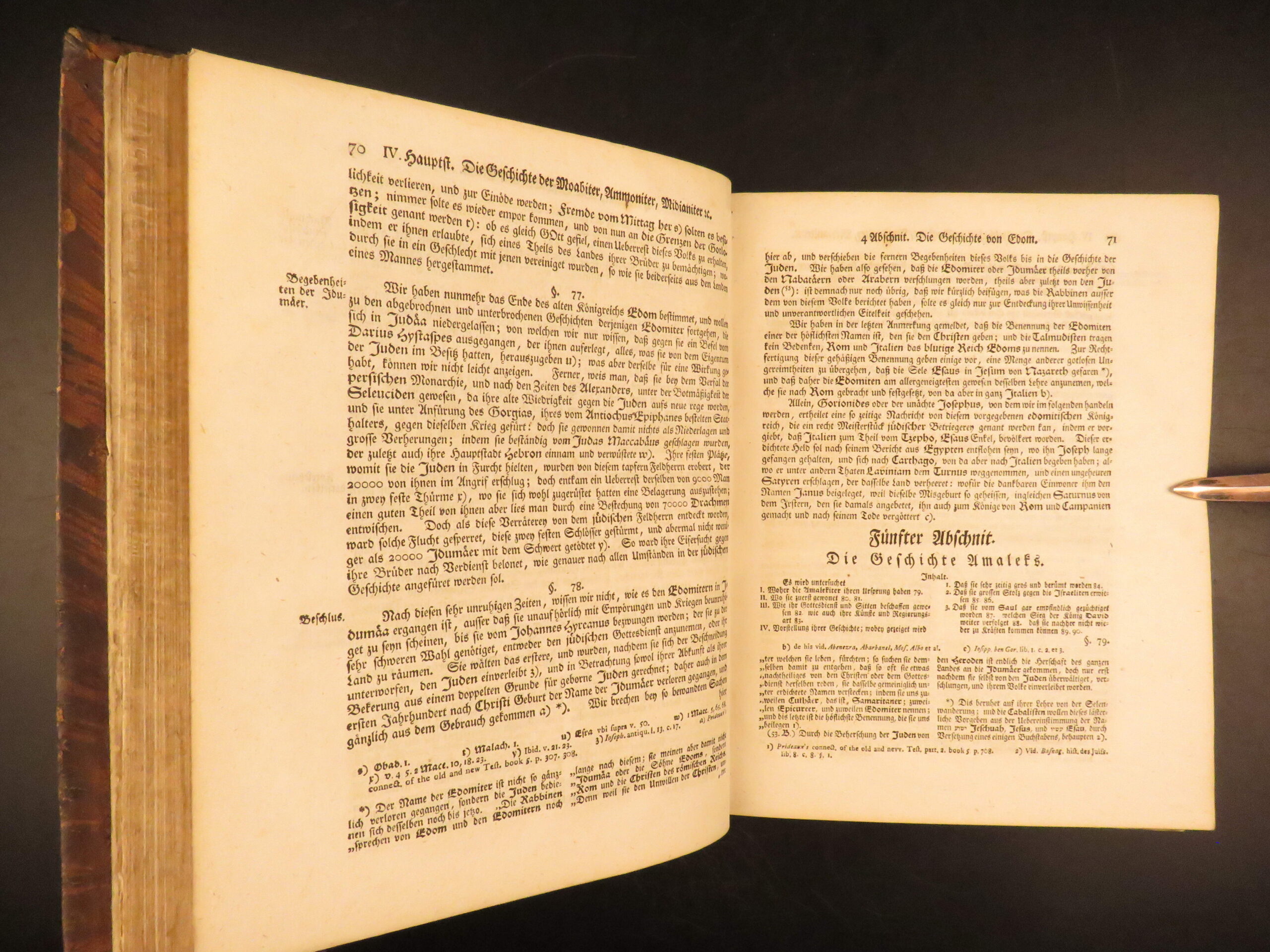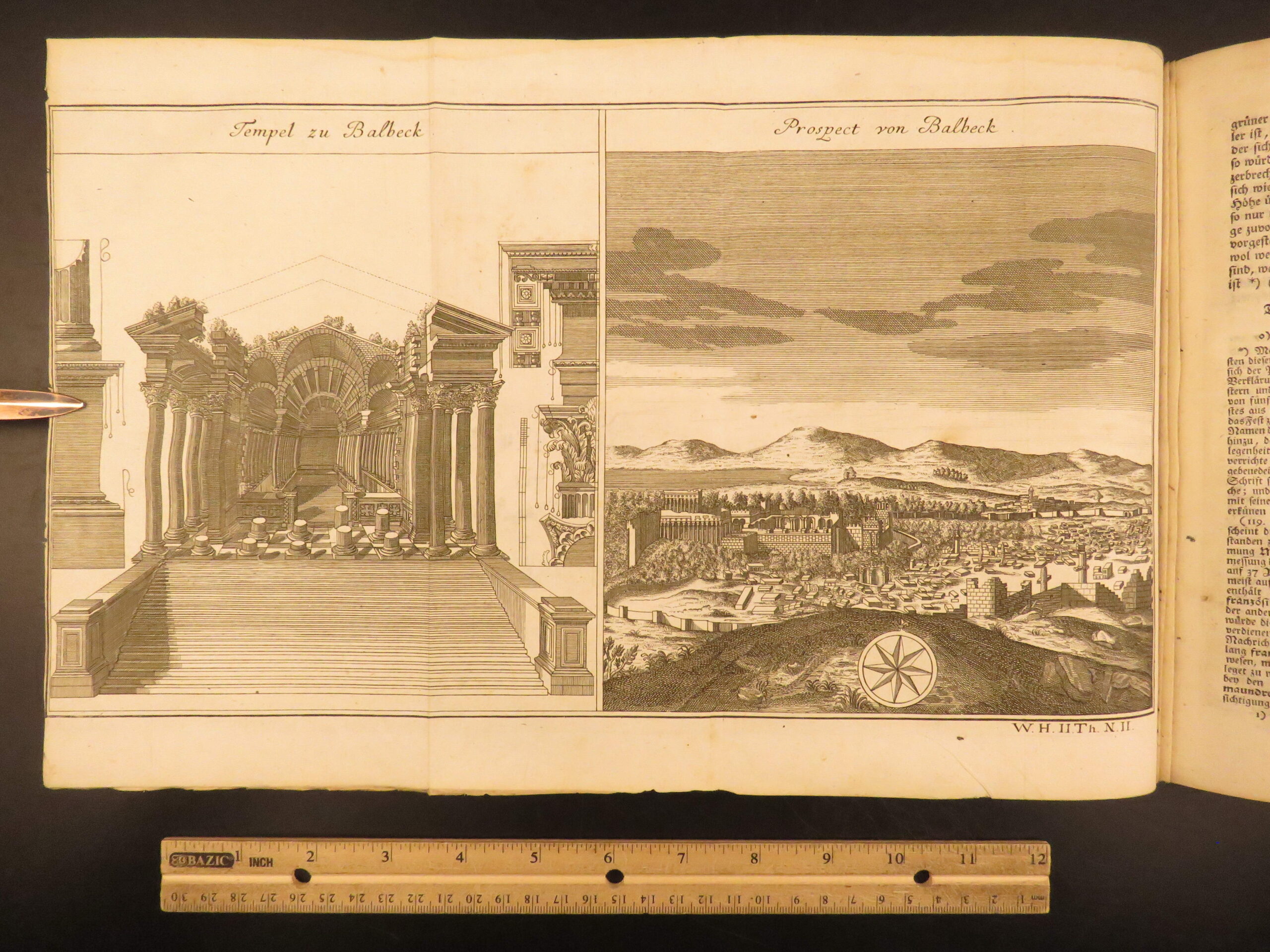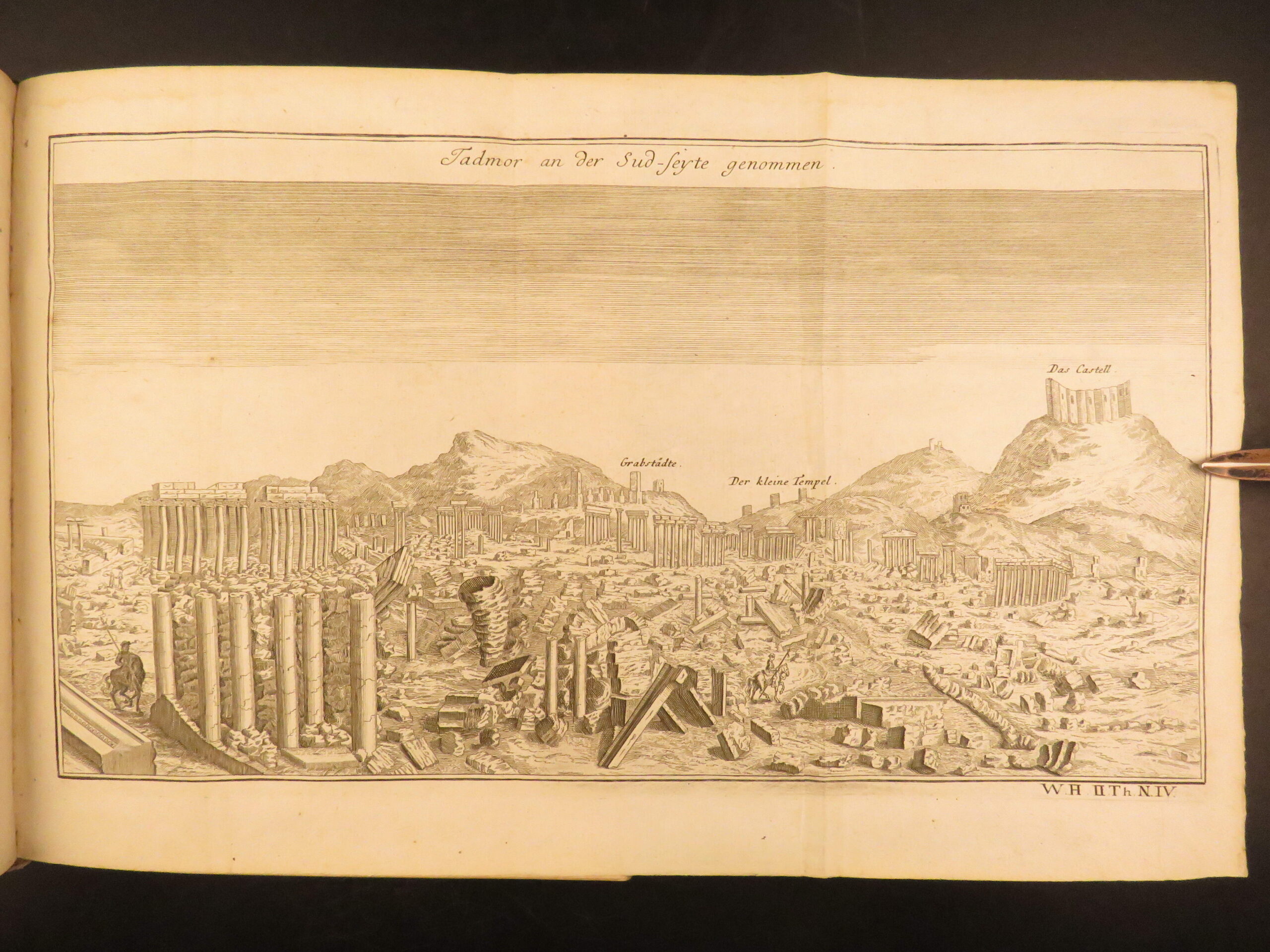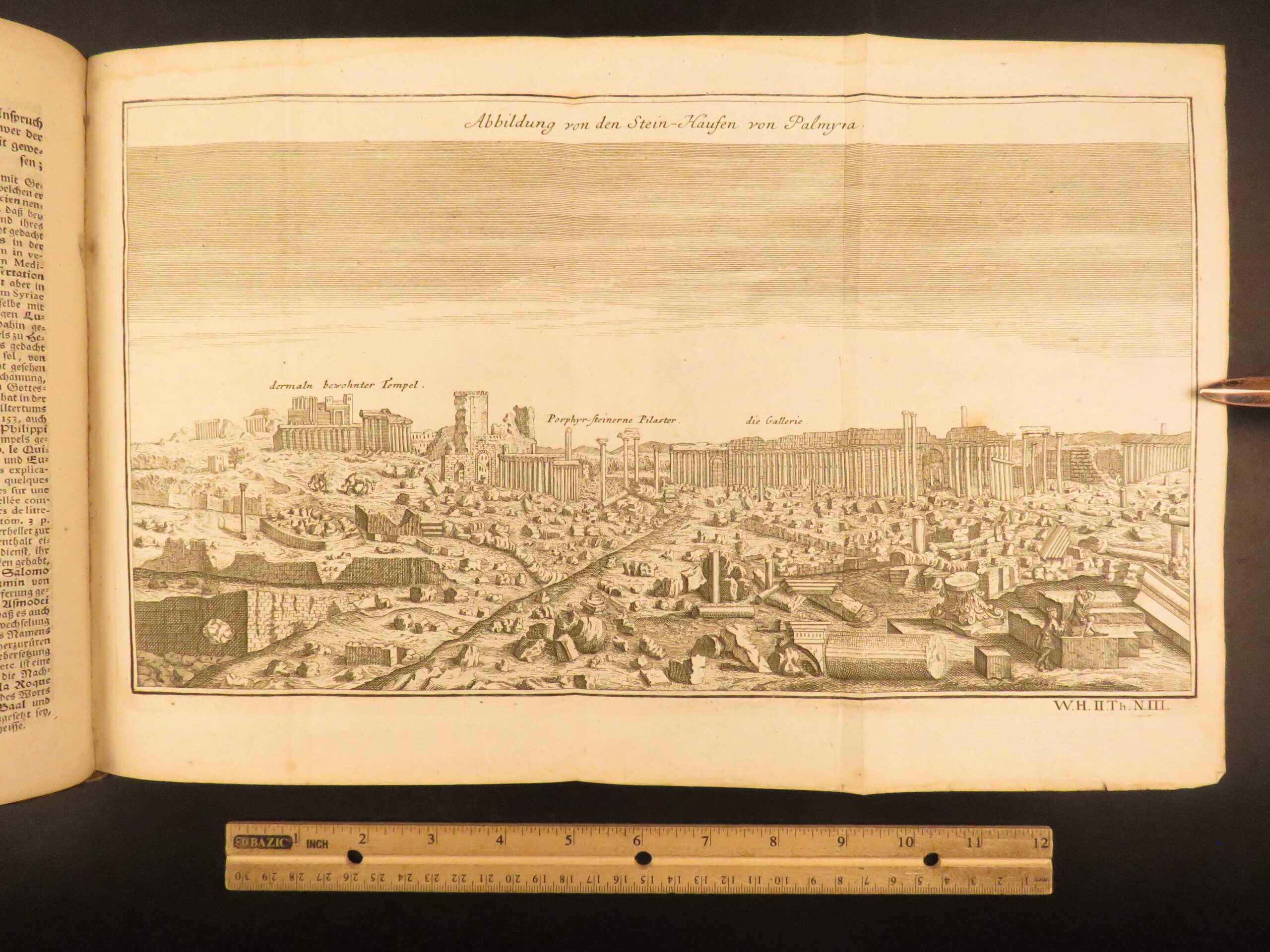The Algemeinen Welthistorie was an 18th-century historical journal collected to provide a complete and thorough history of the world. First edited by Siegmund Baumgarten and later by Johann Semler, this recurring work was a collection of articles by English scholars then translated and edited by Semler and Baumgarten – who Voltaire called ‘the crown of German scholars.’ This volume concentrates on Biblical antiquity and the ancient Near East. Subjects include the Exodus, the peoples of Canaan, Moab, and Ammon, the Temple of Baalbek, the ruins of Palmyra and Tadmor, and the antiquities of Sidon. Additional sections examine the journey of the Israelites toward the Holy Land, the account of manna, and the leadership of Moses. Ten engraved plates accompany the historical study.